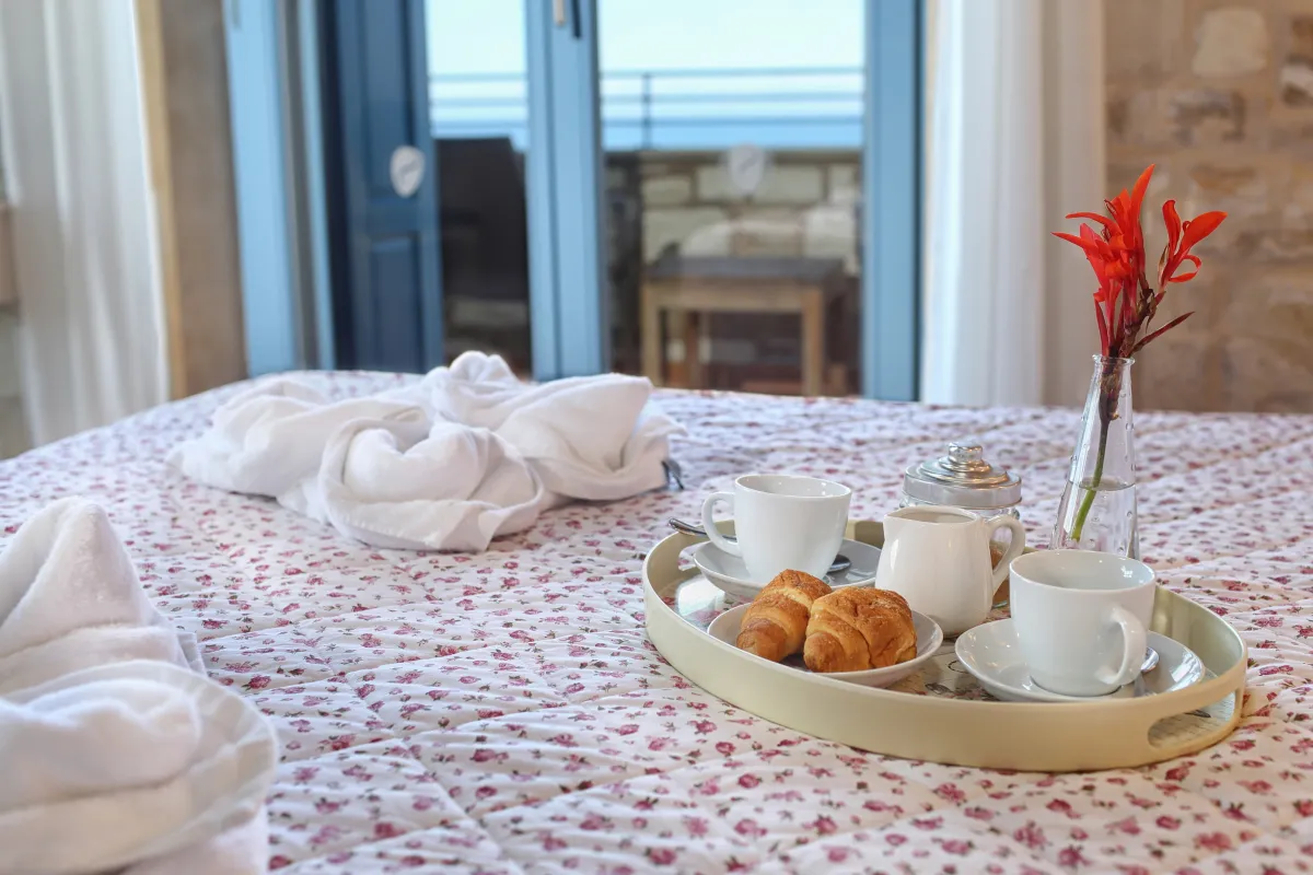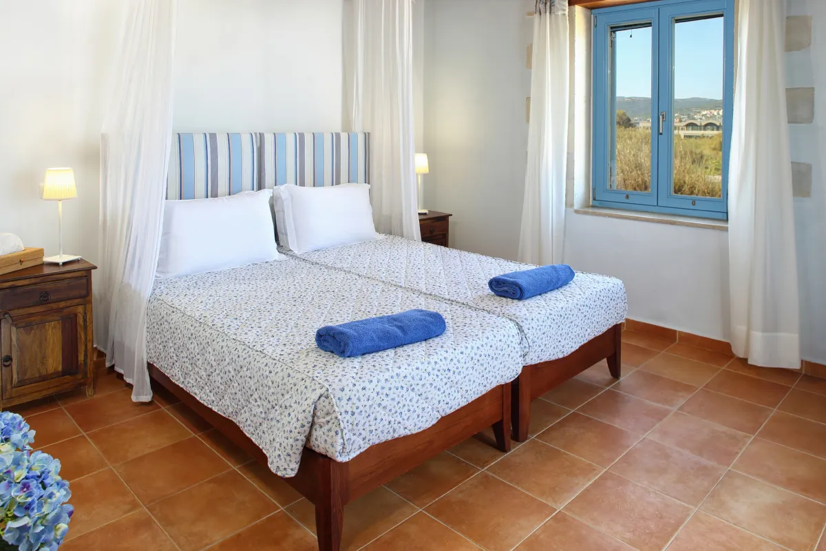 Im Obergeschoss befinden sich 2 Doppelzimmer mit Einrichtung am Meer und schönen großen Türen, die auf eine gemeinsame Terrasse mit Meerblick führen. Beide Schlafzimmer haben ein eigenes Badezimmer. Bettwäsche und Handtücher werden für den Komfort der Gäste bereitgestellt. Die untere Etage verfügt über ein weiteres Schlafzimmer mit Doppelbett sowie ein Schlafsofa und ein weiteres Badezimmer.