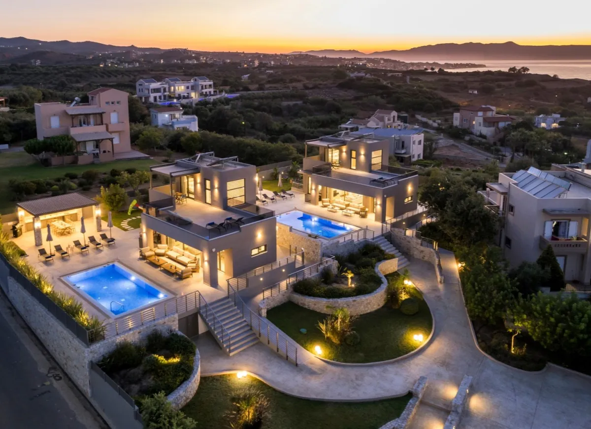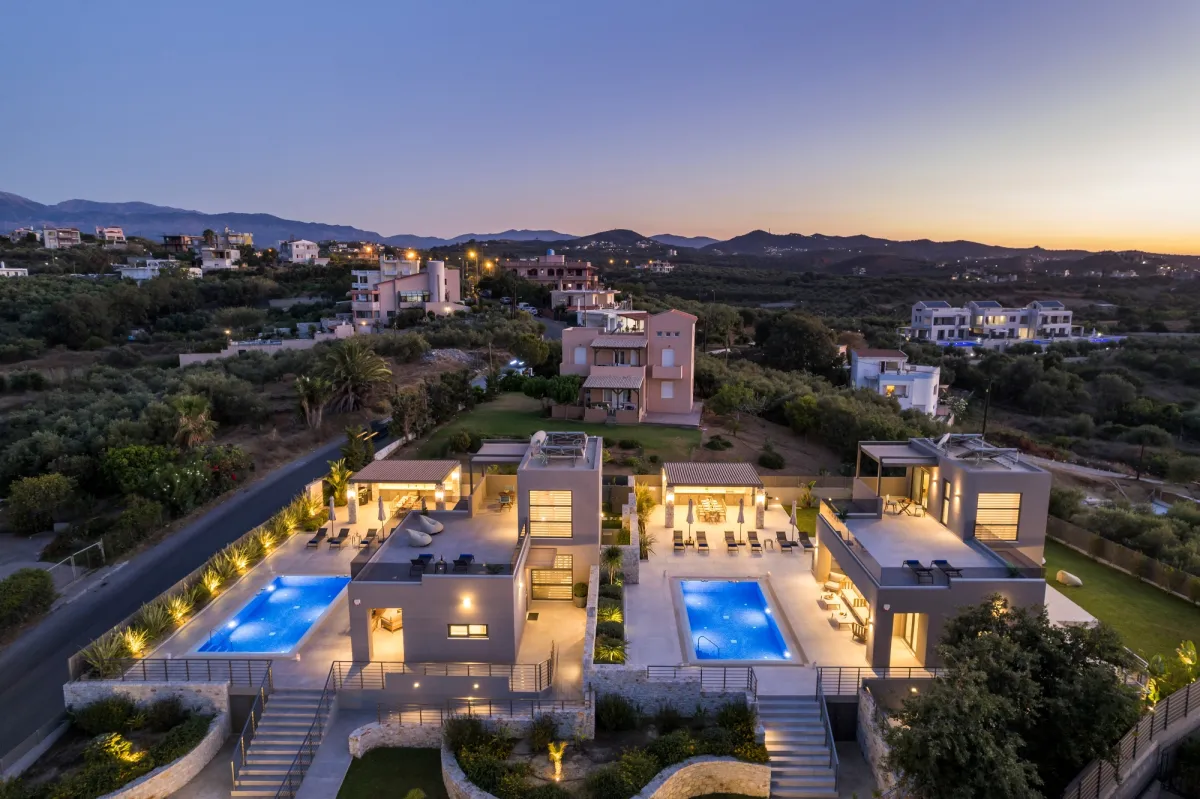 Der Imperium Villas-Komplex, bestehend aus Esperia und Ostria Villa, befindet sich in Kato Galatas, Chania, auf der griechischen Insel Kreta. Das Ferienhaus ist mit luxuriösen, offenen Räumen und eleganten Möbeln und Oberflächen gestaltet, die ihm eine erholsame und dennoch raffinierte Atmosphäre verleihen.