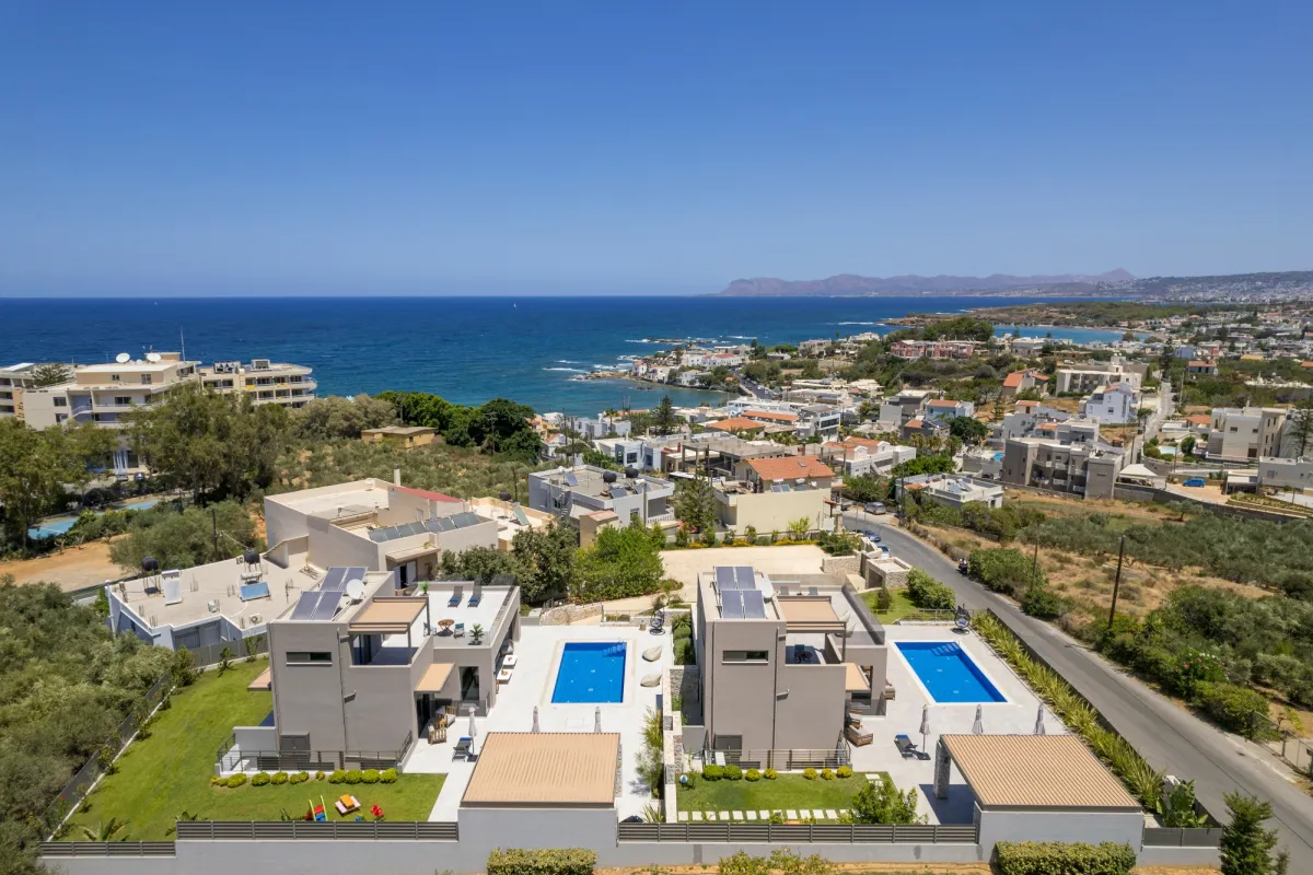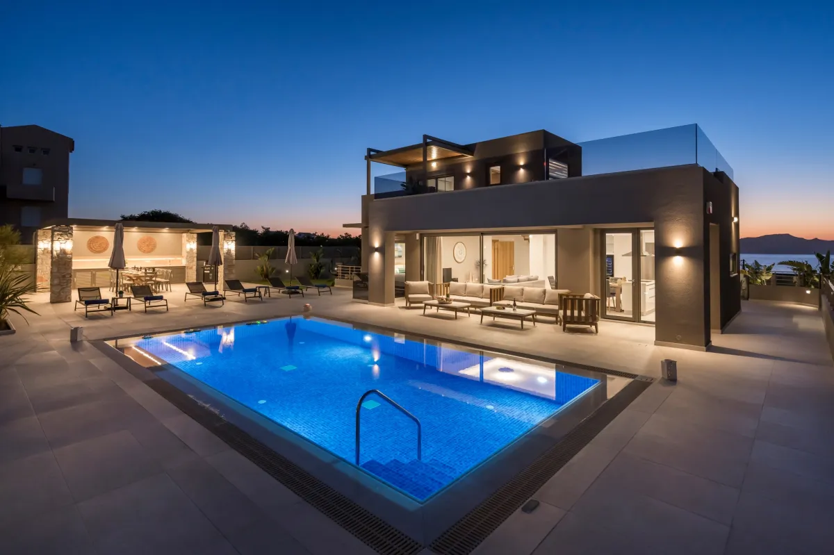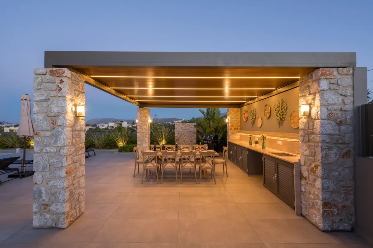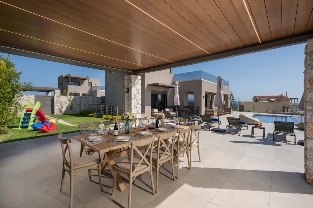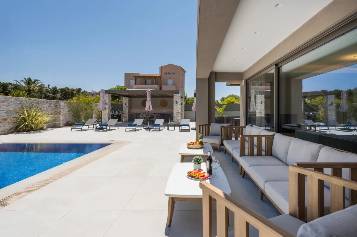 Das ansprechende Äußere jeder Ferienunterkunft bietet einen spektakulären Blick auf die Stadt Chania und die Weißen Berge. Zu den Außenanlagen gehören ein privater Swimmingpool, Sitzgelegenheiten am Pool und im Schatten, eine Außendusche, ein eingebauter Grill und Gasgrill, ein Essbereich im Freien, eine Sauna und ein Whirlpool, ein Kinderspielplatz, ein Fußballtor und Fußbälle sowie Bälle und Hüpfburgen und Tischfußball. Die Villa bietet Garagenparkplätze für 6 Fahrzeuge.