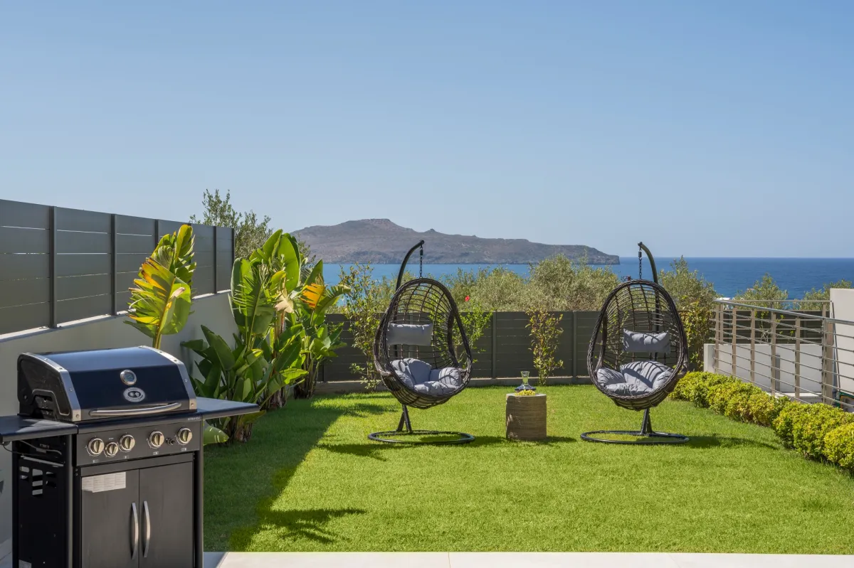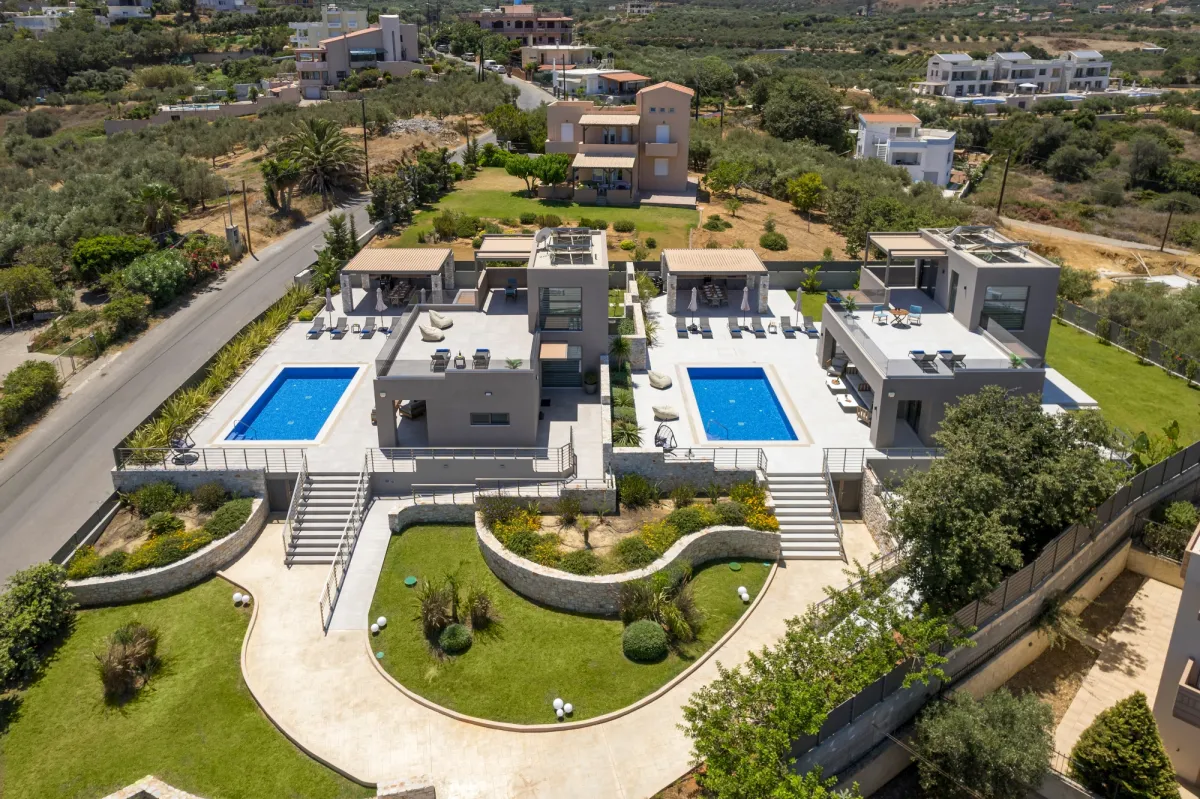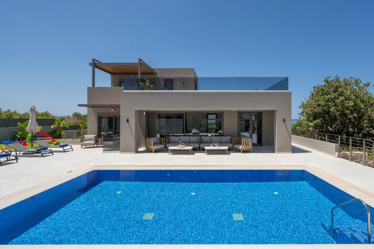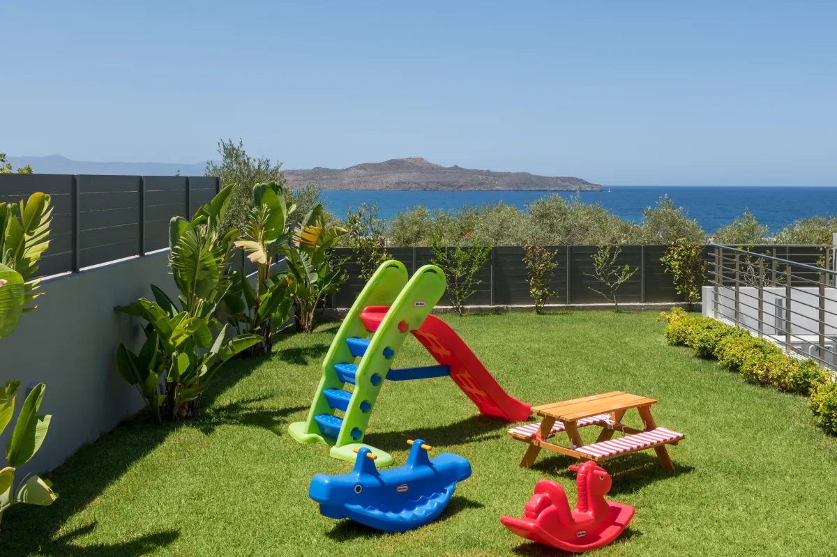 Das ansprechende Äußere jeder Ferienunterkunft bietet einen spektakulären Blick auf die Stadt Chania und die Weißen Berge. Zu den Außenanlagen gehören ein privater Swimmingpool, Sitzgelegenheiten am Pool und im Schatten, eine Außendusche, ein eingebauter Grill und Gasgrill, ein Essbereich im Freien, eine Sauna und ein Whirlpool, ein Kinderspielplatz, ein Fußballtor und Fußbälle sowie Bälle und Hüpfburgen und Tischfußball. Die Villa bietet Garagenparkplätze für 6 Fahrzeuge.