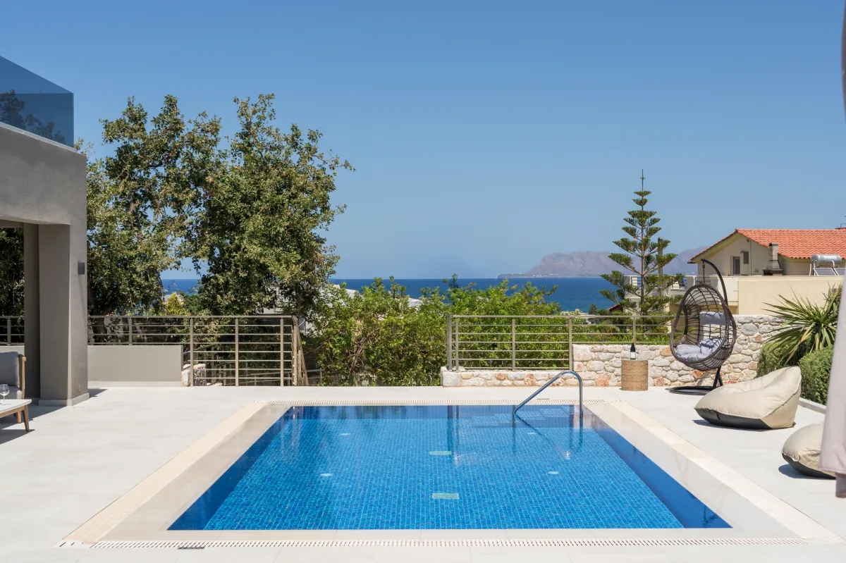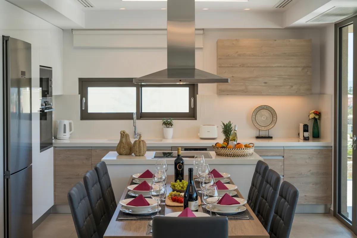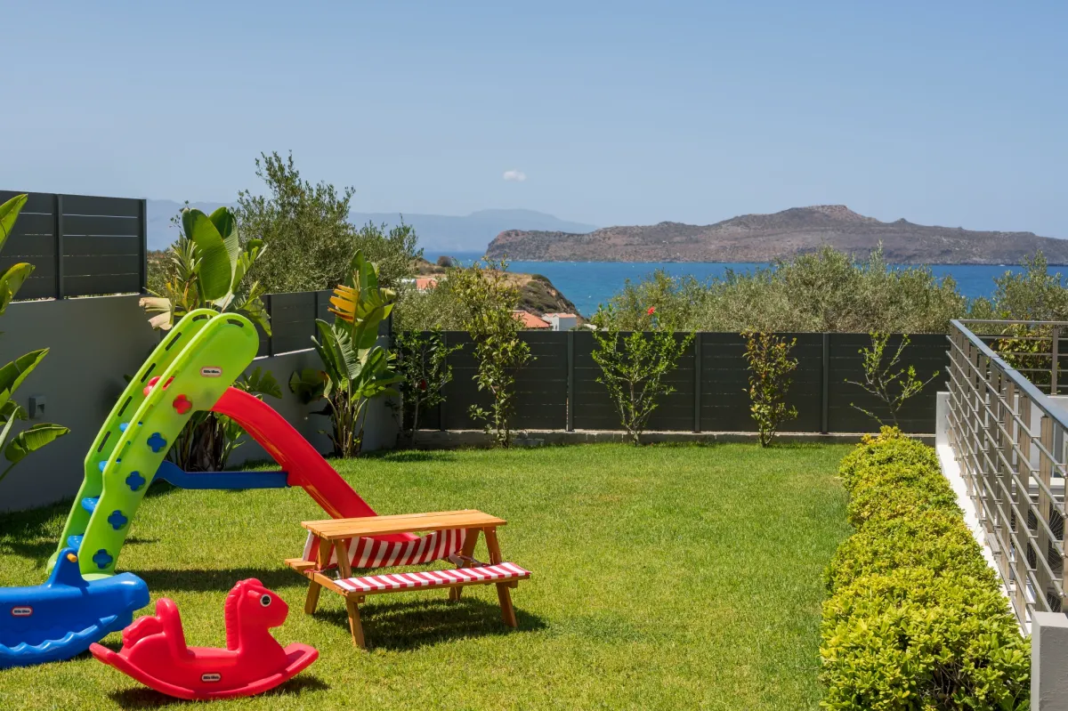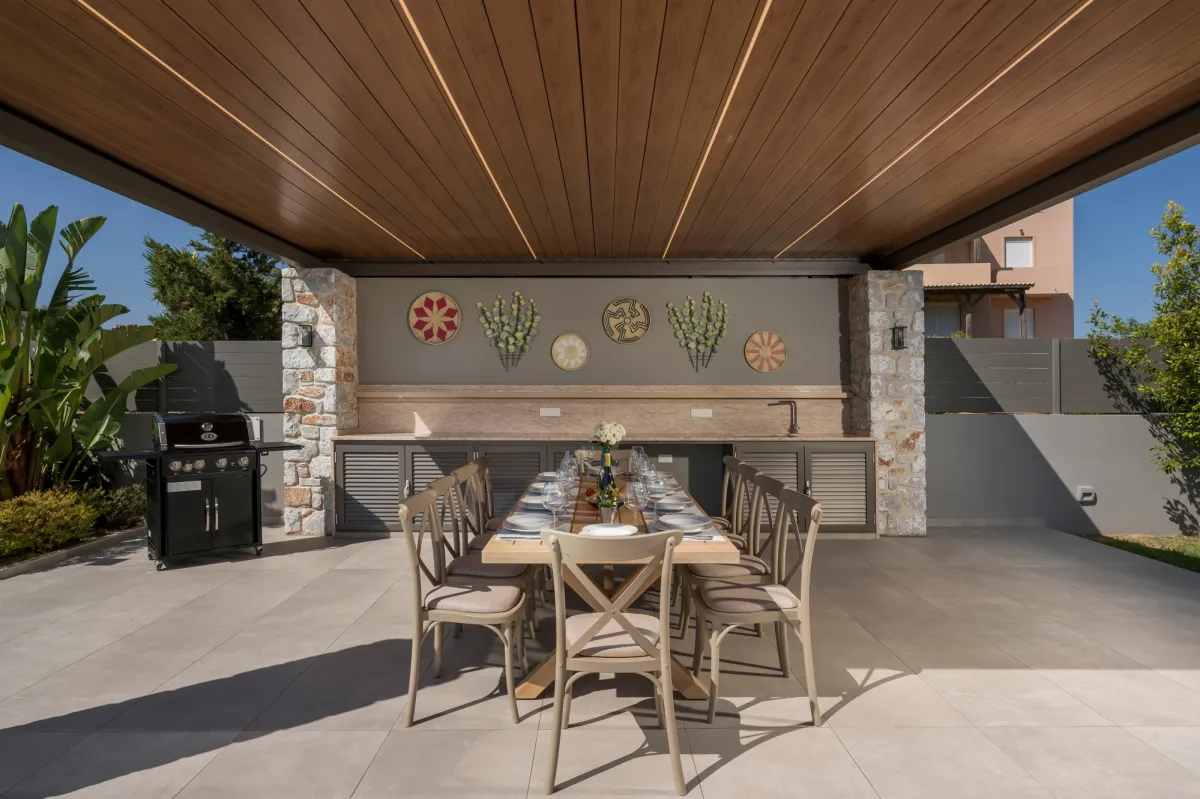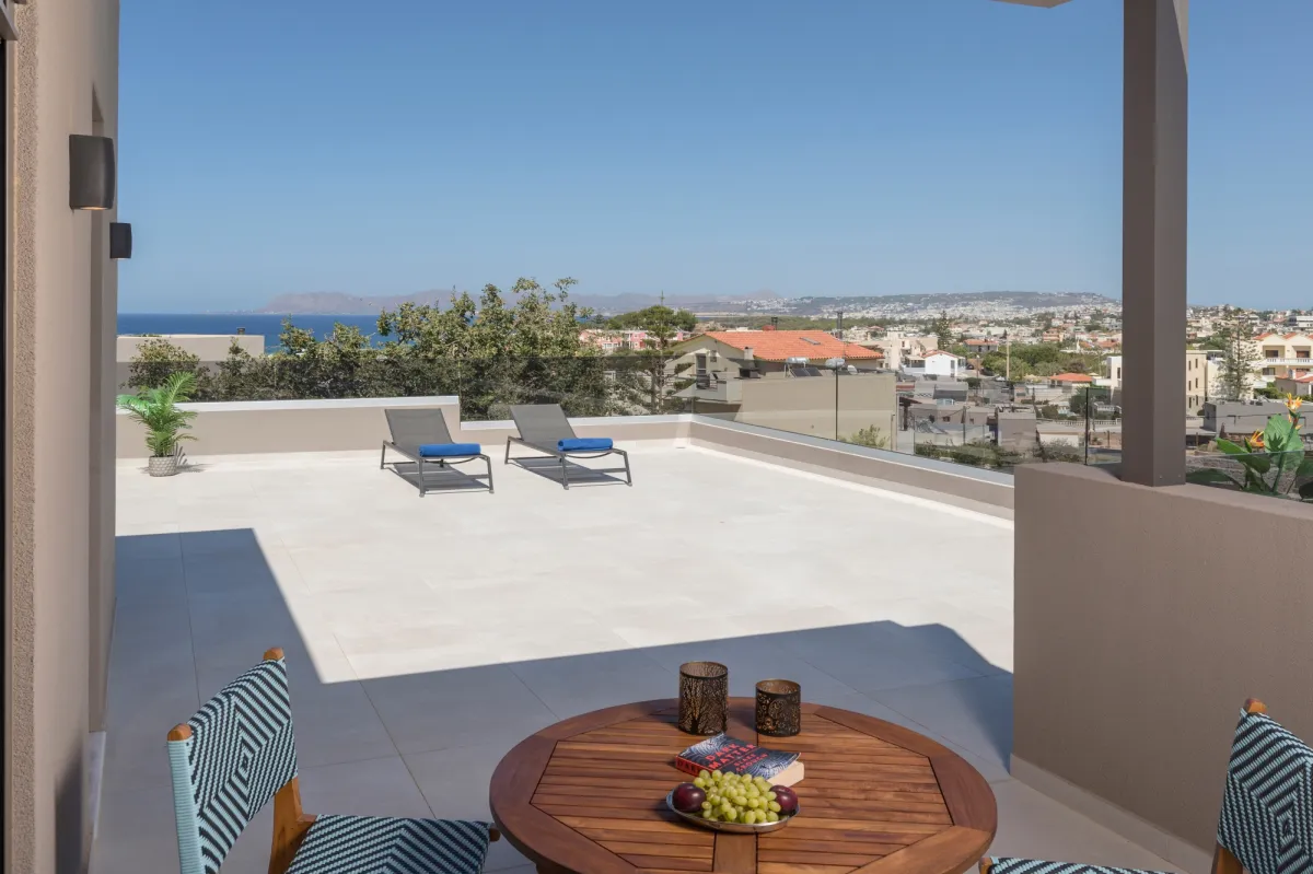 Das ansprechende Äußere jeder Ferienunterkunft bietet einen spektakulären Blick auf die Stadt Chania und die Weißen Berge. Zu den Außenanlagen gehören ein privater Swimmingpool, Sitzgelegenheiten am Pool und im Schatten, eine Außendusche, ein eingebauter Grill und Gasgrill, ein Essbereich im Freien, eine Sauna und ein Whirlpool, ein Kinderspielplatz, ein Fußballtor und Fußbälle sowie Bälle und Hüpfburgen und Tischfußball. Die Villa bietet Garagenparkplätze für 6 Fahrzeuge.