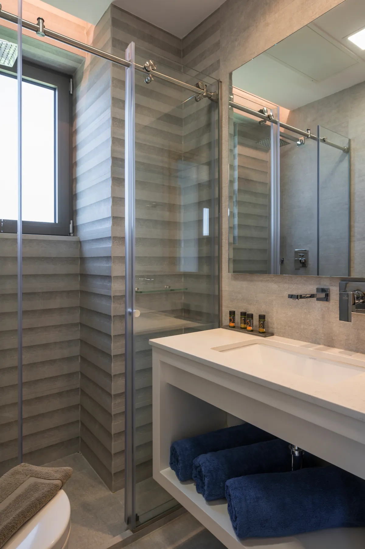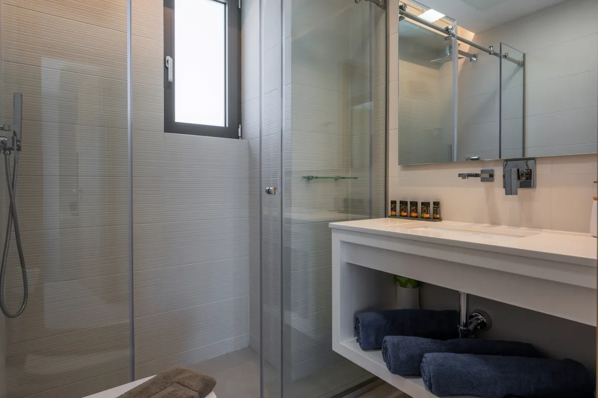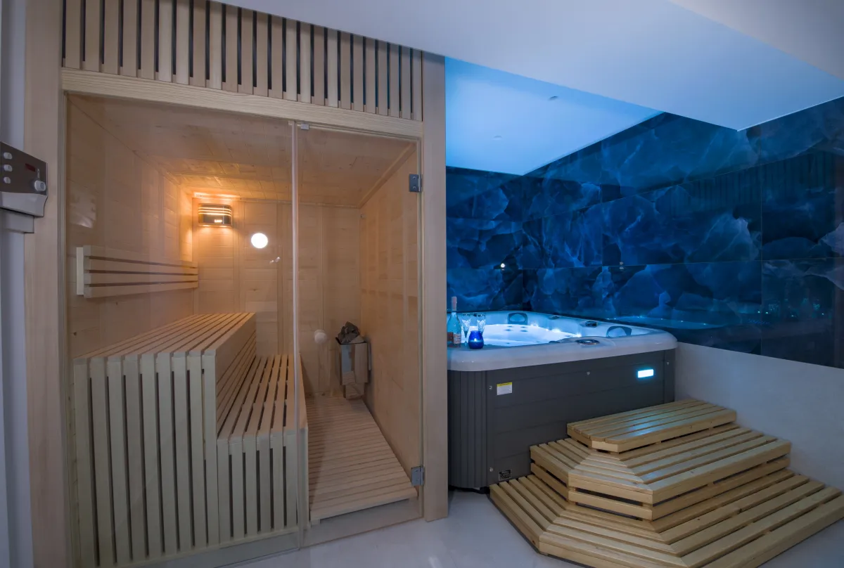 Jede Villa bietet Platz für bis zu 12 Gäste (insgesamt 24), einer von ihnen schläft auf einem Schlafsofa, die anderen in 5 geräumigen und luftigen, lichtdurchfluteten Schlafzimmern. Jedes Schlafzimmer verfügt über ein Kingsize-Bett, Sat-TV, Klimaanlage, Balkon und viel Stauraum. Bei Bedarf gibt es auch ein Babybett. Zwei der Schlafzimmer verfügen über ein eigenes Bad, zwei weitere Badezimmer stehen ebenfalls zur Verfügung. Den Besuchern stehen Haartrockner, Toilettenartikel, Handtücher und Bademäntel zur Verfügung. Darüber hinaus verfügt jede Villa über einen Fitnessraum, eine Sauna und einen Whirlpool.
