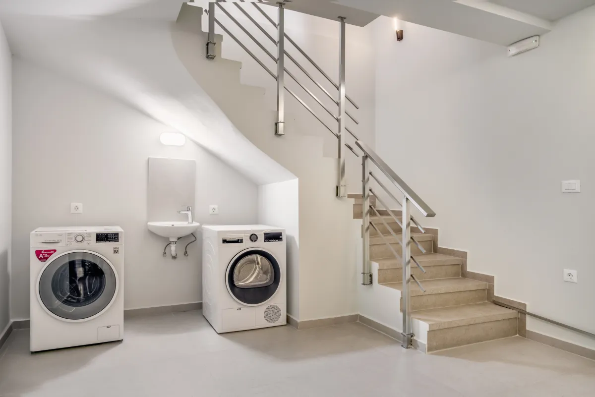 Die moderne Küche ist komplett ausgestattet und verfügt über alle notwendigen Geräte und Annehmlichkeiten, darunter einen 4-Platten-Herd, einen Backofen, einen Geschirrspüler, einen Gefrierschrank, einen Kühlschrank, einen Toaster, eine Mikrowelle, eine Filterkaffeemaschine und eine Nespresso-Kaffeemaschine. Im Untergeschoss der Villa befinden sich eine Waschküche und ein Spielzimmer.