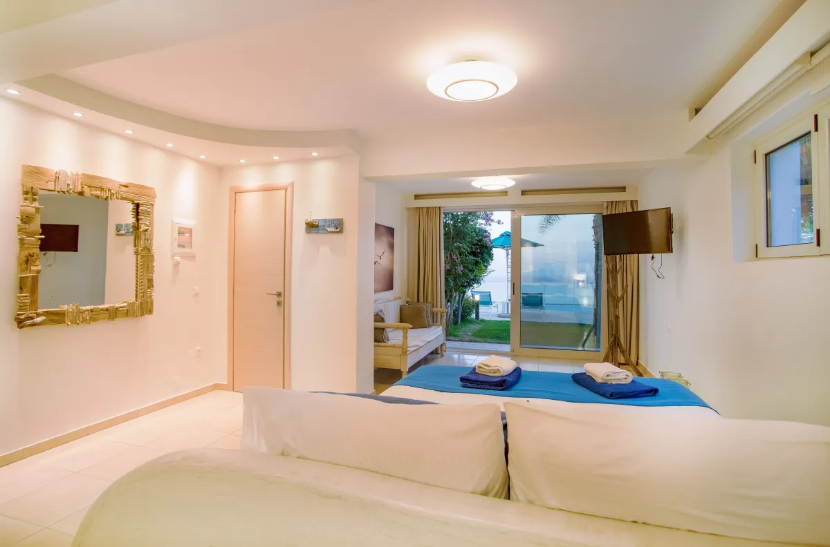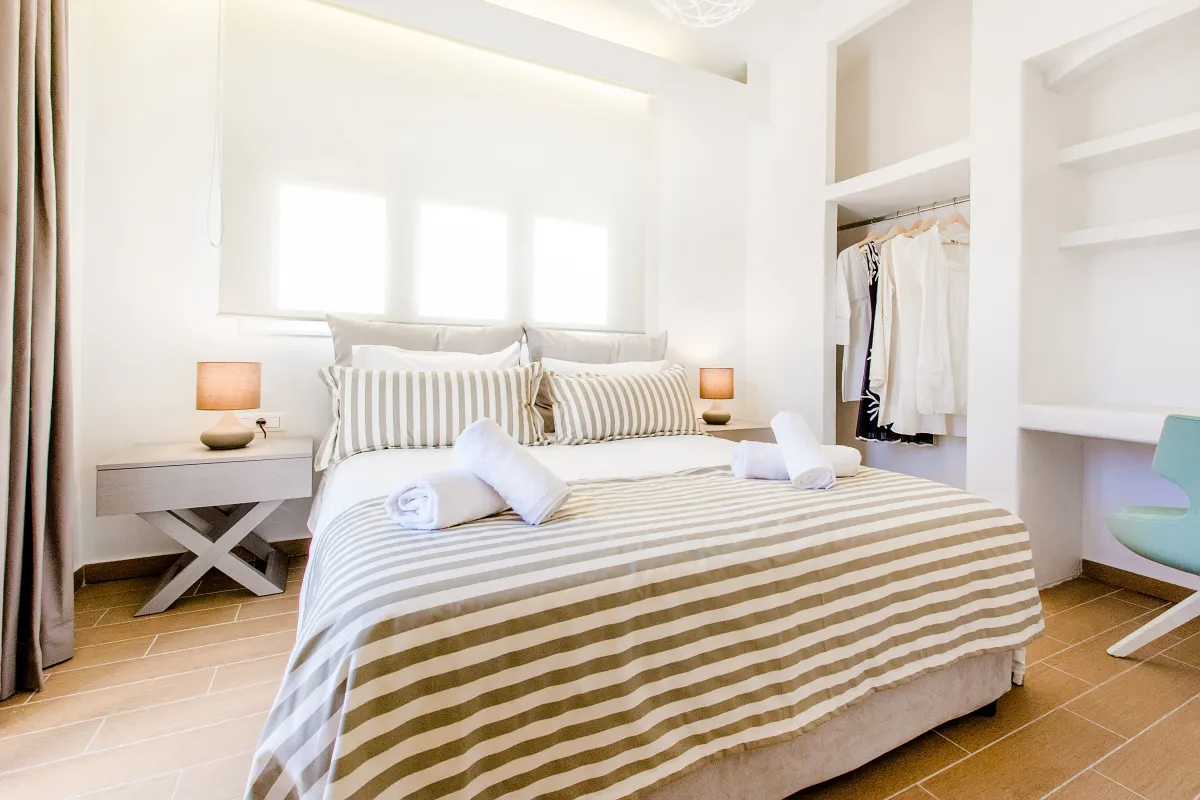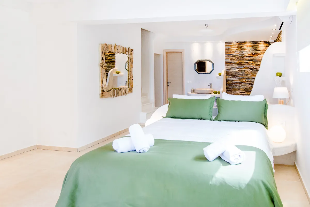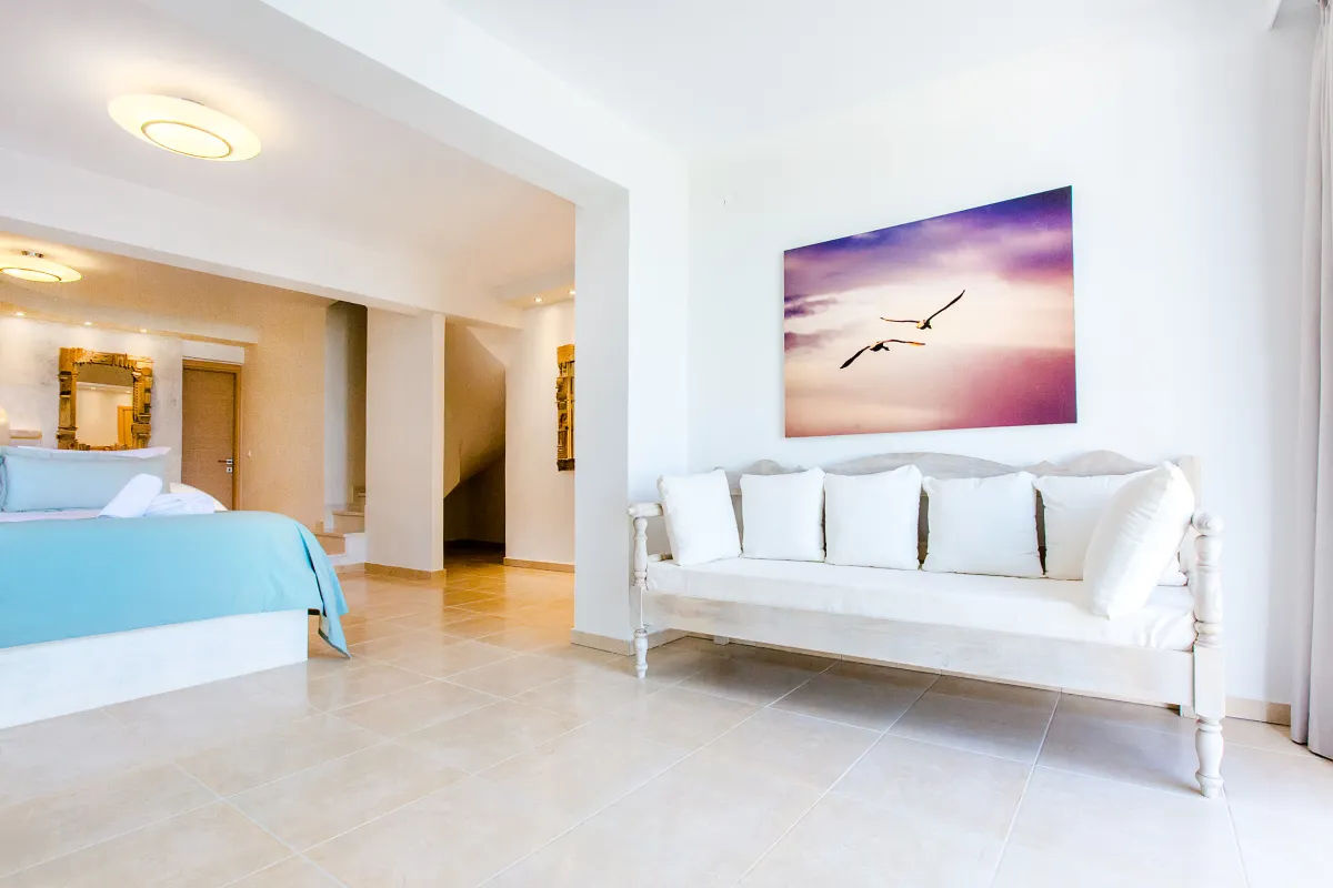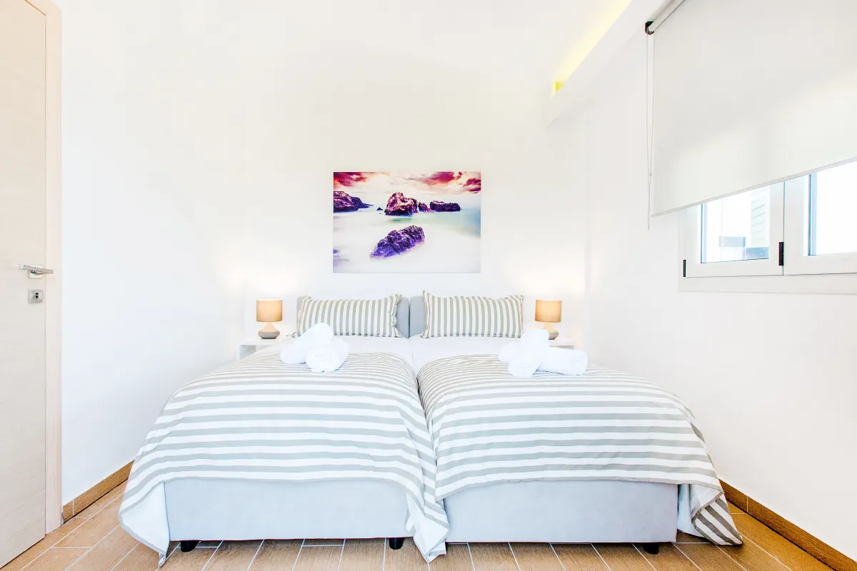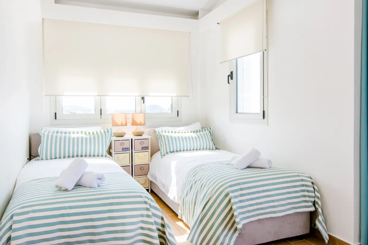 Die zweite Etage erreichen Sie über ein paar Stufen, wo sich 2 Badezimmer und 4 lichtdurchflutete Schlafzimmer mit zeitgemäßer Einrichtung und hochmodernen Betten für vollkommene Ruhe und Entspannung befinden. Sie verfügen alle über möblierte Balkone und bieten einen atemberaubenden Blick auf das Meer und die umliegende Landschaft für unbeschwerte Stunden und den romantischen Genuss der Farben des Sonnenuntergangs am Ende des Tages. WLAN, Klimaanlage und Fußbodenheizung sind im ganzen Haus verfügbar.