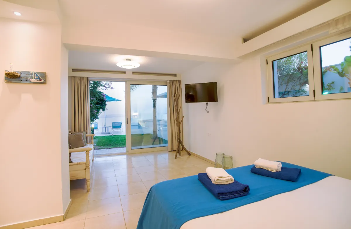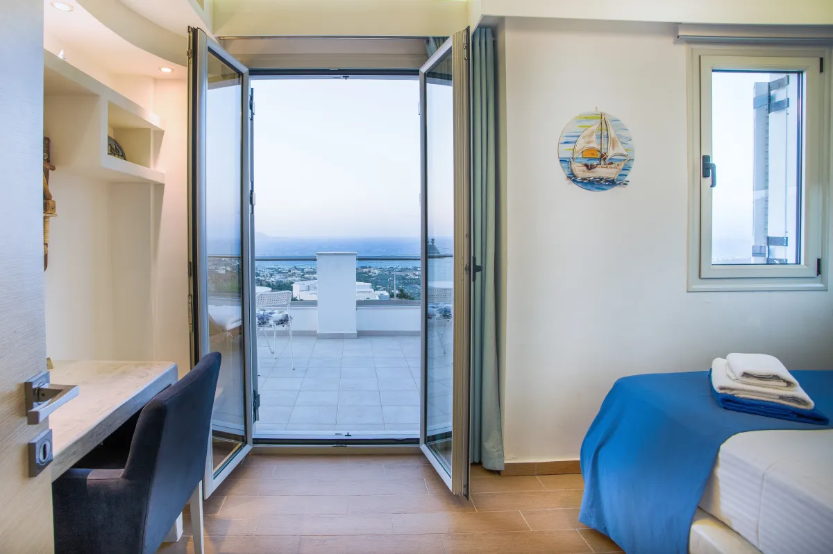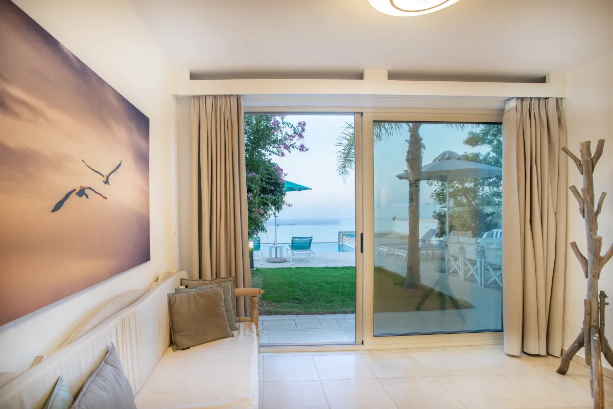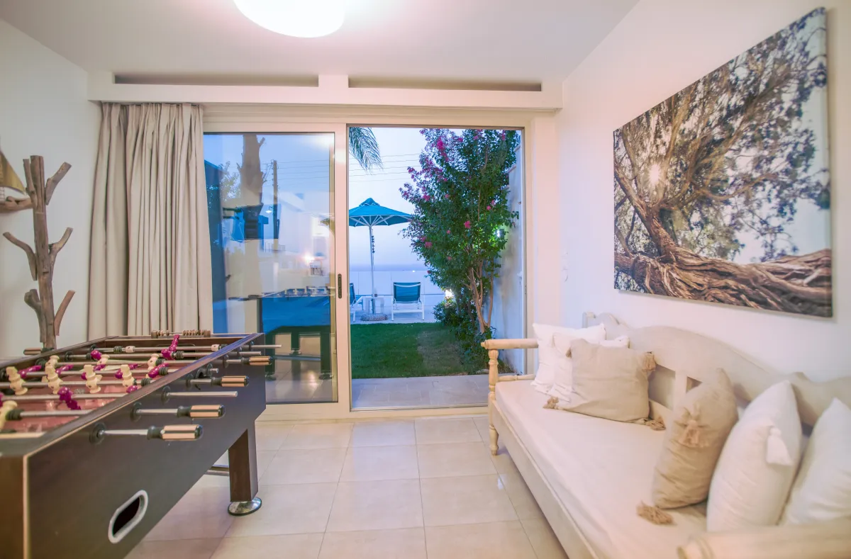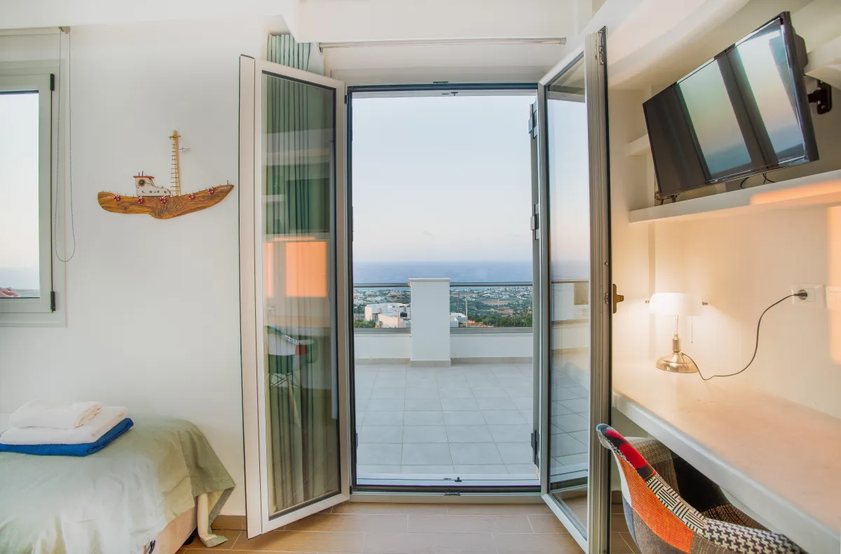 Italienische Küche, komplett mit einem Korian-Sitz und direktem Zugang zu einer geräumigen, möblierten Terrasse mit endlosem Blick auf das kretische Meer, befindet sich auf der Etage mit einem offenen Wohnbereich, einem Esszimmer, zwei WCs und einer Küche.