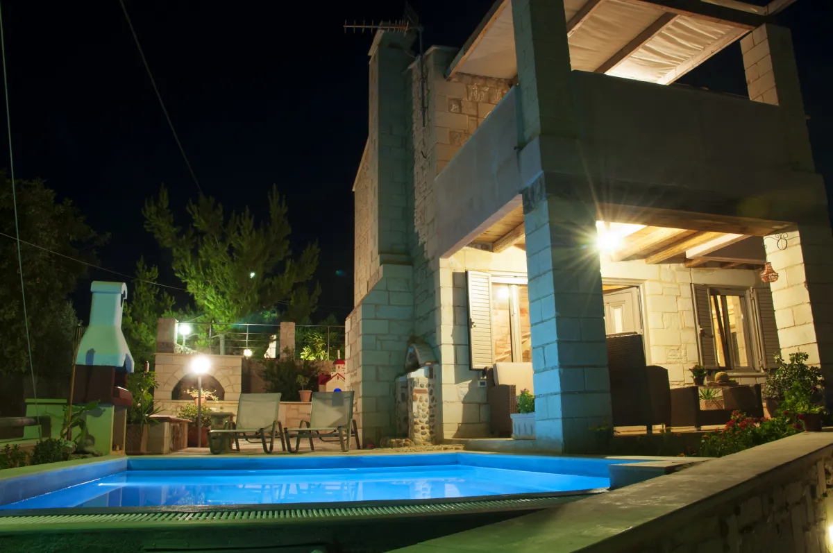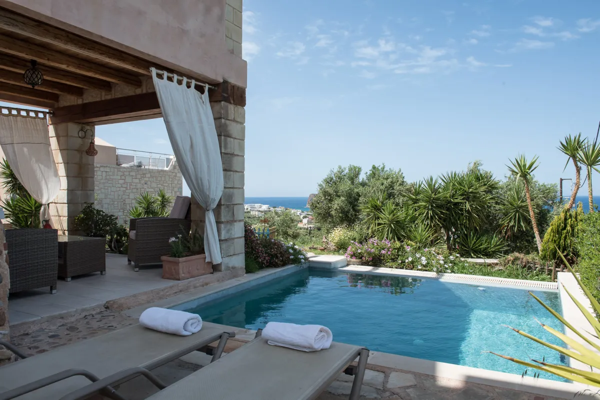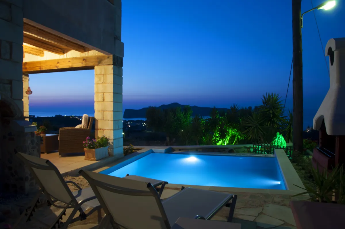 Positioned on a hillside on the outskirts of Chania, overlooking the cosmopolitan resort of Agia Marina, this villa calls to ease back into the lounger or wade into the pool to catch the incredible sunset or put on that fabulous summer outfit for a night out in Chania.