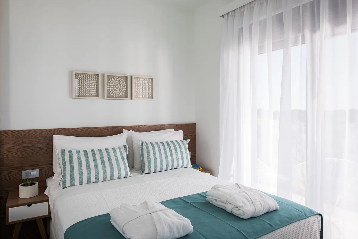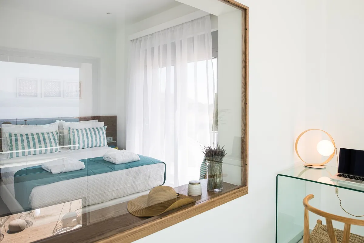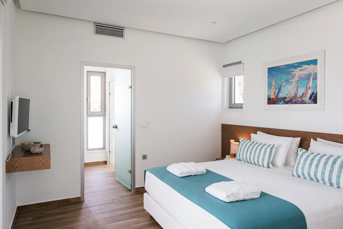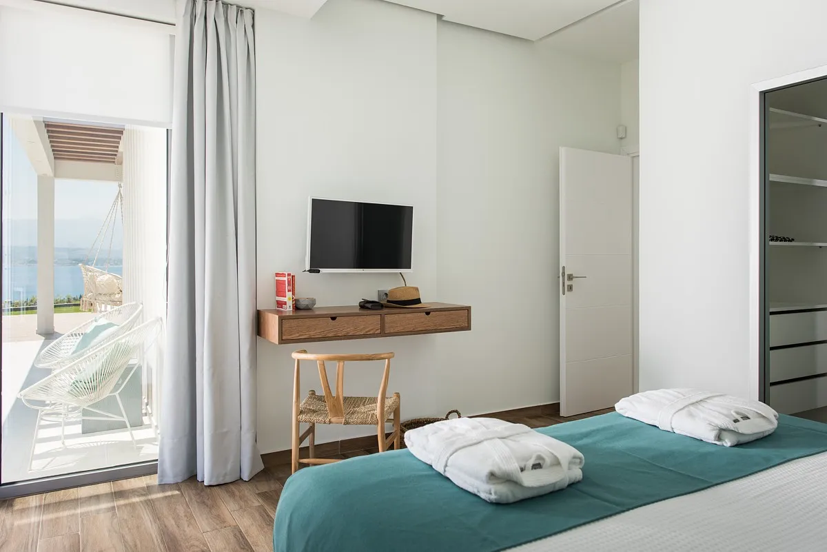 The Aleria villa has 4 deluxe bedrooms, 3 of them ensuite. Each bedroom is furnished with comfortable beds and fresh, stylish linens, as well as satellite TV and safe boxes. Each bedroom also has a private terrace with a sitting area and a separately-controlled A/C system. The 4 bathrooms (1 separate from the bedroom) are fully equipped and offer fresh towels and complimentary toiletries for the guests’ use. There is also an office at the villa accommodation and a well-equipped with its own bathroom facilities.