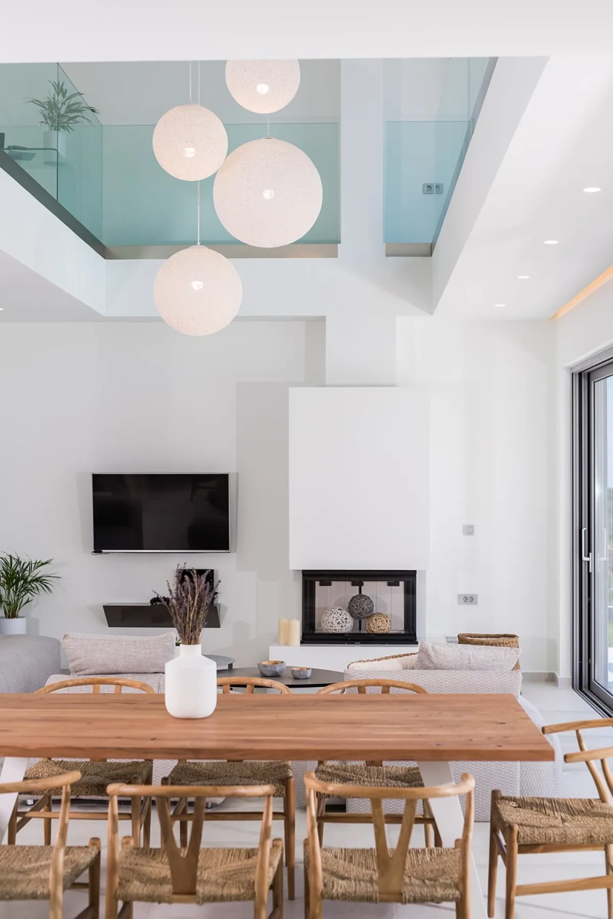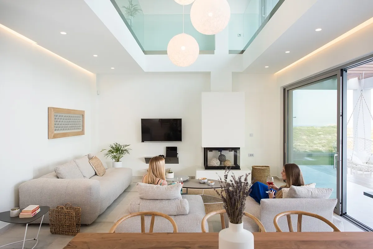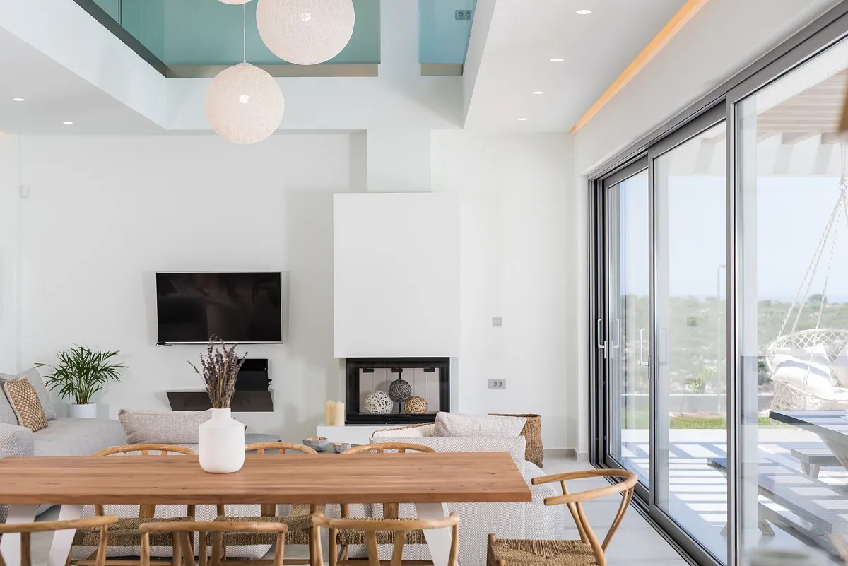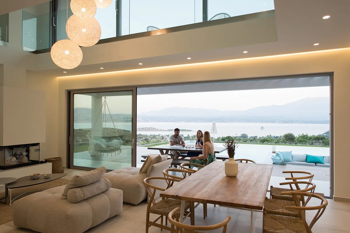 The Aleria luxury villa’s living room is spacious and tastefully decorated with comfortable, contemporary seating and entertainment facilities including 49-inch 4K satellite TV, a sound system, and a PlayStation 4. There is also a three-sided fireplace serving the open-plan living and dining area. The sleek and sophisticated kitchen features a dishwasher, kettle, toaster, oven, Nespresso coffee machine, microwave oven, and refrigerator.