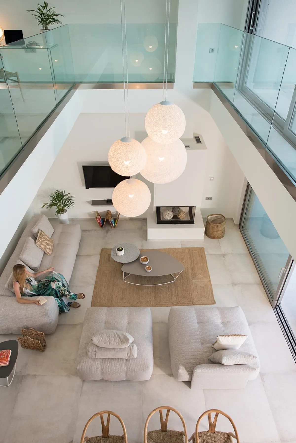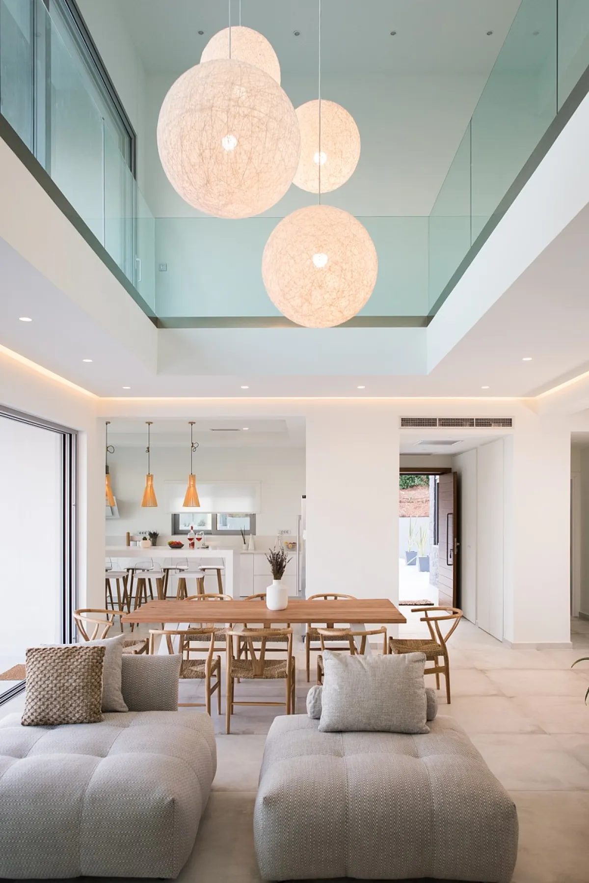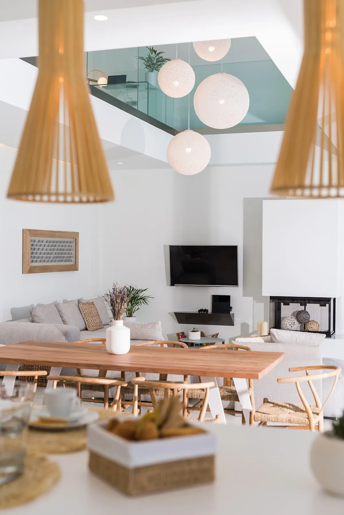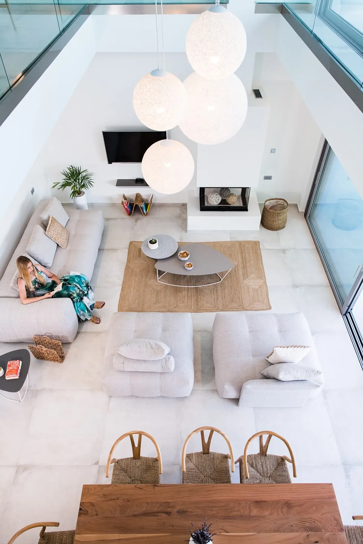 The Aleria luxury villa’s living room is spacious and tastefully decorated with comfortable, contemporary seating and entertainment facilities including 49-inch 4K satellite TV, a sound system, and a PlayStation 4. There is also a three-sided fireplace serving the open-plan living and dining area. The sleek and sophisticated kitchen features a dishwasher, kettle, toaster, oven, Nespresso coffee machine, microwave oven, and refrigerator.