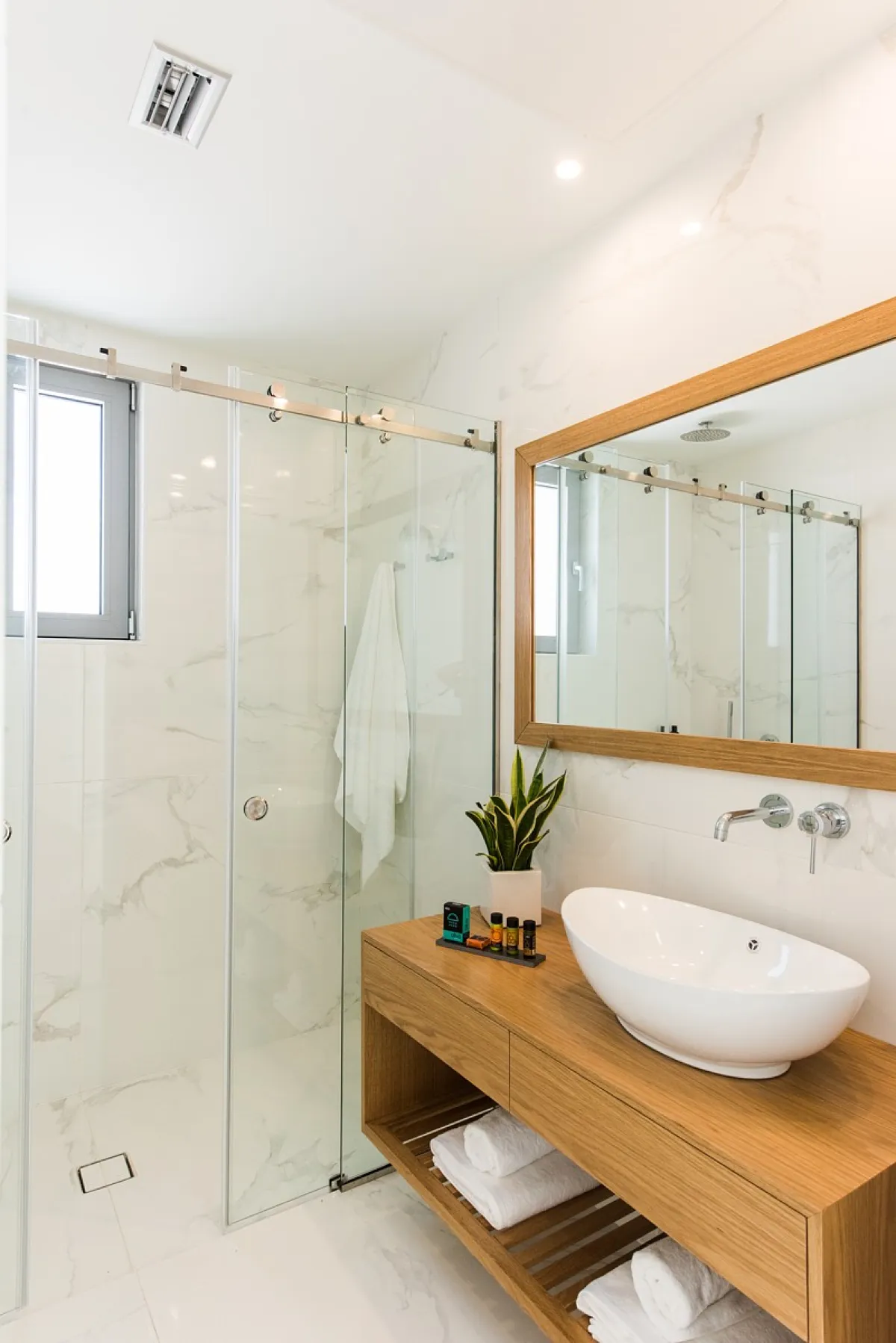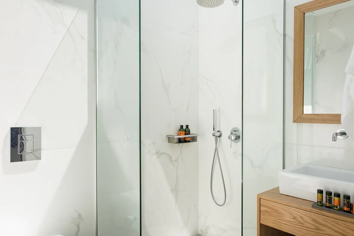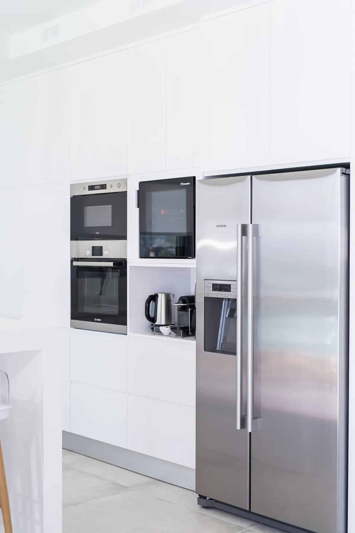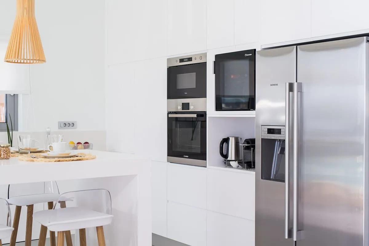 The Aleria luxury villa’s living room is spacious and tastefully decorated with comfortable, contemporary seating and entertainment facilities including 49-inch 4K satellite TV, a sound system, and a PlayStation 4. There is also a three-sided fireplace serving the open-plan living and dining area. The sleek and sophisticated kitchen features a dishwasher, kettle, toaster, oven, Nespresso coffee machine, microwave oven, and refrigerator.