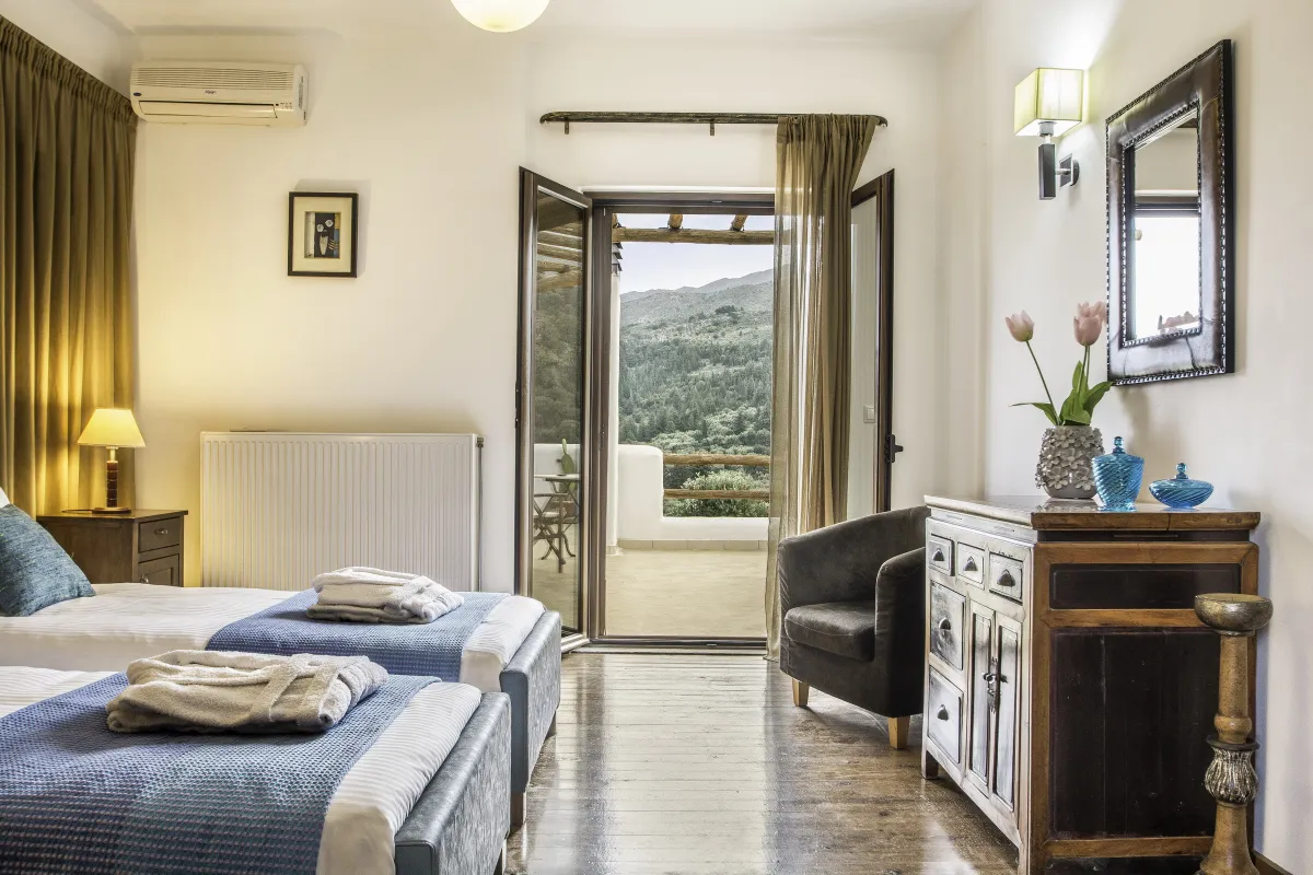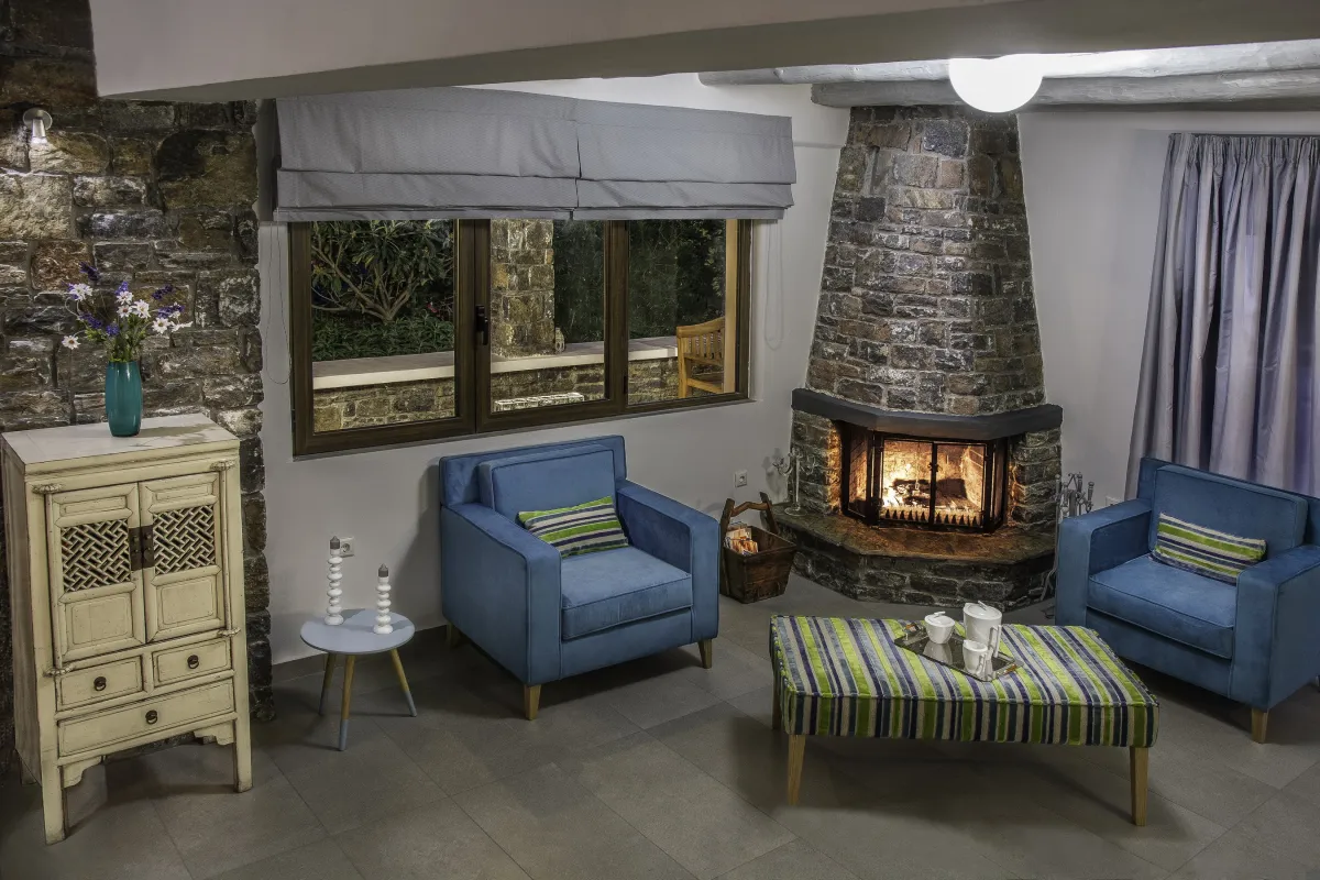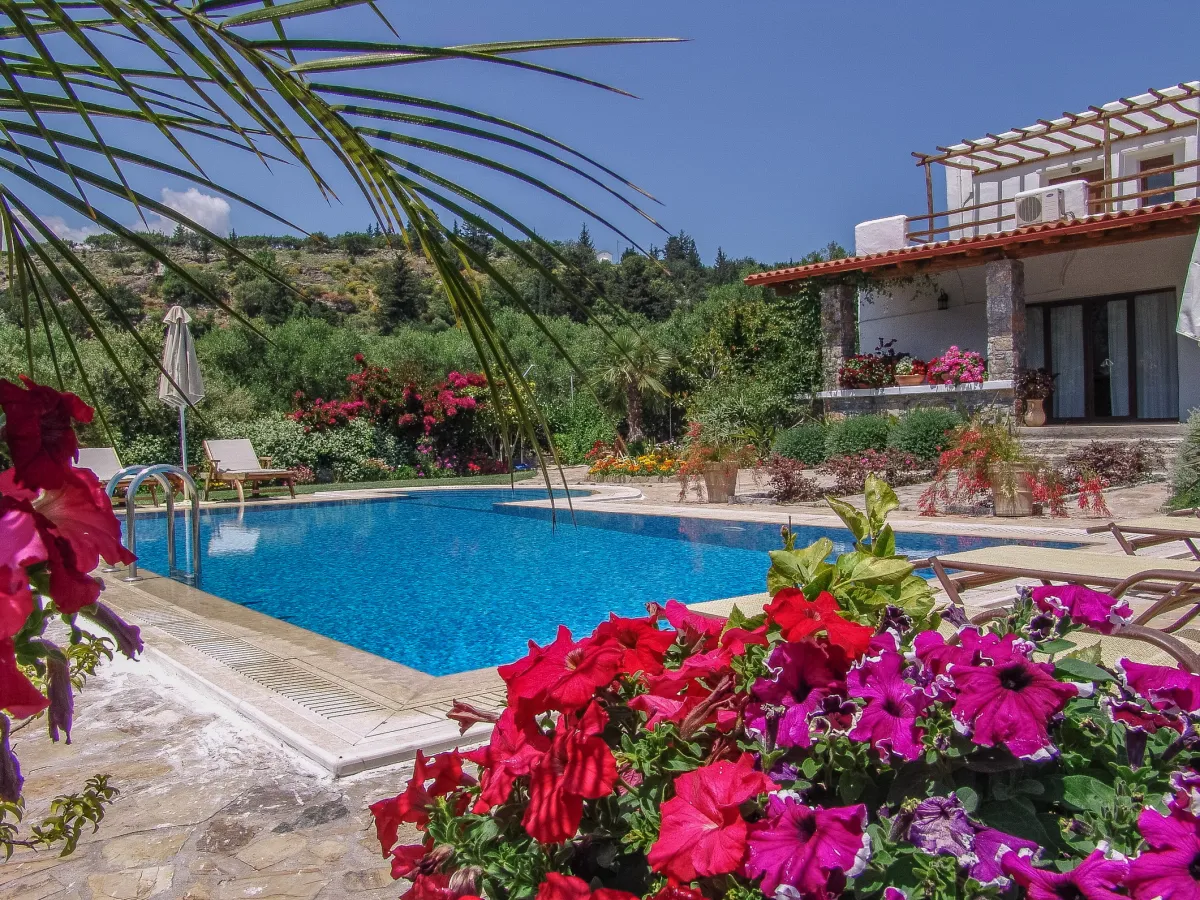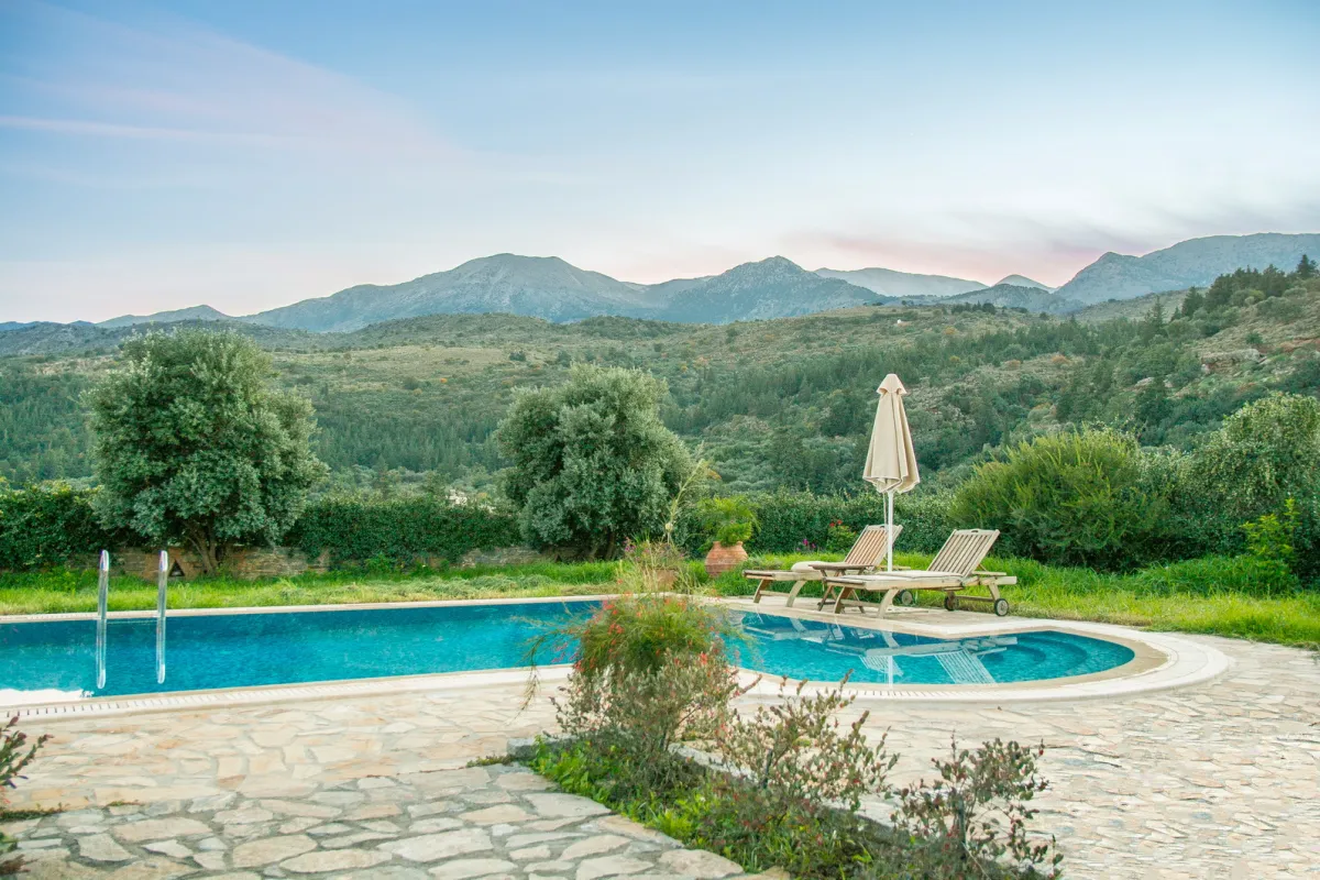 Kalithea Chania Villa is a nice well-maintained vacation villa with beautiful views of the surrounding hills, ideal for a relaxing holiday in Apokoronas, Crete. This pretty holiday property can sleep up to 6 people comfortably in 3 bedrooms, each with its own en-suite bathroom (for more people, prior arrangement is necessary). Hidden away from any indiscrete eyes, the only sound that might disturb the visitor is the song of the birds. Use your here stay to enjoy calm and relaxation for grown-ups and endless games and playing for children and teenagers with safety. The 200 m2 and two levels of the villa are tastefully decorated, and equipped to cover all the needs a guest would need. On the ground floor, there is an open space for a fully equipped kitchen to prepare meals using local produce, a living room with a dining table and a fireplace to take advantage for winter escapes. Kalithea Chania Villa is able to provide you with all the necessary facilities, so you can enjoy the magic and the warmth and comfort of winter in a small rustic village in the heart of Cretan nature. The outdoor area is attached to the natural environment offered a green clad environment with an iridescent swimming pool, and a large shaded patio. For your pleasure, on the terrace there is a barbecue grill and a patio, where dining with friends and family is a huge part of the Cretan culture. After a busy day of sightseeing, heat up the barbecue for dinner at the al-fresco table or have a glass of local wine beside the pool. From a lounger on the terrace by the pool you can watch the sun move across the landscape, relax walking around the garden, or let your senses leading you to explore the trees, the flowers, and the aromatic herbs that give off scents on warm summer days.