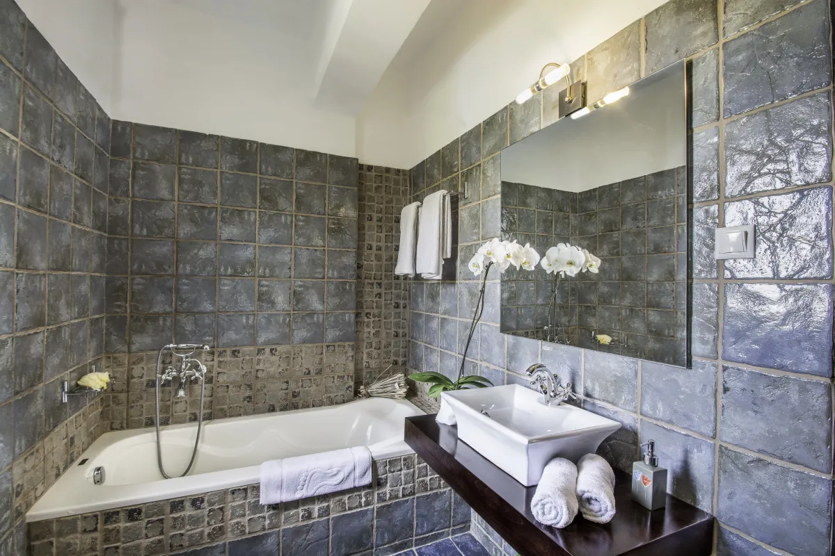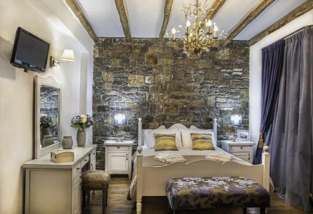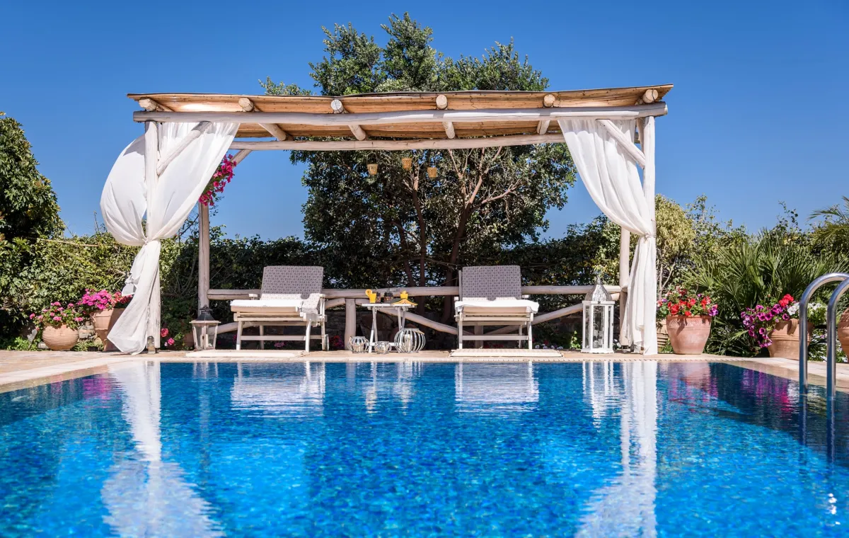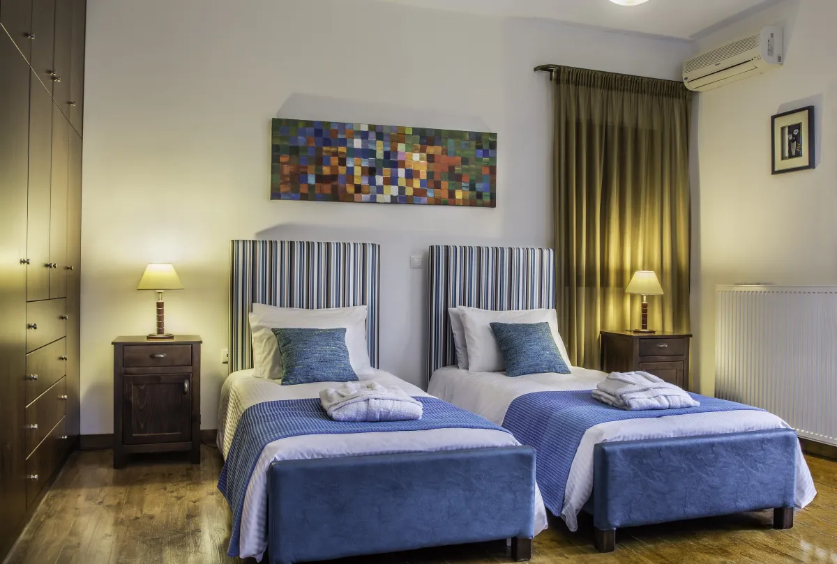 Kalithea Chania Villa is a nice well-maintained vacation villa with beautiful views of the surrounding hills, ideal for a relaxing holiday in Apokoronas, Crete. This pretty holiday property can sleep up to 6 people comfortably in 3 bedrooms, each with its own en-suite bathroom (for more people, prior arrangement is necessary). Hidden away from any indiscrete eyes, the only sound that might disturb the visitor is the song of the birds. Use your here stay to enjoy calm and relaxation for grown-ups and endless games and playing for children and teenagers with safety. The 200 m2 and two levels of the villa are tastefully decorated, and equipped to cover all the needs a guest would need. On the ground floor, there is an open space for a fully equipped kitchen to prepare meals using local produce, a living room with a dining table and a fireplace to take advantage for winter escapes. Kalithea Chania Villa is able to provide you with all the necessary facilities, so you can enjoy the magic and the warmth and comfort of winter in a small rustic village in the heart of Cretan nature. The outdoor area is attached to the natural environment offered a green clad environment with an iridescent swimming pool, and a large shaded patio. For your pleasure, on the terrace there is a barbecue grill and a patio, where dining with friends and family is a huge part of the Cretan culture. After a busy day of sightseeing, heat up the barbecue for dinner at the al-fresco table or have a glass of local wine beside the pool. From a lounger on the terrace by the pool you can watch the sun move across the landscape, relax walking around the garden, or let your senses leading you to explore the trees, the flowers, and the aromatic herbs that give off scents on warm summer days.