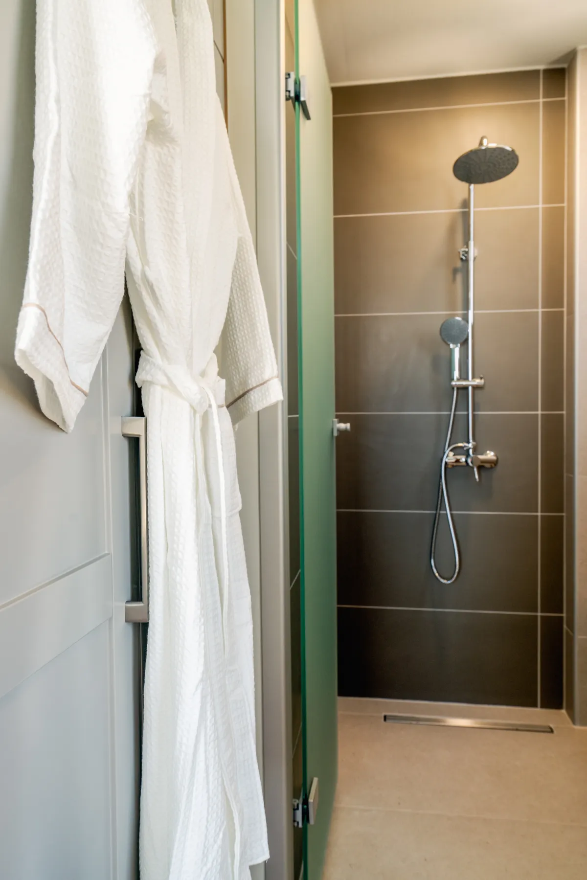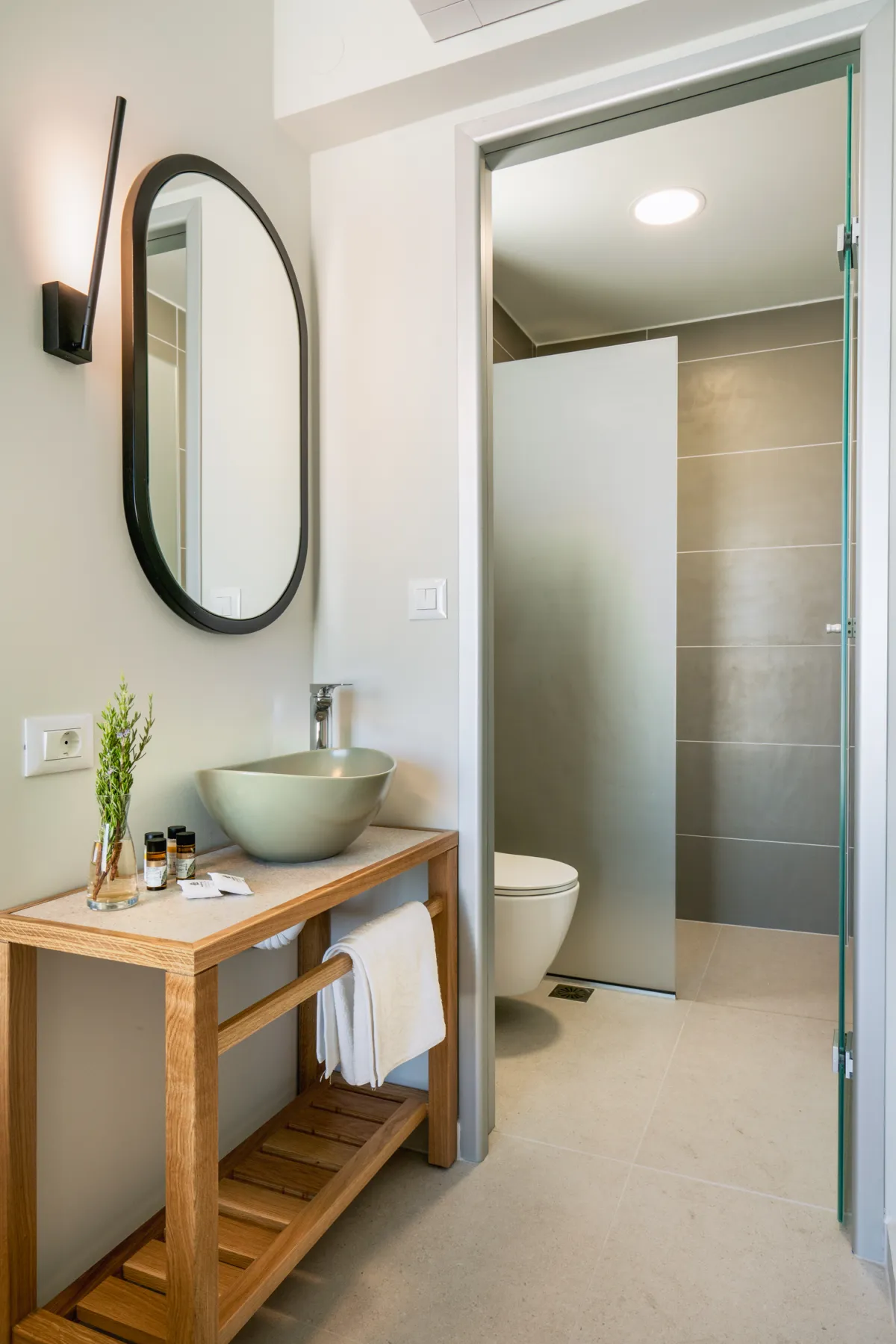 The Cretan Aura villa is made up of three levels, with 1 king-size bedroom and 1 twin bedroom on the ground floor, and 1 king-size bedroom on the upper floor. All the villa’s bedrooms have ensuite bathrooms (the bedroom on the ground floor has an ensuite shower, the wc is outside the bedroom) equipped with toiletries and towels for the visitors’ convenience. There are also hair dryers and a safety box provided, and the holiday accommodation offers a cleaning service. In addition, there are 2 guest WCs in the villa.