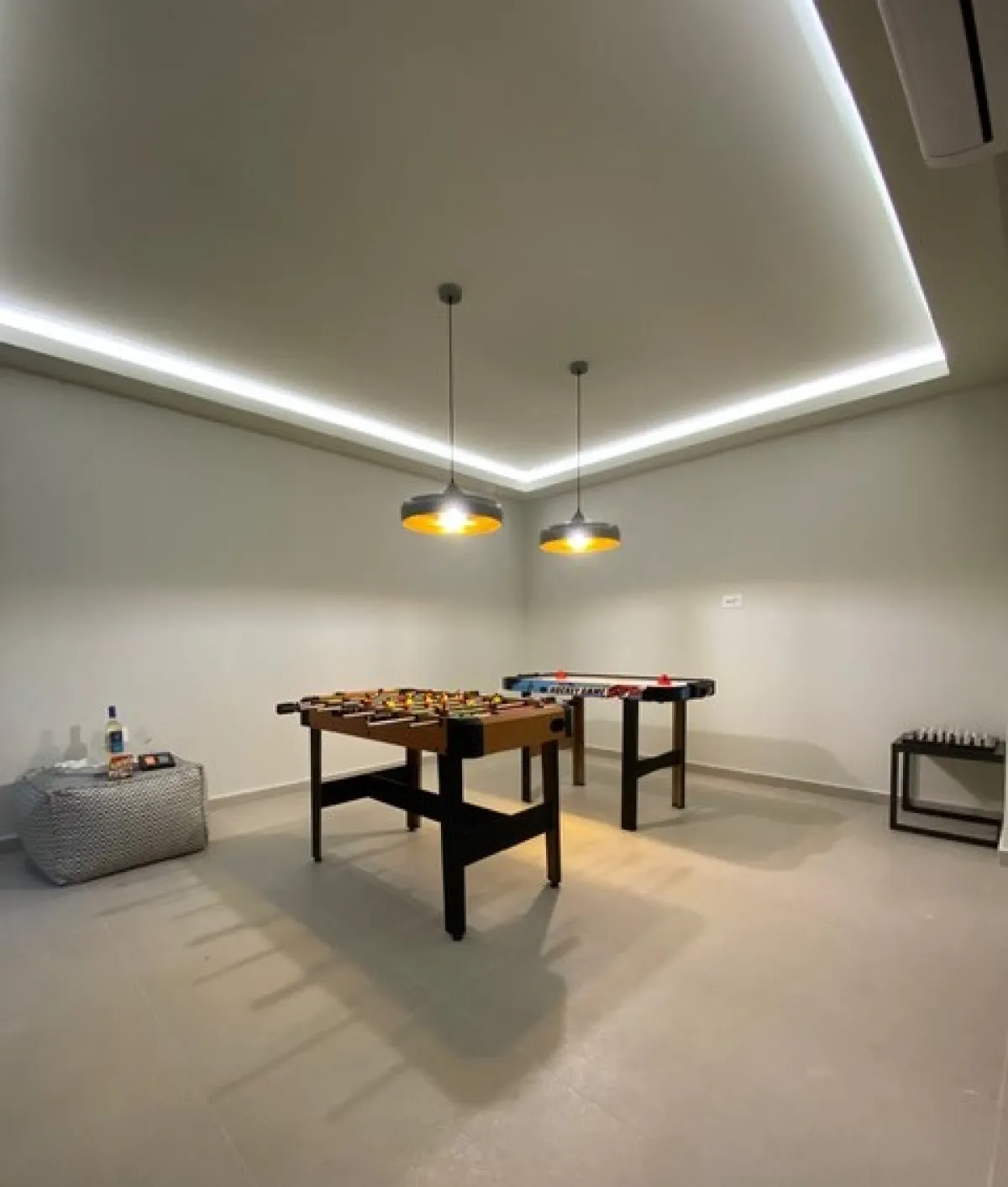 The Cretan Aura luxury villa’s living room is comfortably furnished with contemporary seating and a 42" Smart TV with satellite. There are also air-conditioning, game consoles, and board games to ensure guests’ comfort and entertainment. The open-plan layout of the holiday villa means the living room is adjacent to the dining room, which is tastefully furnished with a large, modern dining suite and attractive lighting.