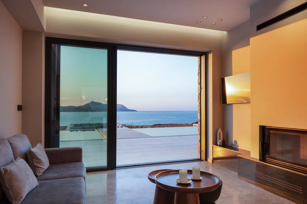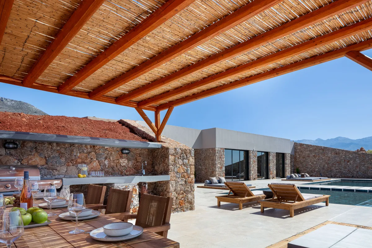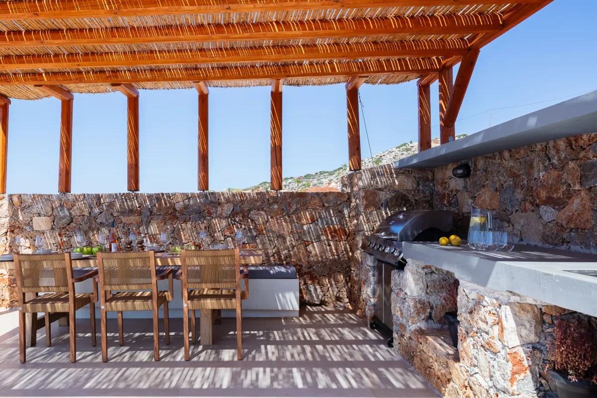 The outdoor space is equipped with a modern BBQ and a sheltered area for dining and lounging, ideal for outdoor meals and socializing. Guests can relax in the comfortable seating area by the fire pit, all while enjoying the spectacular views of Souda Bay.