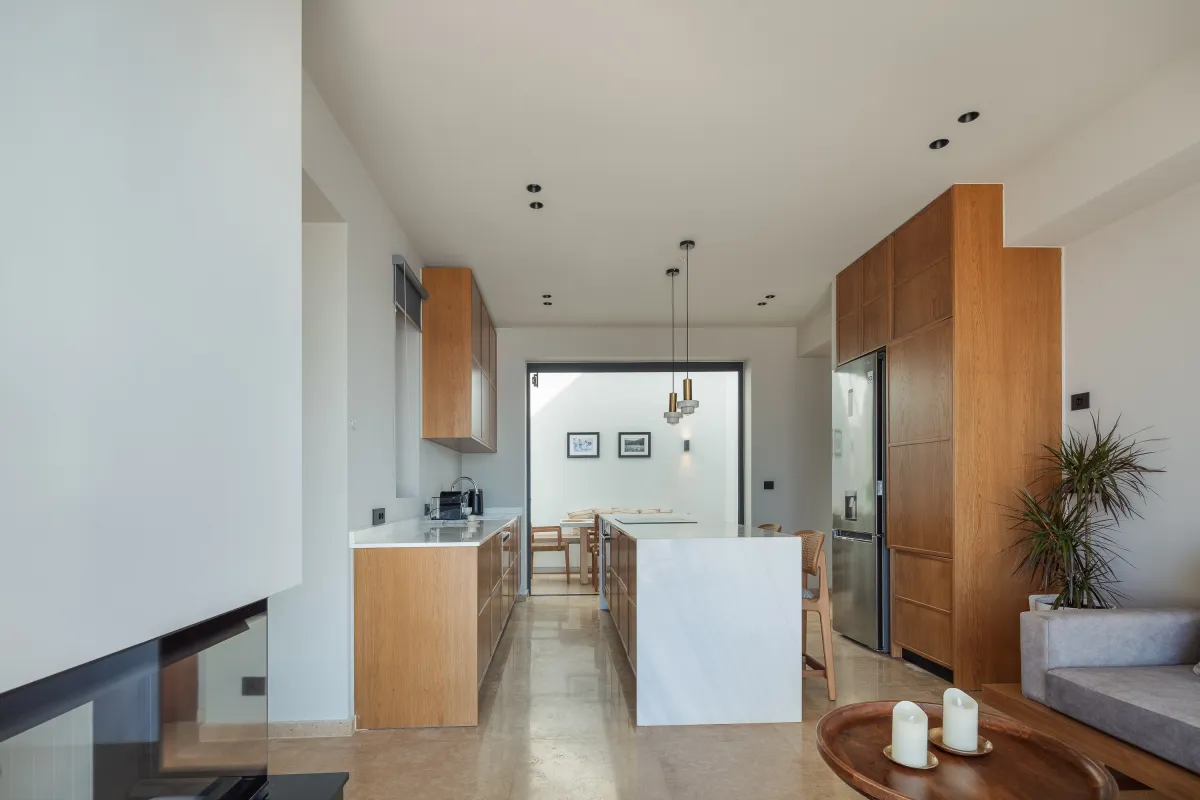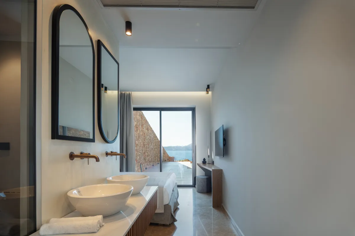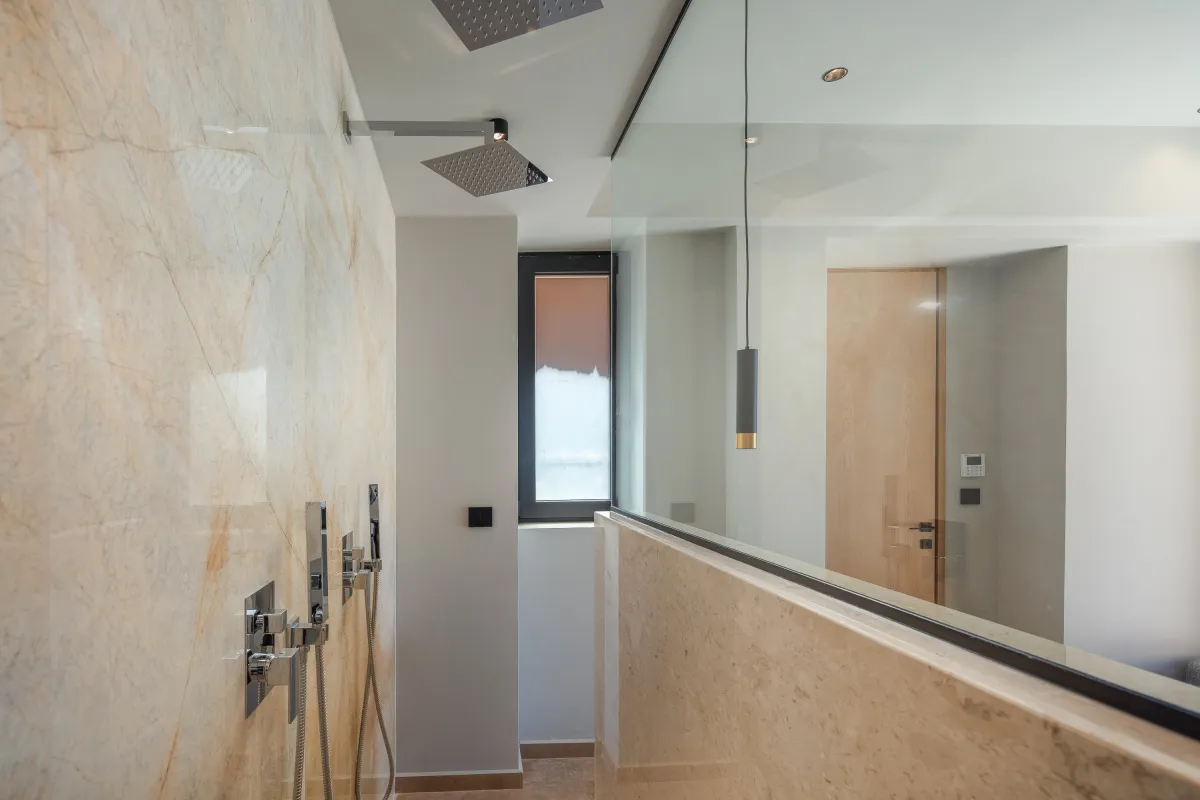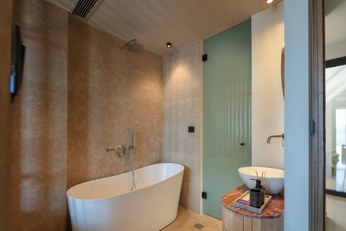 Dionysos Boutique Villa’s four ensuite bedrooms radiate elegance and comfort, thoughtfully designed to offer an unparalleled sleeping experience. The bedrooms offer super king sized beds, air conditioning, and TVs. The four luxurious ensuite bathrooms have bathtubs or showers, toiletries, towels, pool towels, and bathrobes. There is also a hair dryer.