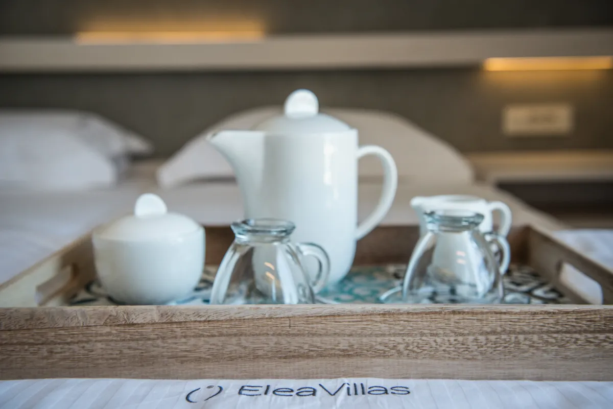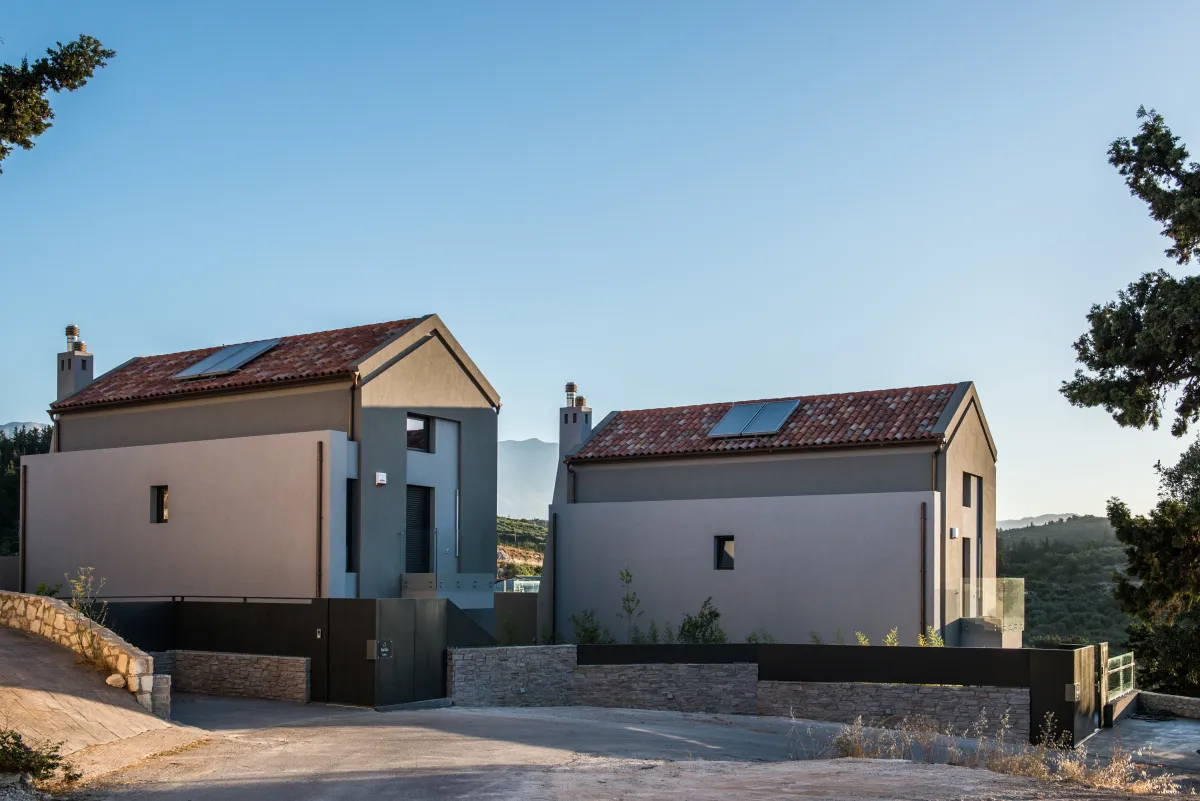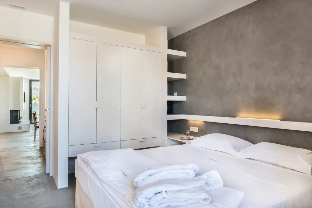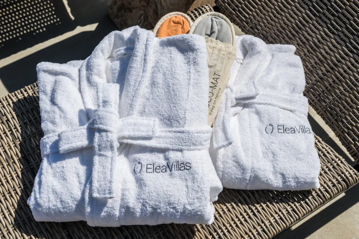 Elea Blanche is one of two twin villa complex located nearby a sandy organized beach. It is capable of accommodating up to 10 people with 200 square meters of living space. While relaxing by the 18sqm pool on the grass you can gaze the green mountains of Chania. In case you get hungry you can apply your cooking skills and use the BBQ area. A large window door connects the exterior of the villa with the living room, the dining area and the kitchen. It is an elegantly designed large room with comfortable wooden furniture and paintings. At the living room there is a fireplace, a large TV with satellite reception and air condition, The kitchen has all the modern comforts a guest might require and the dining area of a large wooden table. In the 5 bedrooms of the villa you can sleep on luxury Cocomat mattresses , use the bath robes and sleepers or relax at the balcony. The most romantic ones can sleep at the two bedrooms in the attic with wooden roof and enjoy the highest view of the villa. Safe, secure stone walls are available.