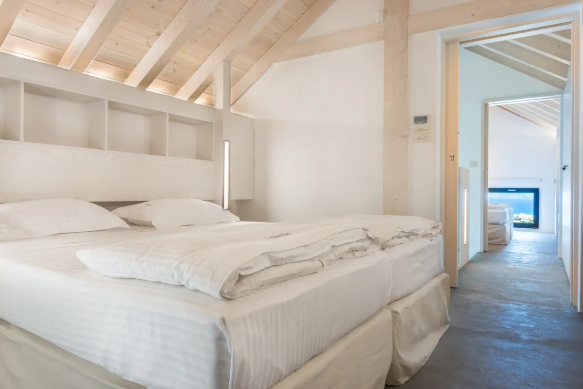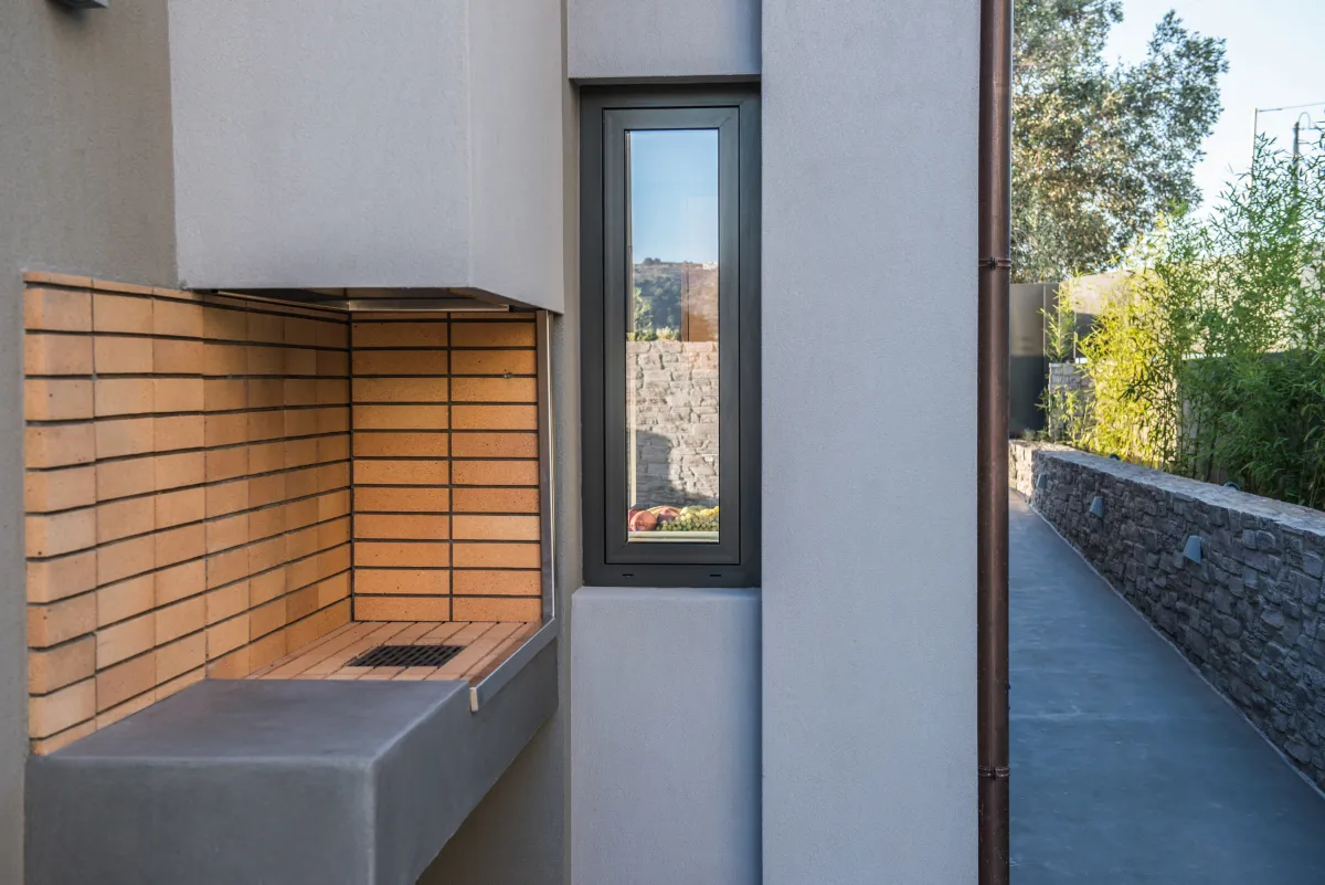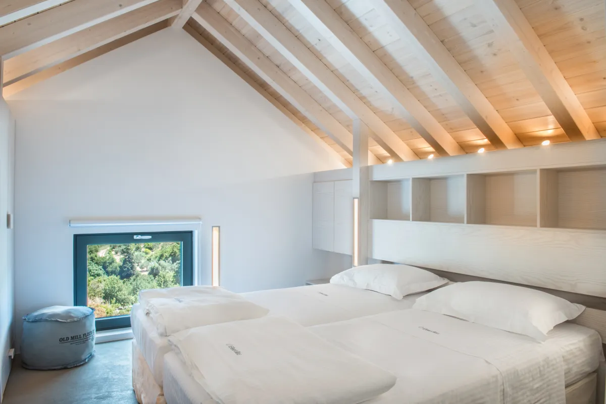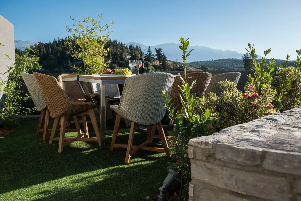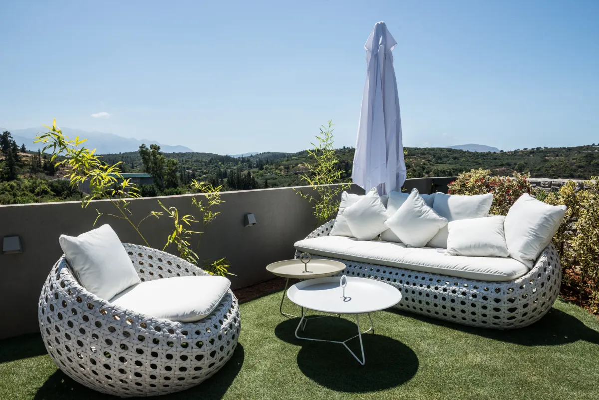 Elea Blanche is one of two twin villa complex located nearby a sandy organized beach. It is capable of accommodating up to 10 people with 200 square meters of living space. While relaxing by the 18sqm pool on the grass you can gaze the green mountains of Chania. In case you get hungry you can apply your cooking skills and use the BBQ area. A large window door connects the exterior of the villa with the living room, the dining area and the kitchen. It is an elegantly designed large room with comfortable wooden furniture and paintings. At the living room there is a fireplace, a large TV with satellite reception and air condition, The kitchen has all the modern comforts a guest might require and the dining area of a large wooden table. In the 5 bedrooms of the villa you can sleep on luxury Cocomat mattresses , use the bath robes and sleepers or relax at the balcony. The most romantic ones can sleep at the two bedrooms in the attic with wooden roof and enjoy the highest view of the villa. Safe, secure stone walls are available.