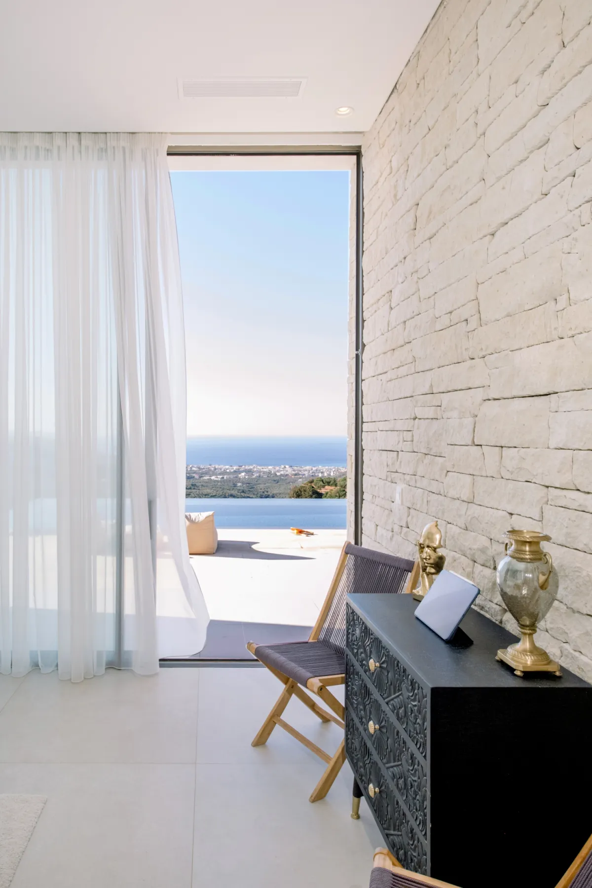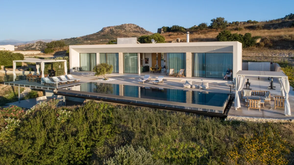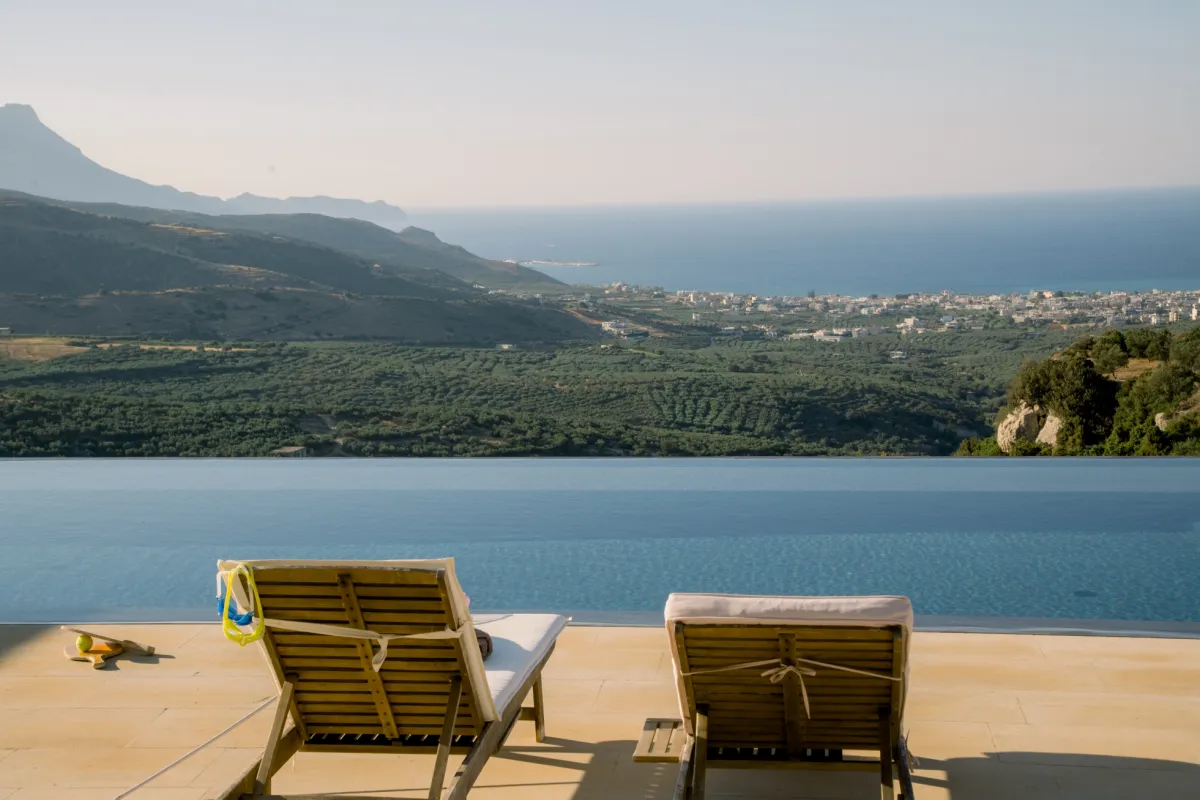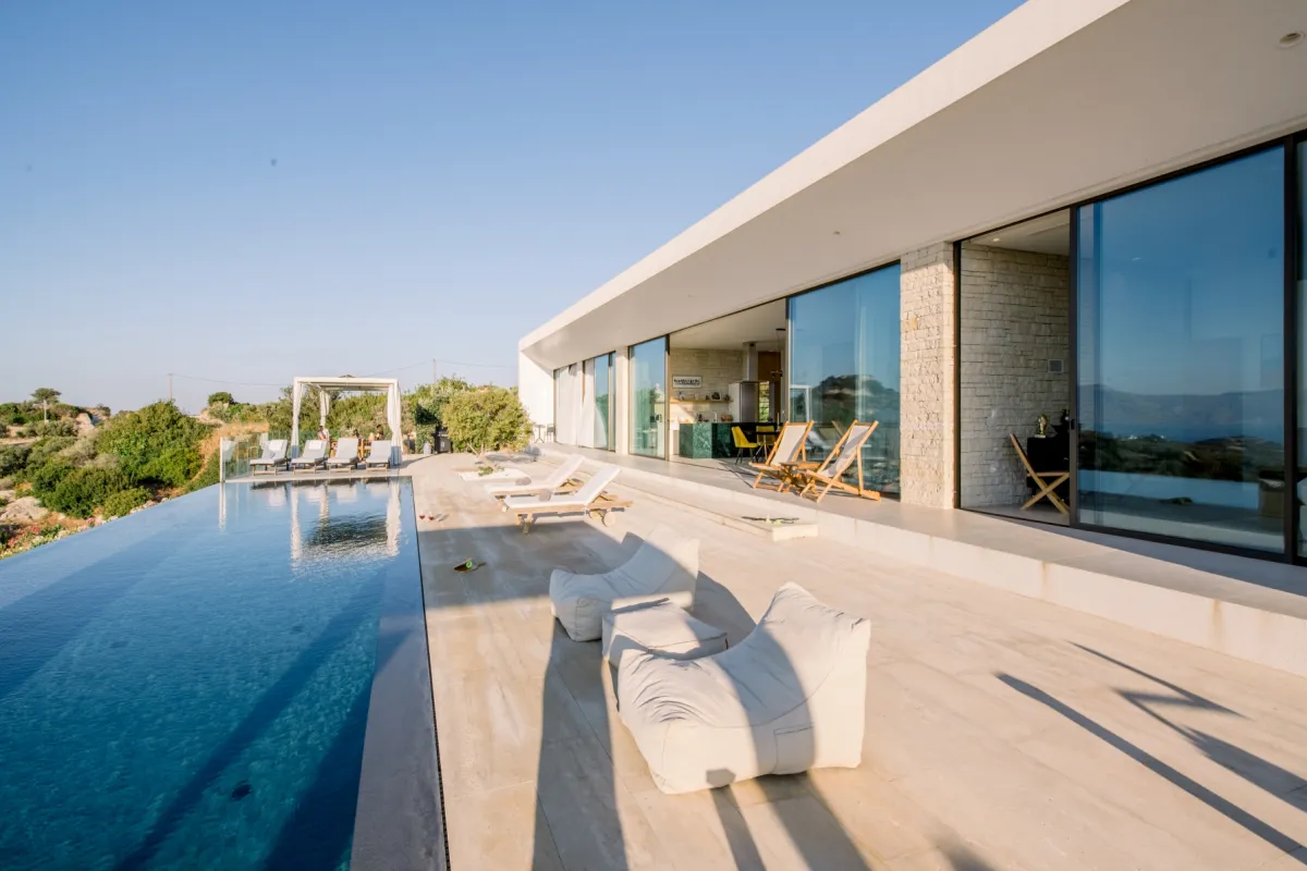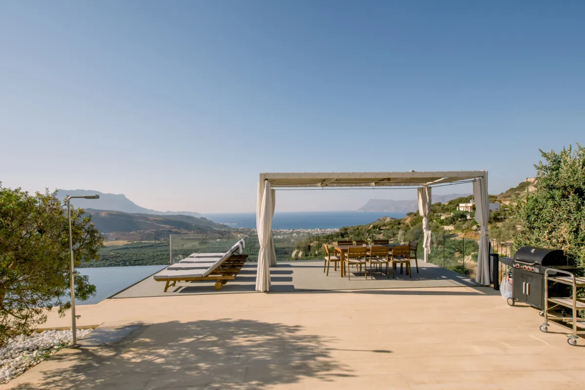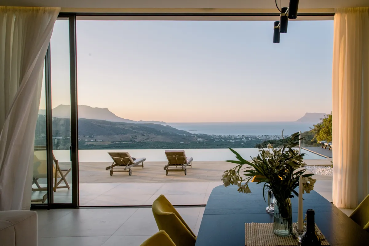 This is a highly impressive and beautiful modern villa set in a superb position, with a fantastic view of an olive grove valley below, with mountains on both sides and the coast around Kissamos beyond. The outside of the villa is lovely, with floor to ceiling windows across the entire front elevation, overlooking a gorgeous, large infinity swimming pool overlooking a view which can only be descri... more