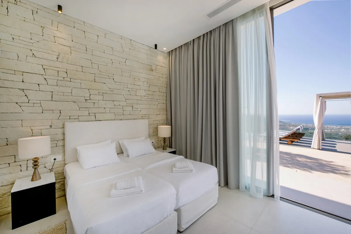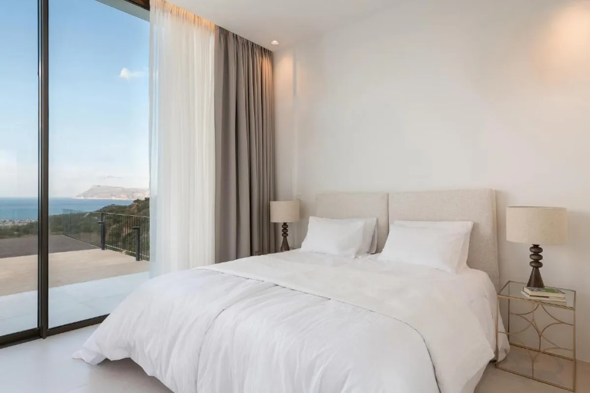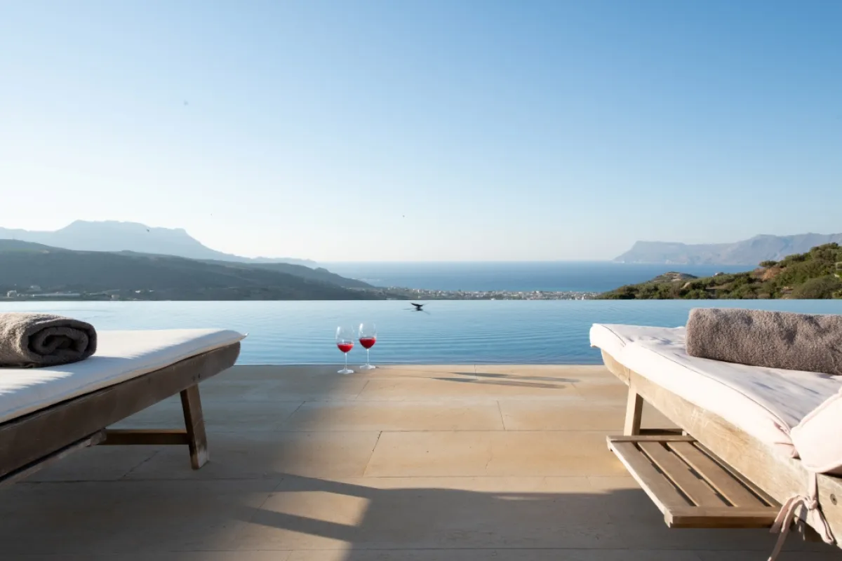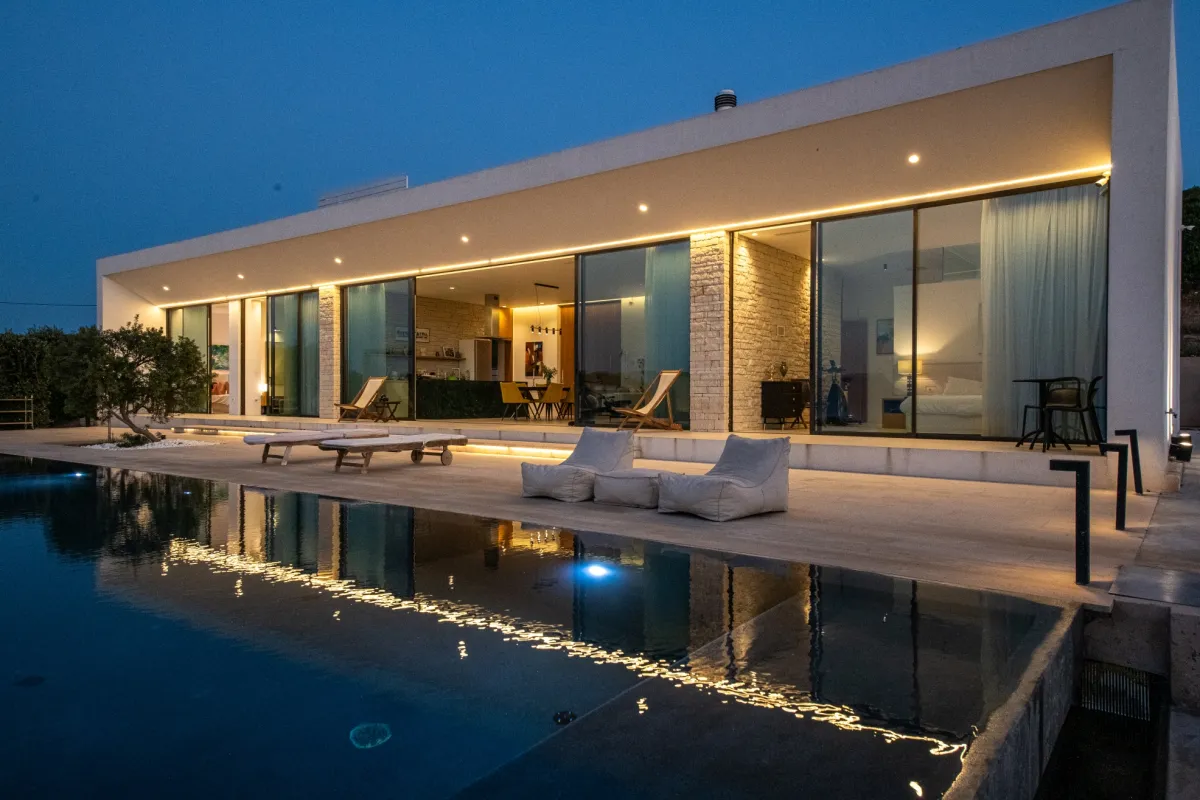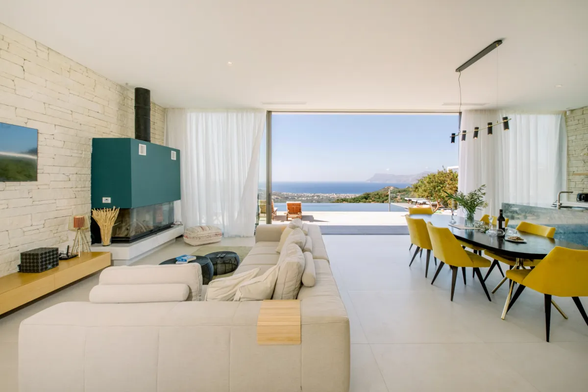 This is a highly impressive and beautiful modern villa set in a superb position, with a fantastic view of an olive grove valley below, with mountains on both sides and the coast around Kissamos beyond. The outside of the villa is lovely, with floor to ceiling windows across the entire front elevation, overlooking a gorgeous, large infinity swimming pool overlooking a view which can only be descri... more