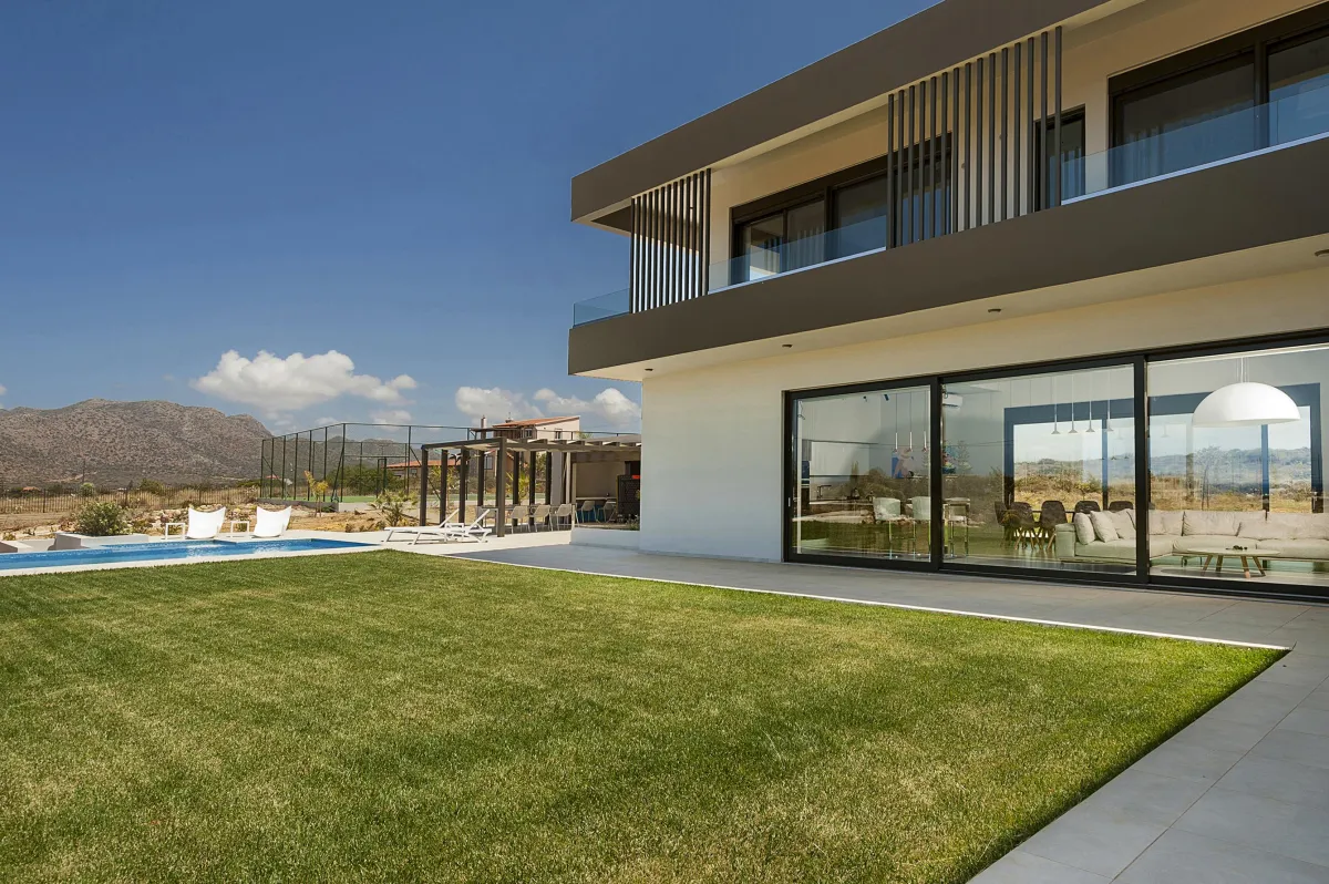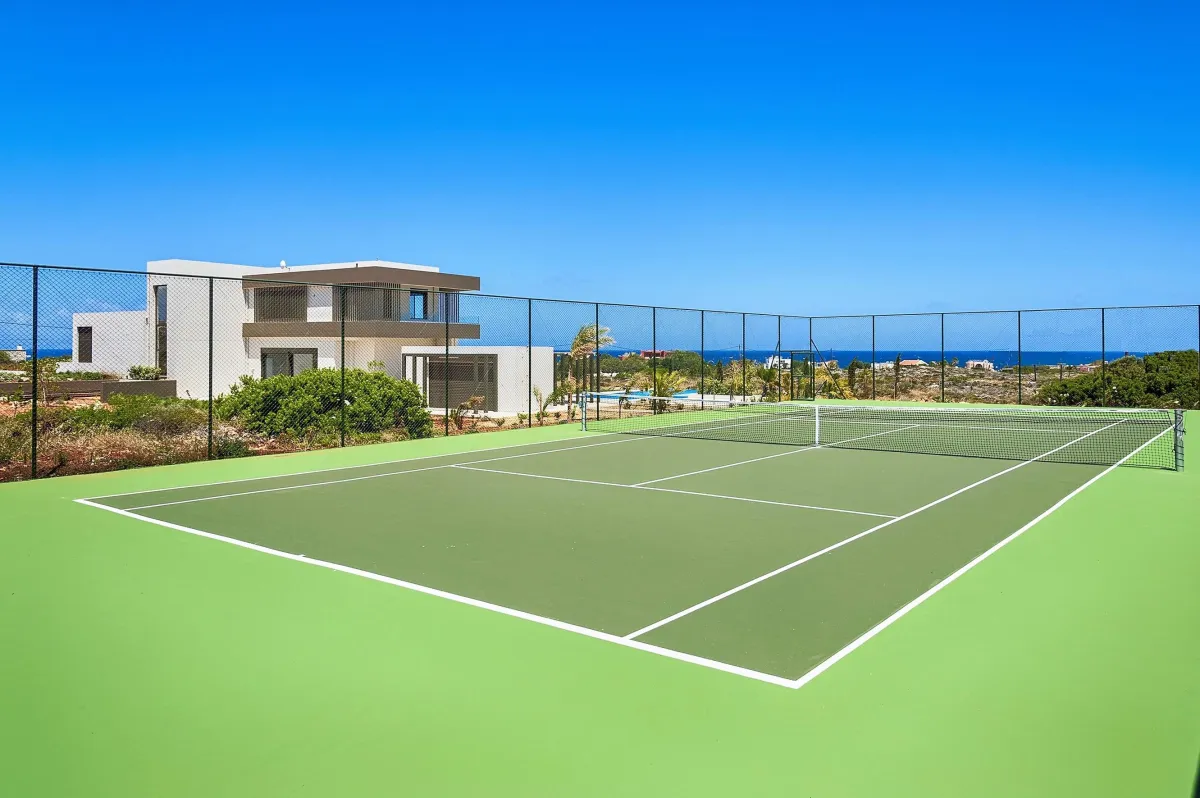 Villa Gardenia is set in a large 8000 m2 plot of land with beautifully landscaped gardens and grassed lawn areas, supremely located next to the most famous destination of Chania, Stavros Beach, including a tennis court! You can use the tennis court with friends and family, or simply invite and indulge your sweetheart with a second honeymoon vacation. Begin your stay in Villa Gardenia, and get inspired by its blissful solitude benefitted by a beautiful Mediterranean landscape, really close to some of the northwestern Crete's gems. The interiors of the villa are strongly interconnected with the exterior space, creating a charming mix blend of domestic natural intimacy and elegant minimal design. The interior living area opens up directly onto an ample deck terrace with a gorgeous swimming pool that shelters an outdoor lounging area, a patio for on-site cooking, and alfresco dining, to enjoy the perfect architectural balance between indoor and outdoor luxury living. The villa's interiors balance comfortable, modern furnishings and high-end appliances, boasting a beautiful salon, a dining room, and a gourmet kitchen with an expansive breakfast bar indoors. Each of the four bedrooms is tastefully designed and decorated, fitted with high-quality super soft mattresses, while the master bedroom boasts an open-air hot tub. Beyond the bedroom's balconies lies a distinctive Mediterranean scenery to admire, with olive groves and Cretan herbal plants. The majestic, two-story, and 4 bedrooms villa gives off an air of luxury and modernity totally harmonized with its unrivaled natural environment, located in a top destination spot of the island to truly grasp the experience of the world-renowned Greek summer. Enjoy the feeling of being at ease, body, and mind in perfect unison for guests of all ages, ideal to unwind after a day exploring the seductive island of Crete.