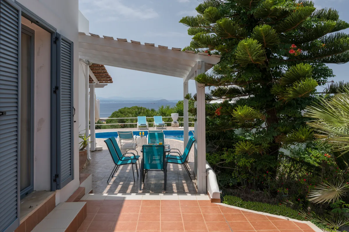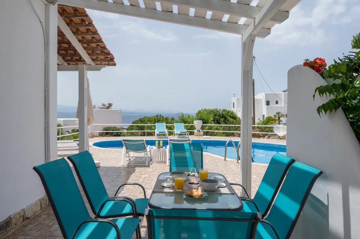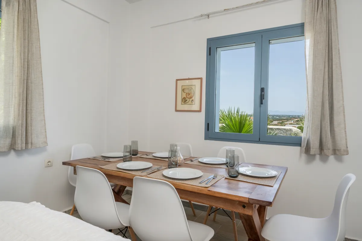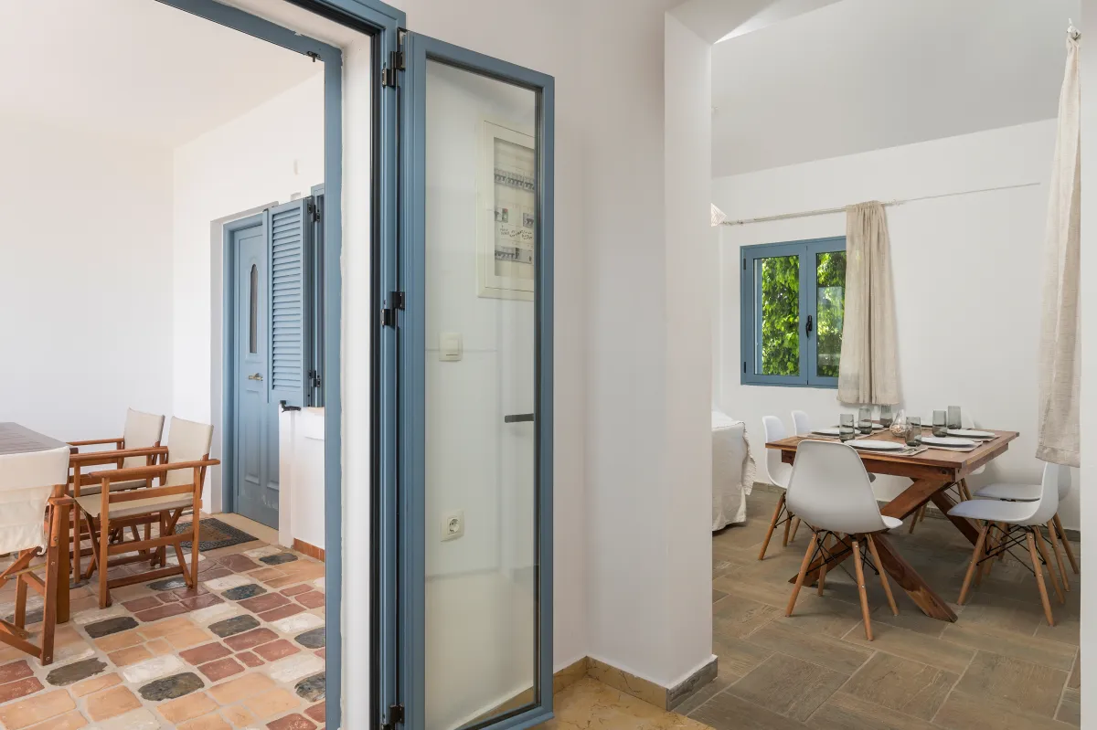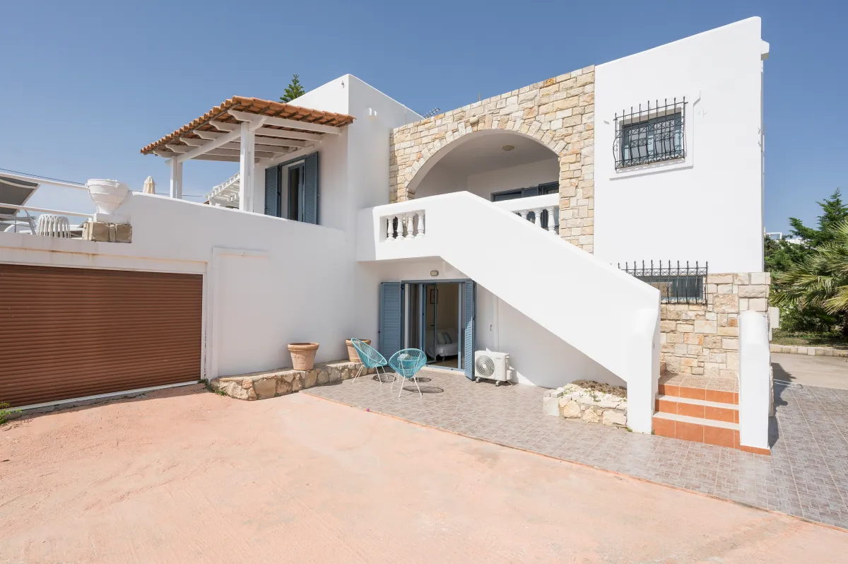 The 40 sqm private swimming pool is perfectly positioned to capture panoramic sea views and long hours of Cretan sunshine. Sun loungers and umbrellas surround the pool, while shaded seating areas invite moments of quiet relaxation. A BBQ and outdoor dining area create the perfect setting for al fresco meals under the Mediterranean sky. Private parking is available on the premises, and the overall ambiance remains peaceful, secluded, and effortlessly refined.