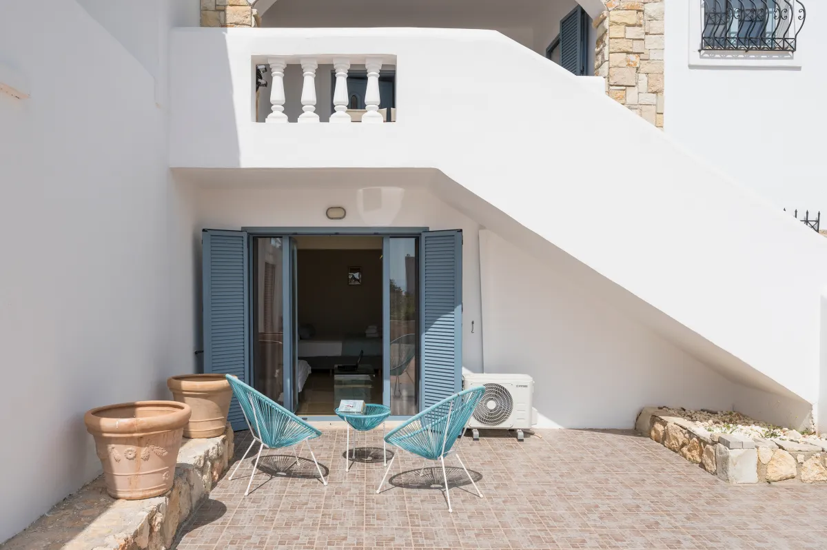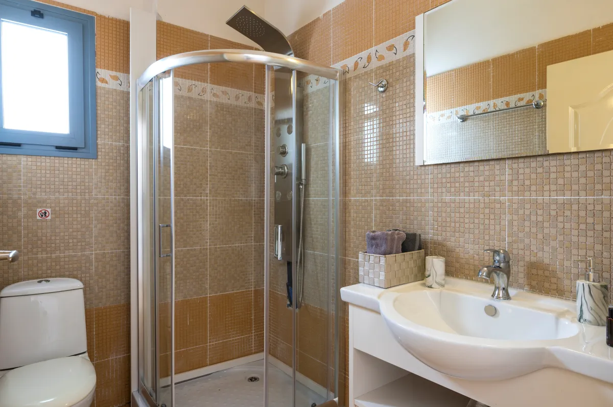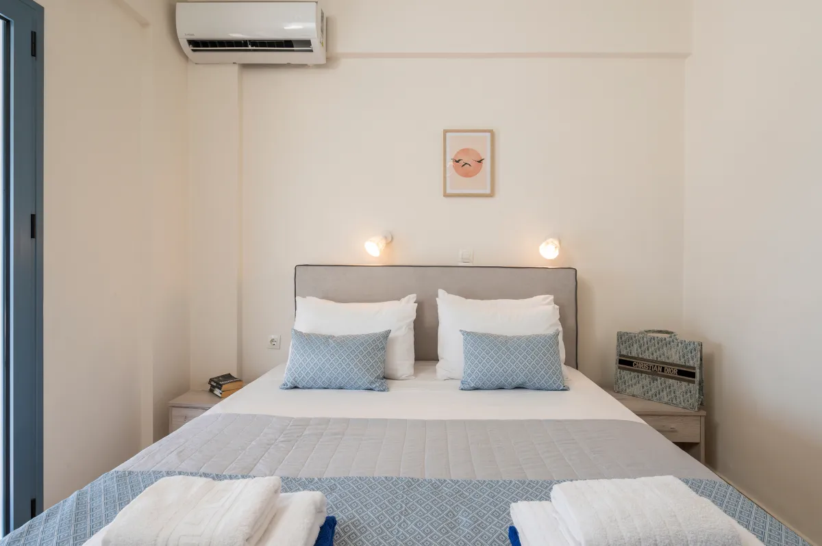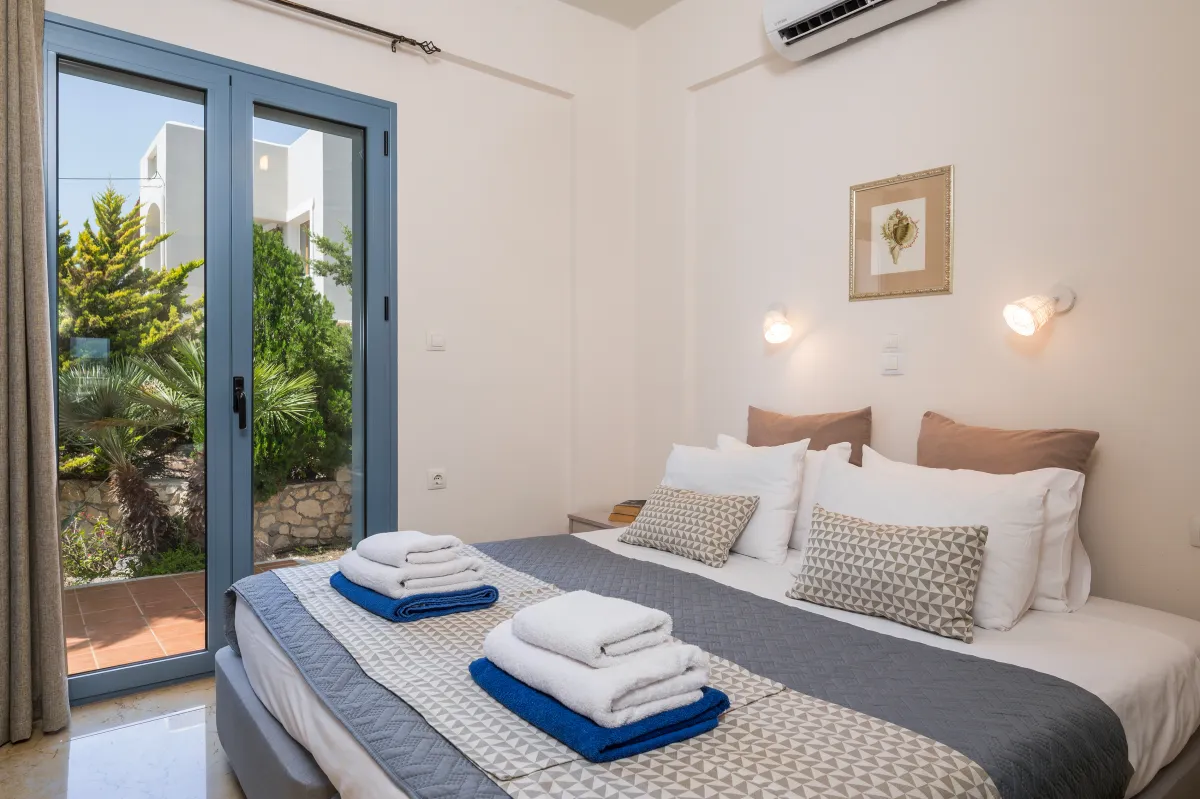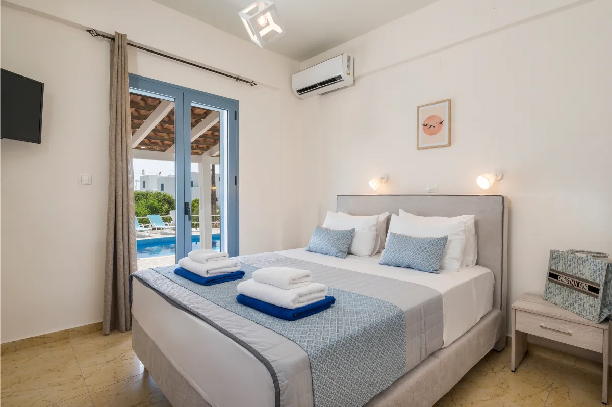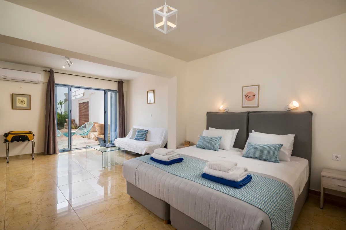 Irida Villa Chania features three beautifully appointed bedrooms. The ground-floor master suite offers a king-size bed, private entrance, kitchenette, sitting area, generous wardrobe space, and an ensuite bathroom with a jetted shower, ideal for guests seeking additional privacy.