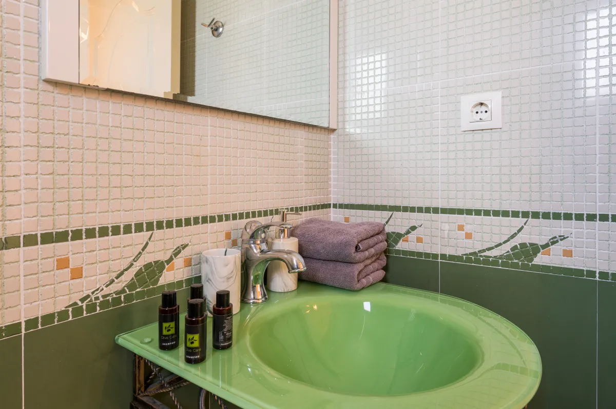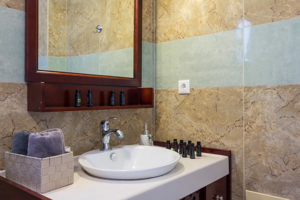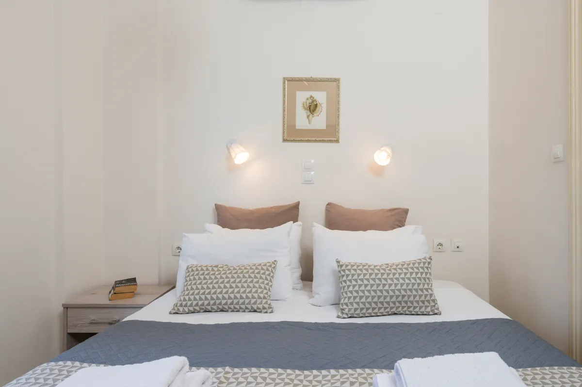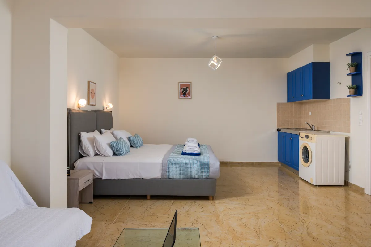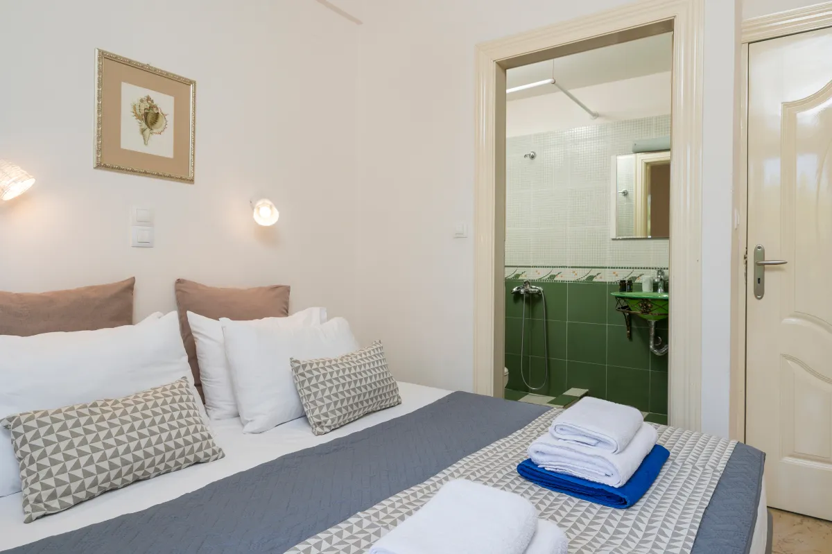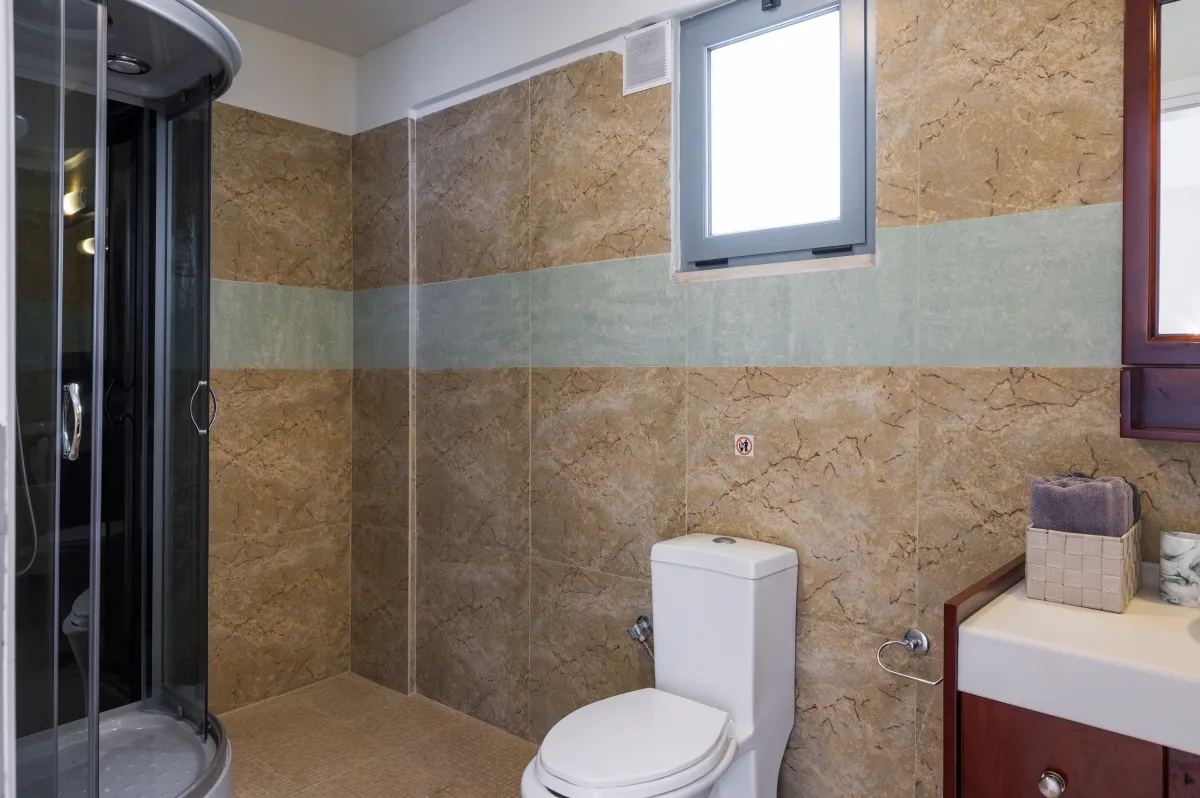 Irida Villa Chania features three beautifully appointed bedrooms. The ground-floor master suite offers a king-size bed, private entrance, kitchenette, sitting area, generous wardrobe space, and an ensuite bathroom with a jetted shower, ideal for guests seeking additional privacy.
