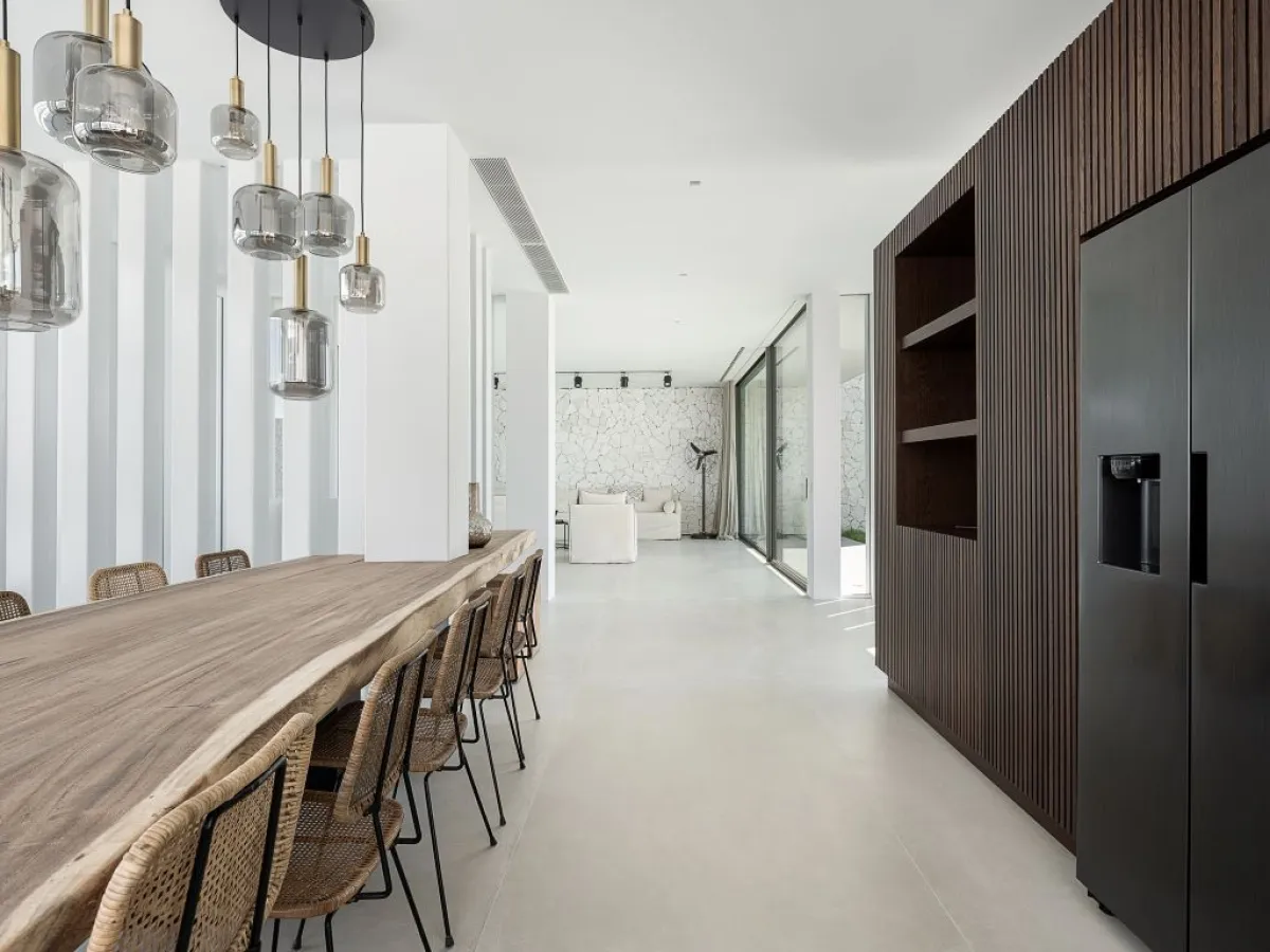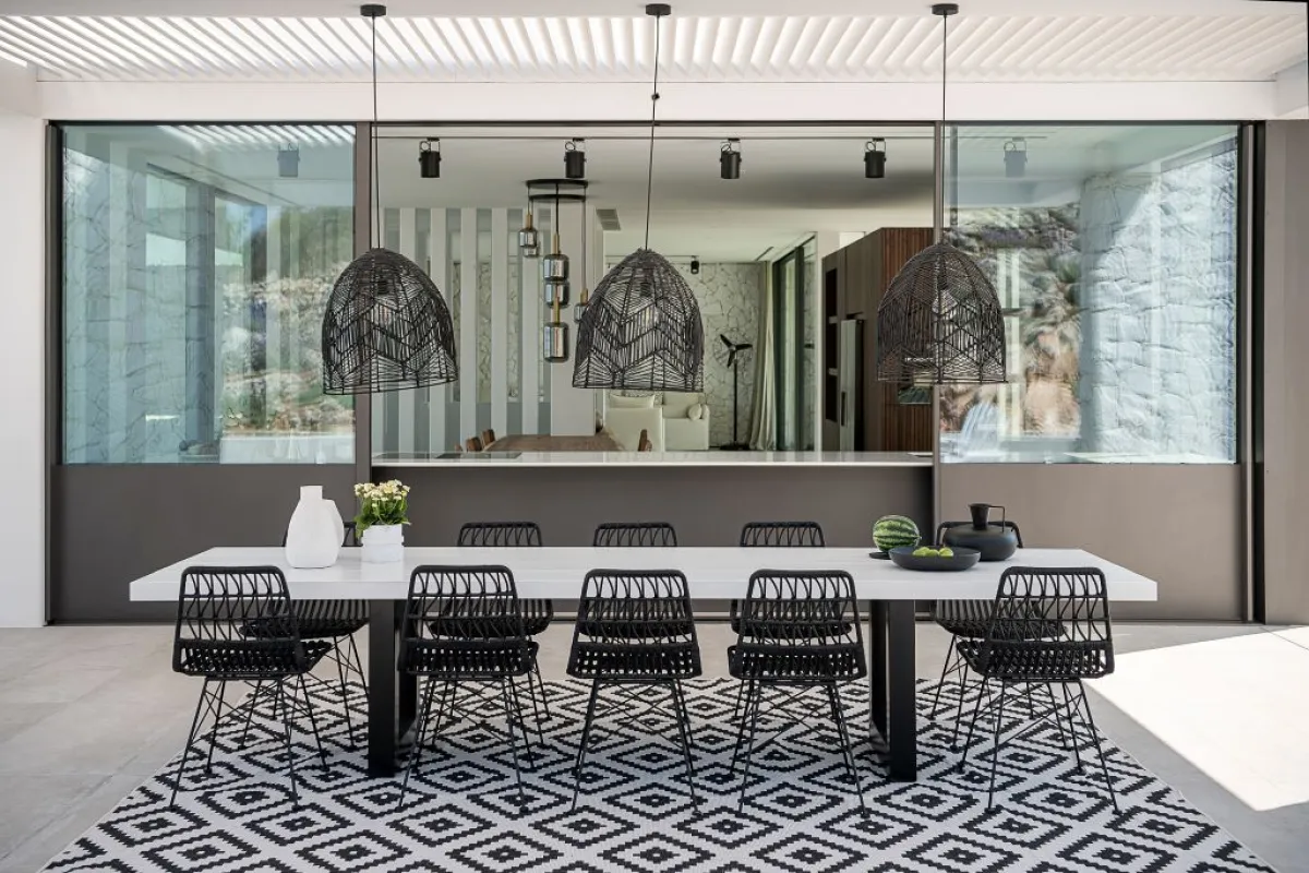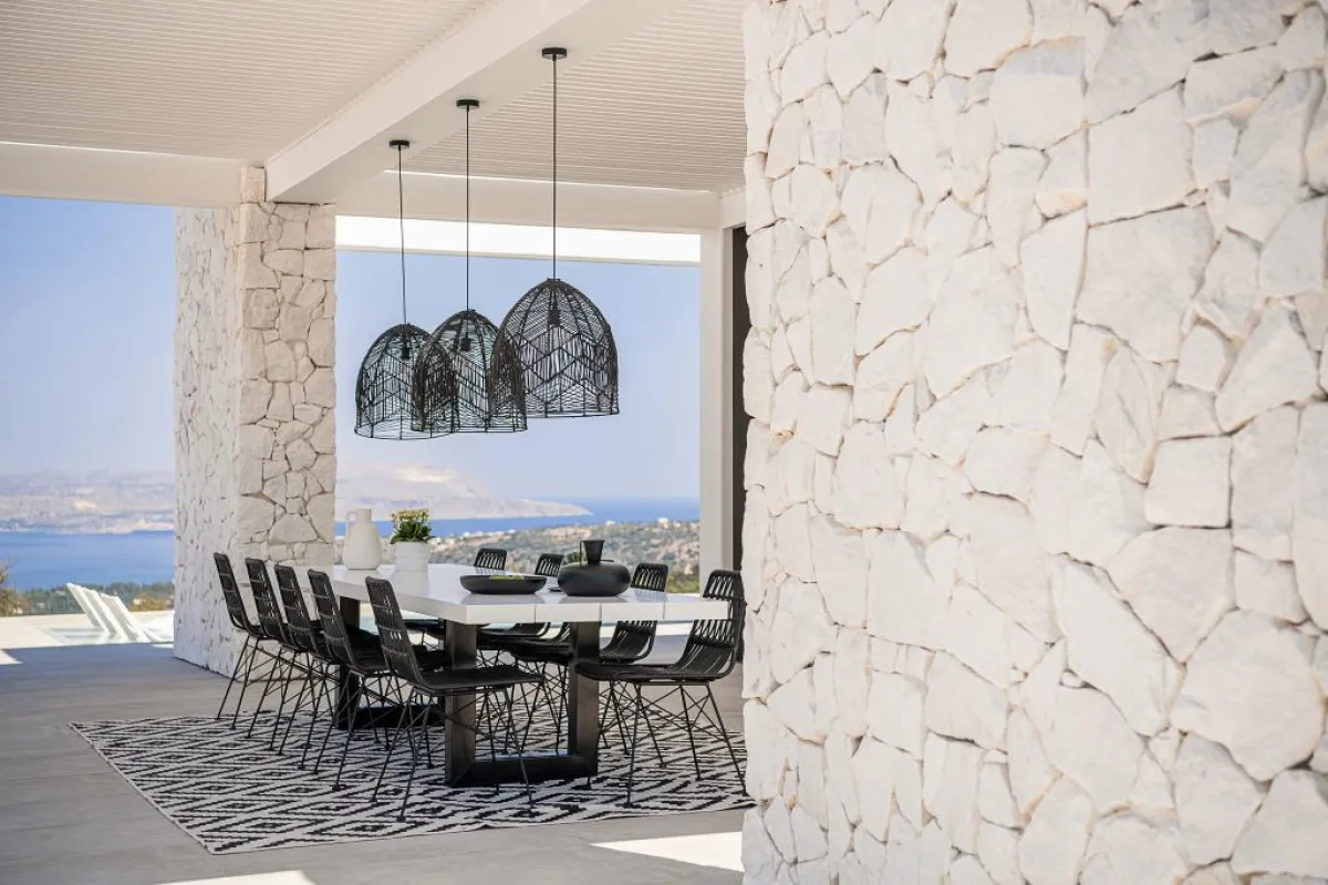 The stylishly furnished dining area can seat 10 guests comfortably and is an elegant space to enjoy meals and conversations with friends. The luxury villa’s modern kitchen is well equipped with facilities including a 4-ring stove, freezer, microwave, Nespresso espresso machine, and capsules. A welcome pack includes wine, olive oil, and seasonal products.
