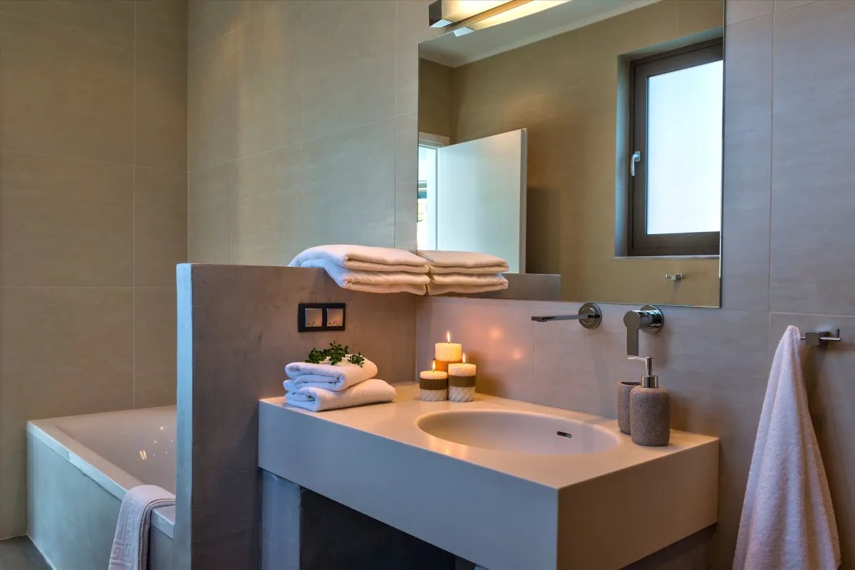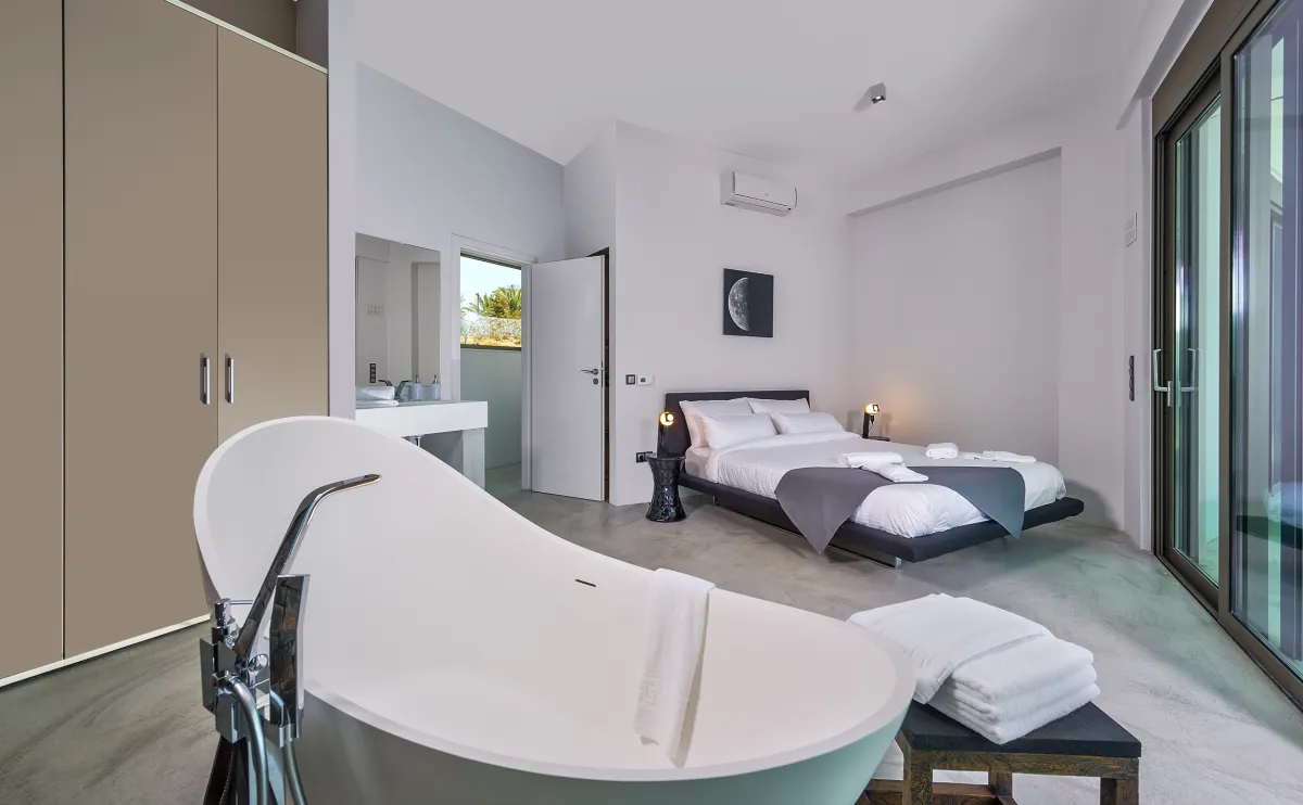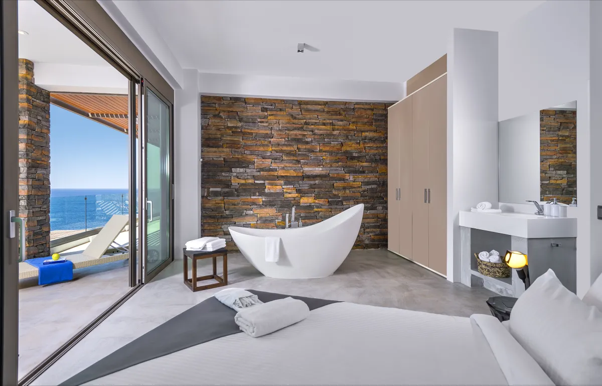 This exclusive master bedroom is located on the first floor by the sea. It has access to a large terrace and offers a double bed with a high-quality Dunlopillo mattress (170 * 200 * 21 cm). This space was originally designed for 2 small bedrooms, but plans were changed during construction, resulting in a large master bedroom with a freestanding designer bathroom providing a unique bathing experience with unrivaled sea views.