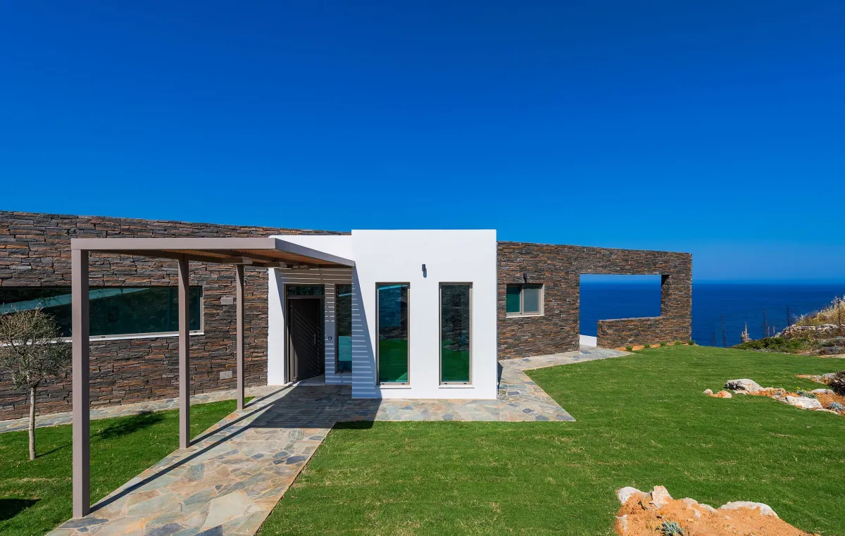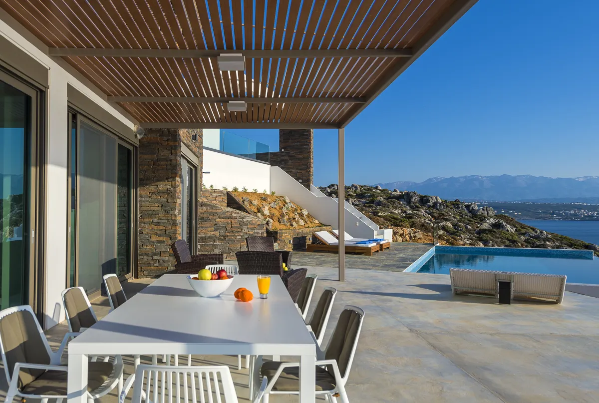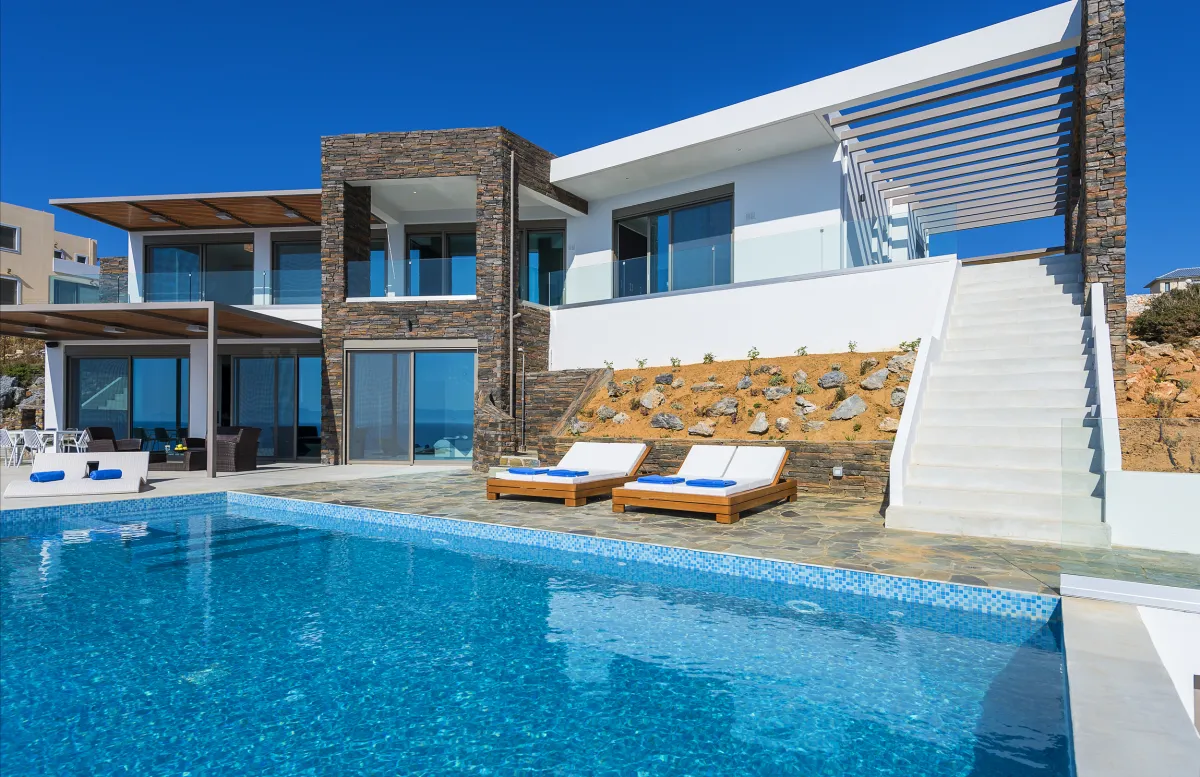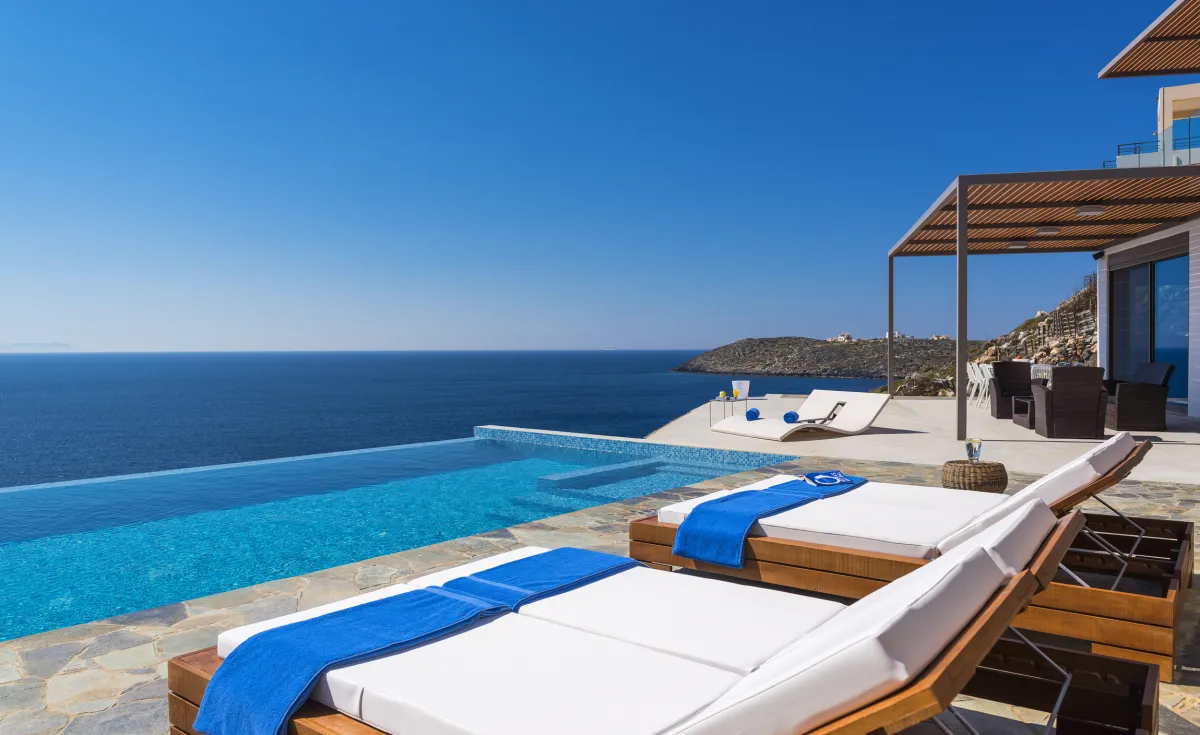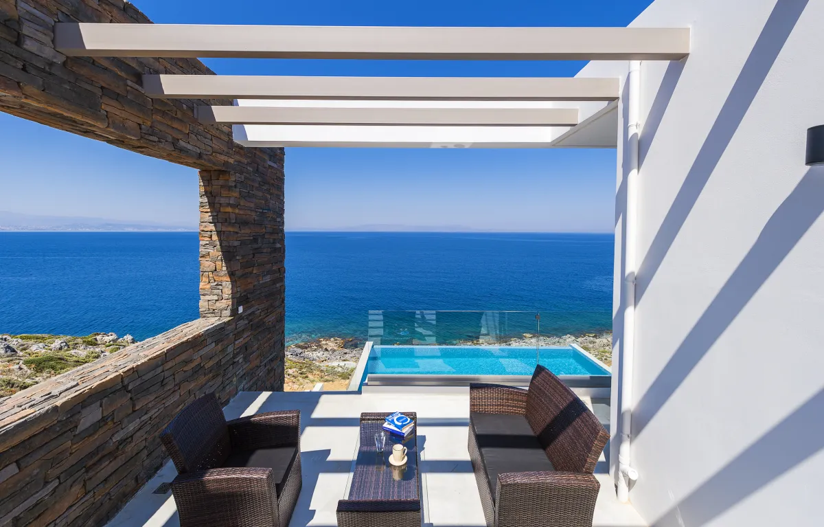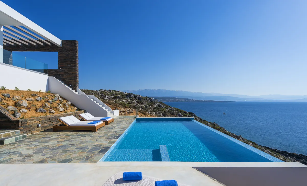 Stylish luxury villa Kyma is overlooking the Chania bay from a high ground offering amazing seafront views. It is one of the very few to offer direct access to the sea over a private pathway leading to the rocky coastline.