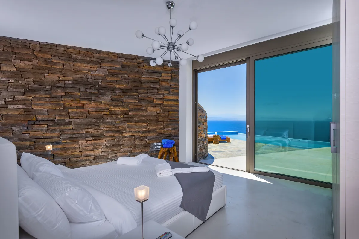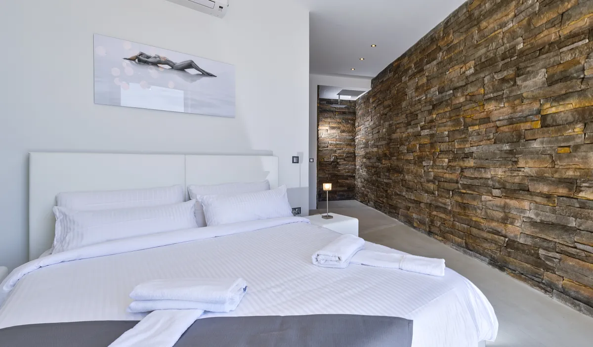 This master bedroom offers direct access to the pool and features a large stone wall leading to a wellness shower.