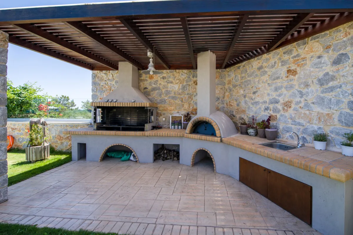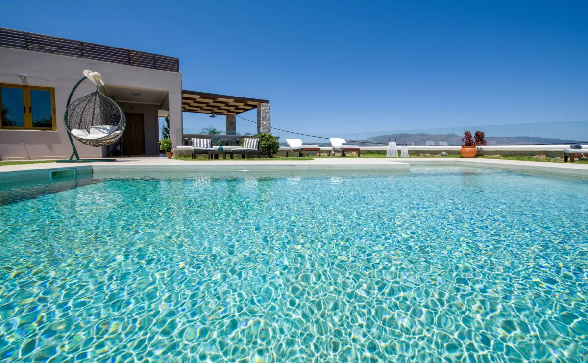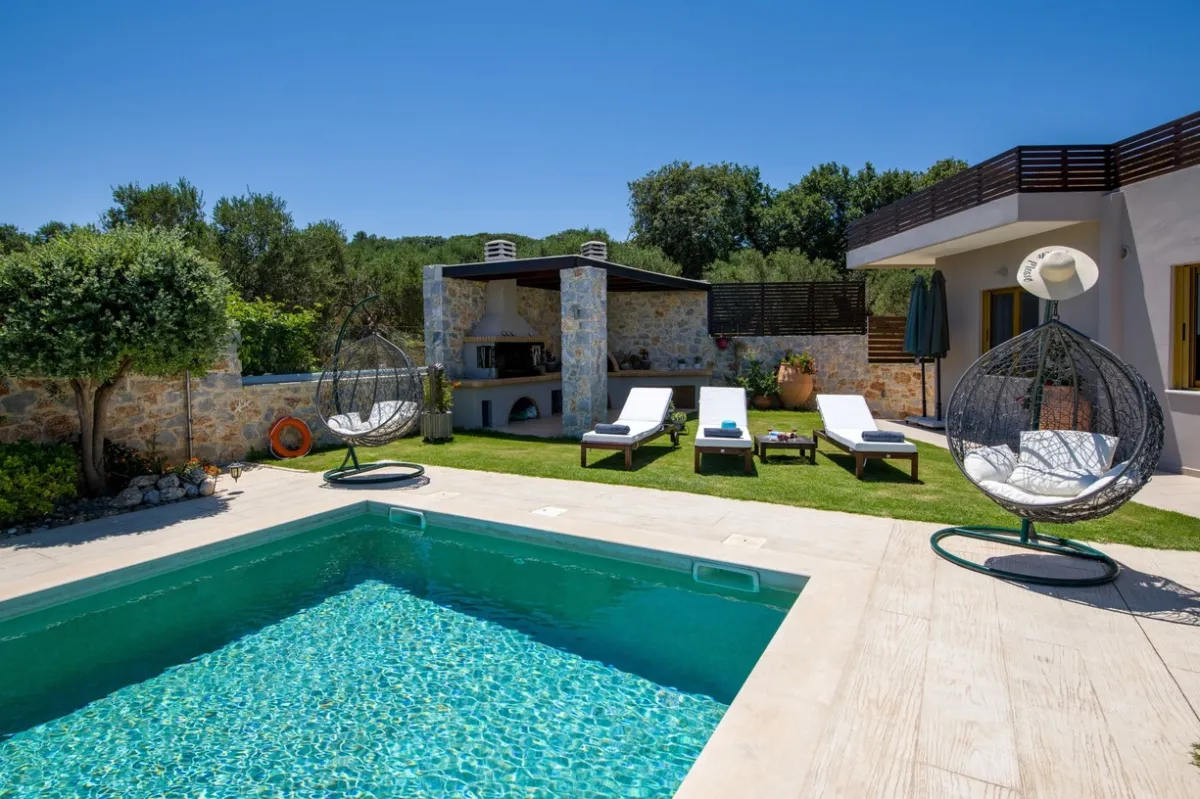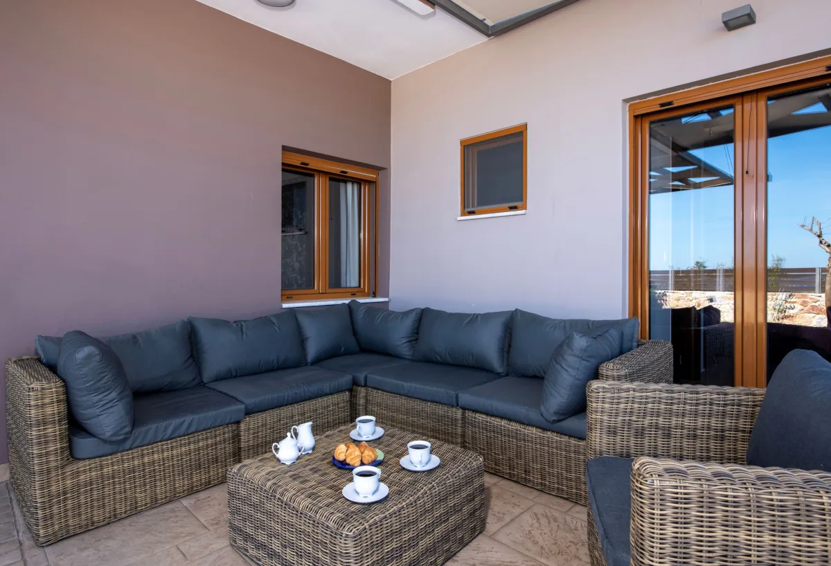 Drift across the serene swimming pool, looking up to see blue skies and the beautiful greenery hanging overhead, and enjoy your ultimate space for summer relaxation. Escape to your own quiet piece after a day exploring the island and gather at the alfresco set to enjoy a family re-union dinner while the sun sets. This luxury property is designed to make the most of Crete’s warm weather and laid-back atmosphere.