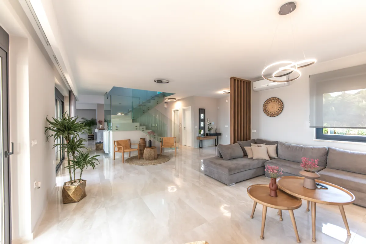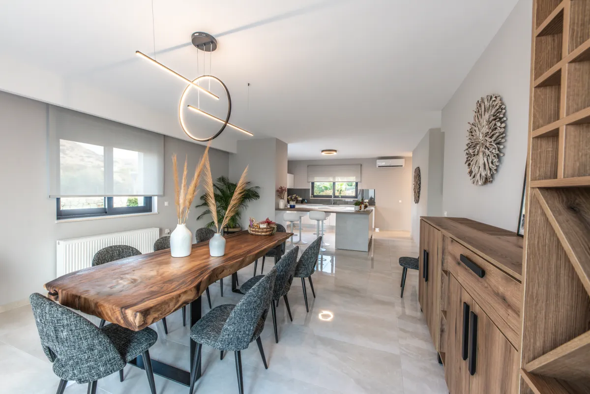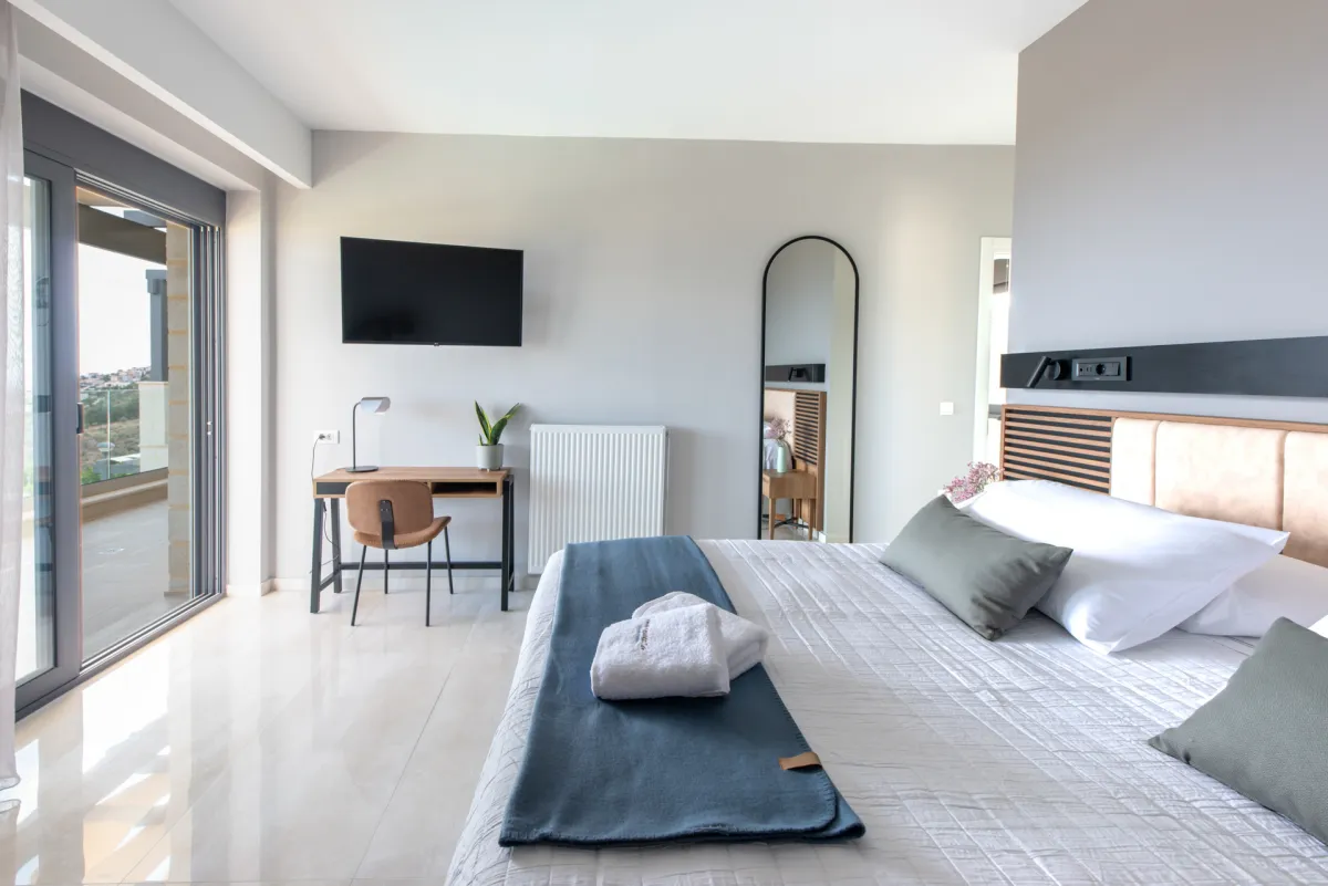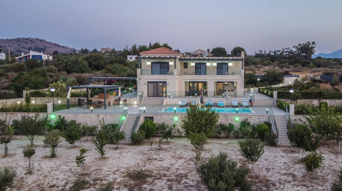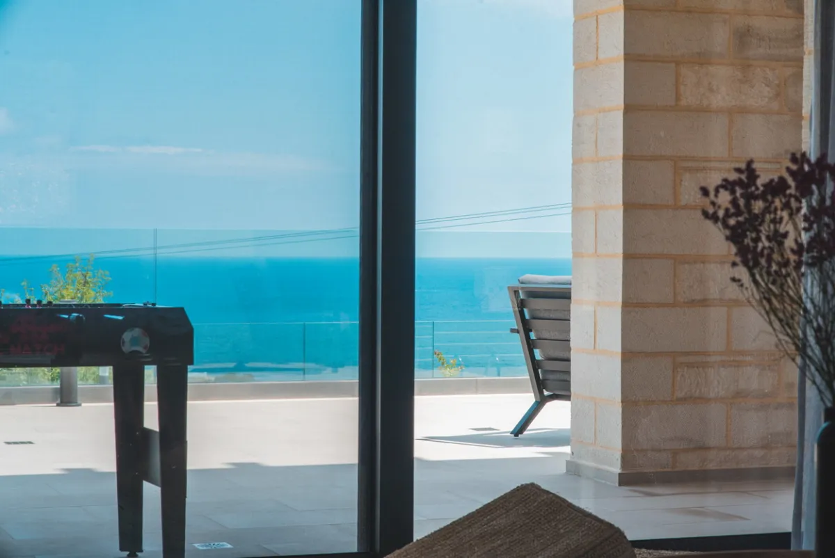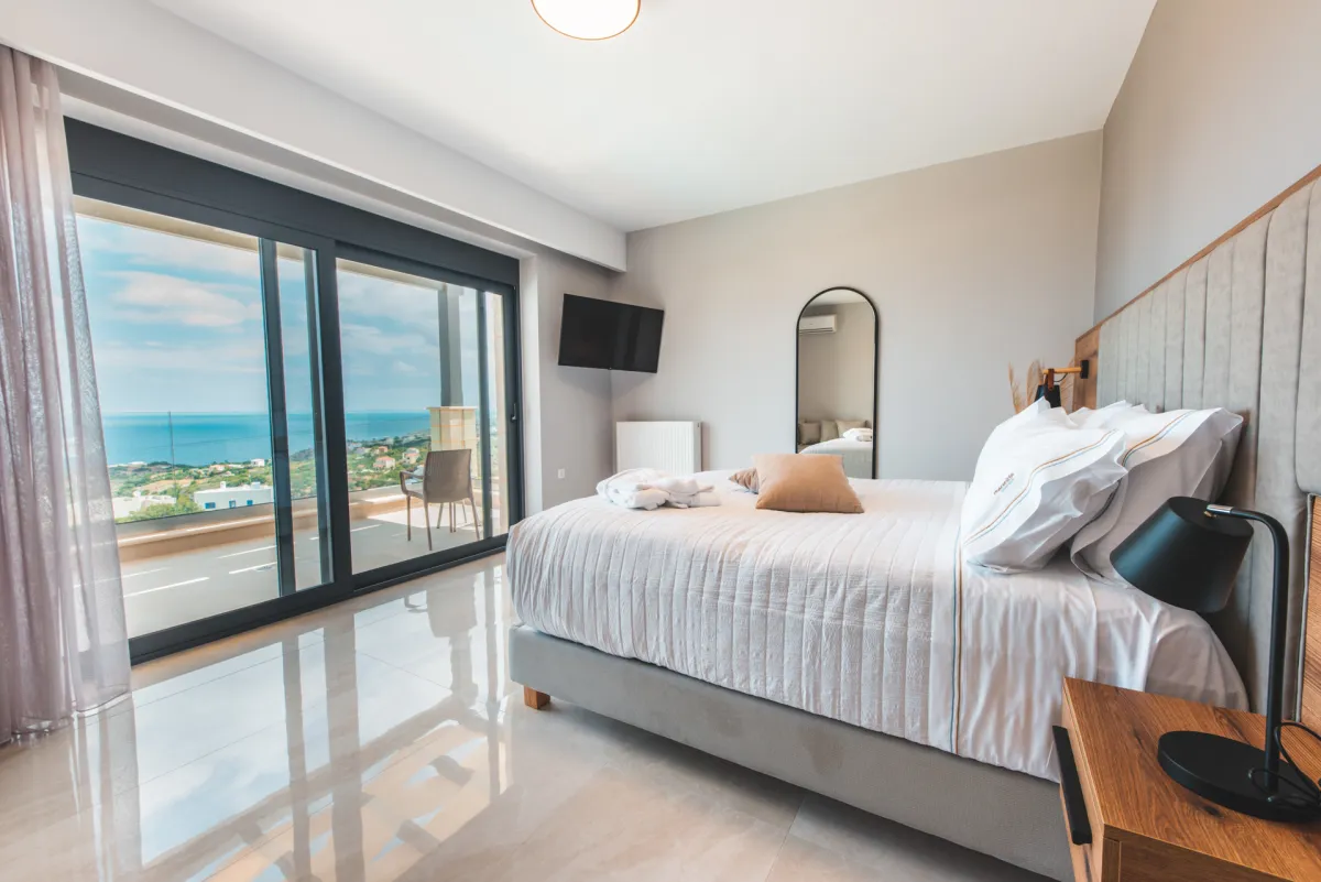 The beautiful Villa Marevista in Plaka, in the Apokoronas region on the northwest coast of Crete, is the ideal destination for a relaxing, carefree, and luxurious holiday in Greece. Sitting on a spacious 4,285 sq.m. plot, the secluded location of the luxury villa ensures privacy, yet there are many holiday attractions within easy reach of the rental property. The private luxury villa offers an elegant living area, stylishly furnished with a large corner sofa and a nesting coffee table as well as a smart TV with satellite. In addition, there are occasional chairs, a safe, a fireplace, air conditioning, and 24/7 concierge services available. The dining area is furnished with a stylish wooden table and 10 comfortable dining chairs. Villa Marevista is equipped with a stylish, modern kitchen with a built-in oven and smooth electric stovetop, a microwave, a refrigerator, as well as a Nespresso coffee machine, a blender, a toaster, and a kettle. Additionally, there is a breakfast counter with 4 chairs. The luxury villa is home to 3 double bedrooms, each with an ensuite bathroom and sea-facing balconies. The bedrooms are stylishly decorated and furnished with either double or twin beds (pushed together), bedside tables, a desk / vanity table, occasional chairs, a cushioned wall seat in one of the bedrooms, and ample wardrobe space. The ensuite bathrooms are equipped with showers, toilets, complimentary toiletries, towels, and hairdryers. Furthermore, there are amenities including a washing machine, iron, and ironing board provided. The impeccable outdoor area and endless gardens are also host to a large, heated swimming pool with a beautiful sea view. There is a verandah with a barbeque and dining area, with a large outdoor table and 10 chairs available for guests to use. There are comfortable sun-loungers and a shaded swing bench lining the pool, which is a beautiful crystal blue. This is an excellent area for entertaining friends or simply relaxing in the sun.The little ones will enjoy the playground with foosball, and a slide. This luxury holiday home offers private parking, and the property is fenced and has outside lighting for additional security. There are complimentary local activities offered to guests of Marevista Villa and every effort is made to ensure visitors enjoy the famous Cretan hospitality and an unforgettable vacation.