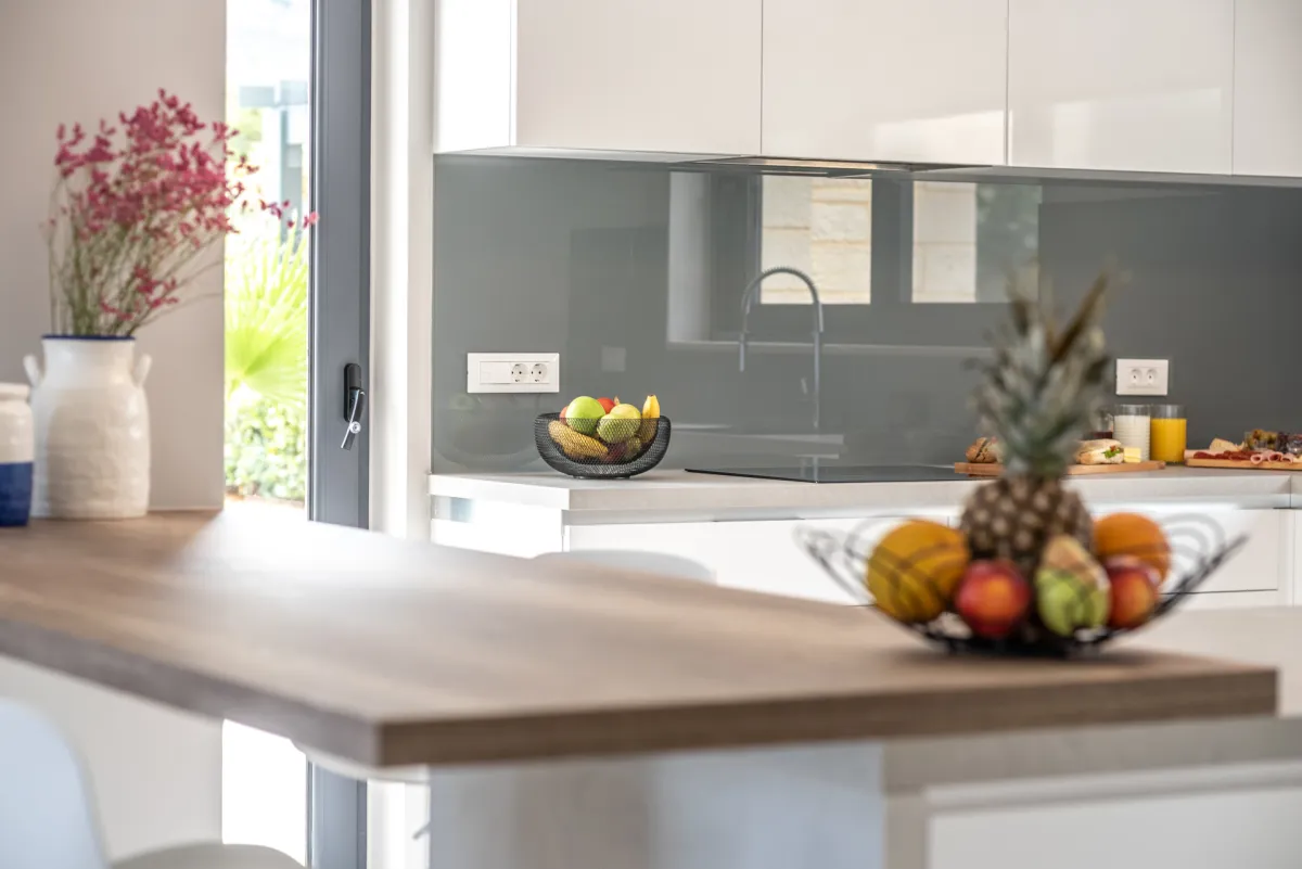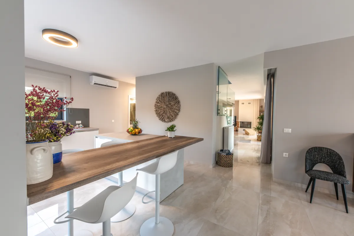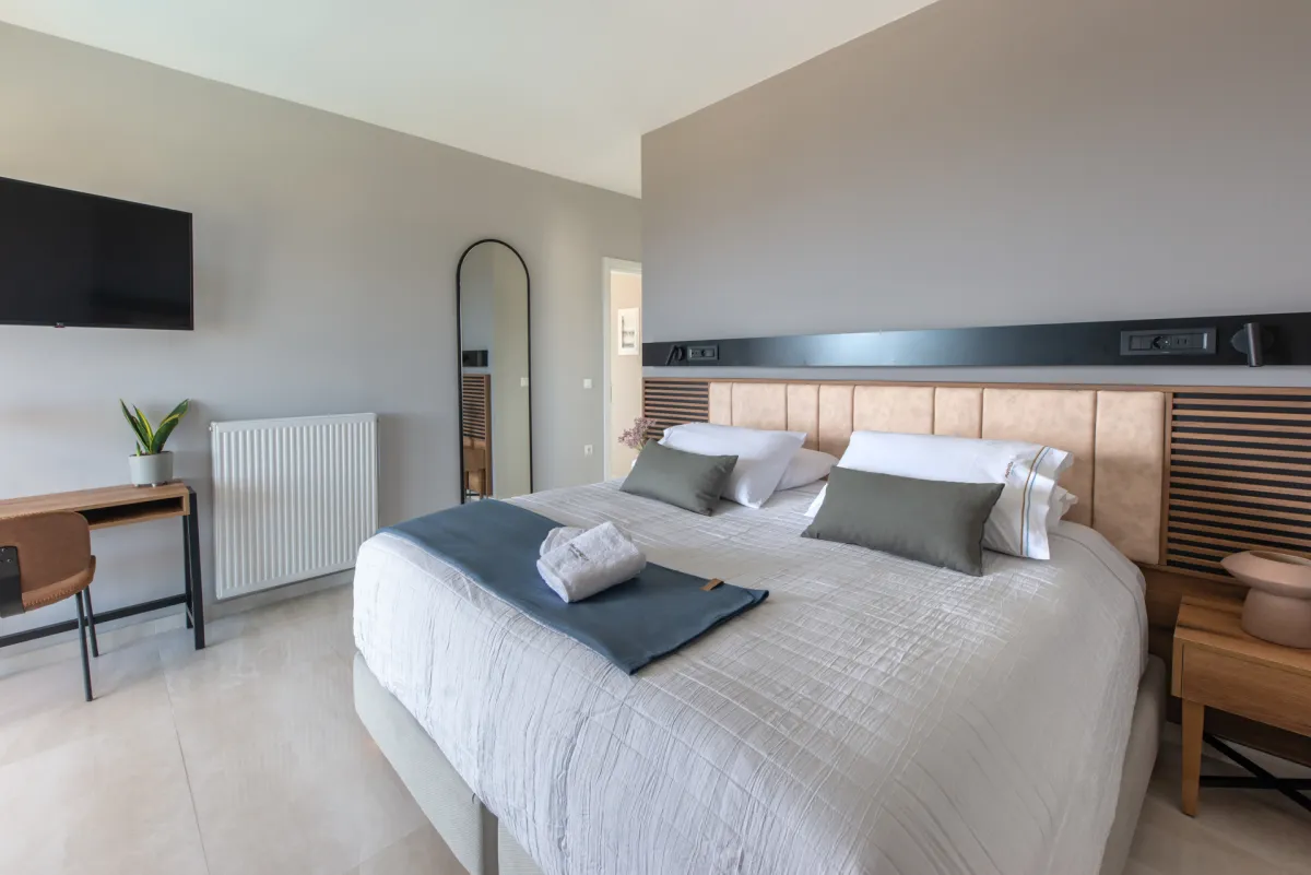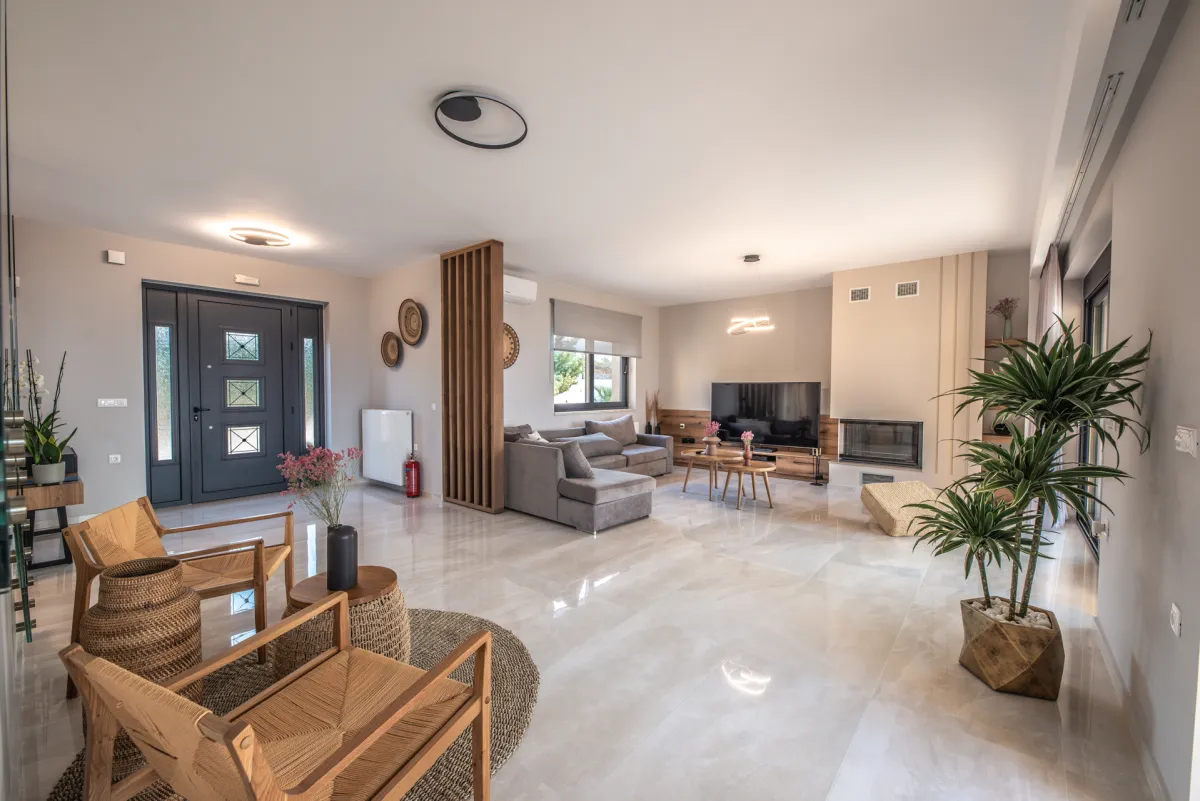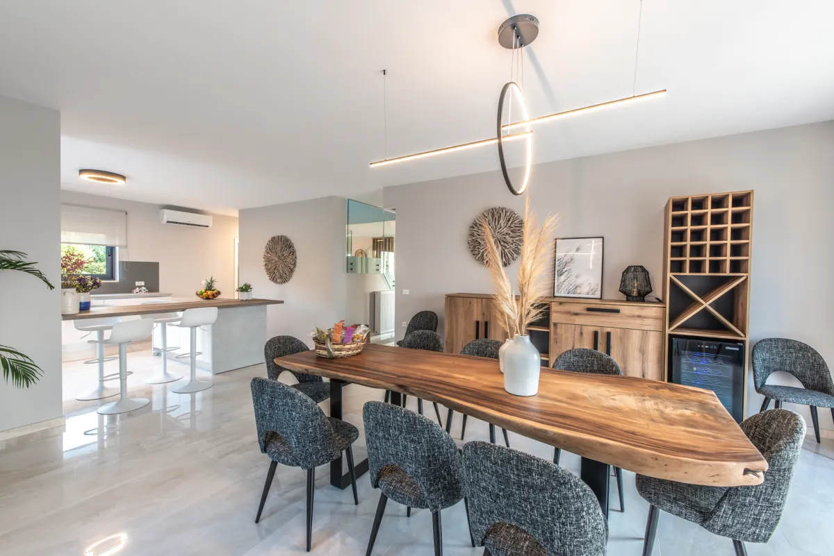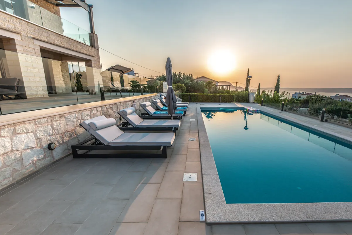 The beautiful Villa Marevista in Plaka, in the Apokoronas region on the northwest coast of Crete, is the ideal destination for a relaxing, carefree, and luxurious holiday in Greece. Sitting on a spacious 4,285 sq.m. plot, the secluded location of the luxury villa ensures privacy, yet there are many holiday attractions within easy reach of the rental property. The private luxury villa offers an elegant living area, stylishly furnished with a large corner sofa and a nesting coffee table as well as a smart TV with satellite. In addition, there are occasional chairs, a safe, a fireplace, air conditioning, and 24/7 concierge services available. The dining area is furnished with a stylish wooden table and 10 comfortable dining chairs. Villa Marevista is equipped with a stylish, modern kitchen with a built-in oven and smooth electric stovetop, a microwave, a refrigerator, as well as a Nespresso coffee machine, a blender, a toaster, and a kettle. Additionally, there is a breakfast counter with 4 chairs. The luxury villa is home to 3 double bedrooms, each with an ensuite bathroom and sea-facing balconies. The bedrooms are stylishly decorated and furnished with either double or twin beds (pushed together), bedside tables, a desk / vanity table, occasional chairs, a cushioned wall seat in one of the bedrooms, and ample wardrobe space. The ensuite bathrooms are equipped with showers, toilets, complimentary toiletries, towels, and hairdryers. Furthermore, there are amenities including a washing machine, iron, and ironing board provided. The impeccable outdoor area and endless gardens are also host to a large, heated swimming pool with a beautiful sea view. There is a verandah with a barbeque and dining area, with a large outdoor table and 10 chairs available for guests to use. There are comfortable sun-loungers and a shaded swing bench lining the pool, which is a beautiful crystal blue. This is an excellent area for entertaining friends or simply relaxing in the sun.The little ones will enjoy the playground with foosball, and a slide. This luxury holiday home offers private parking, and the property is fenced and has outside lighting for additional security. There are complimentary local activities offered to guests of Marevista Villa and every effort is made to ensure visitors enjoy the famous Cretan hospitality and an unforgettable vacation.