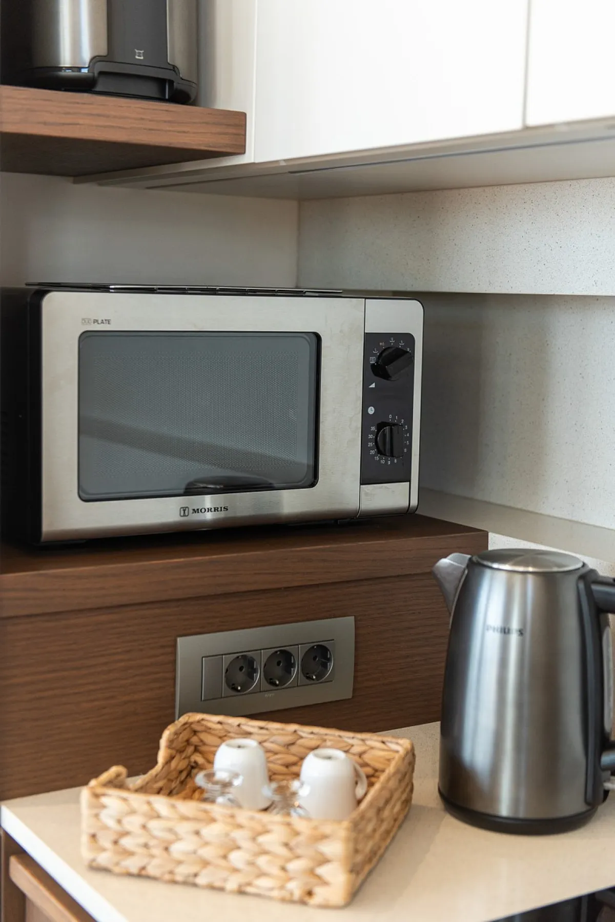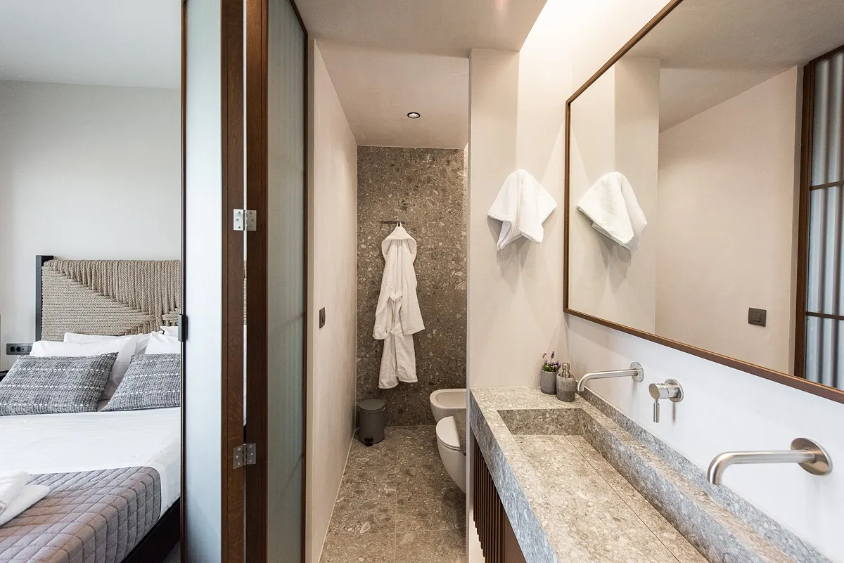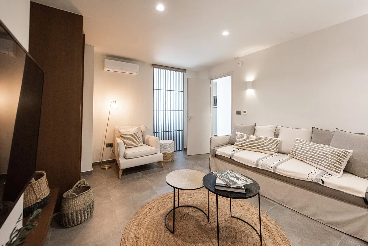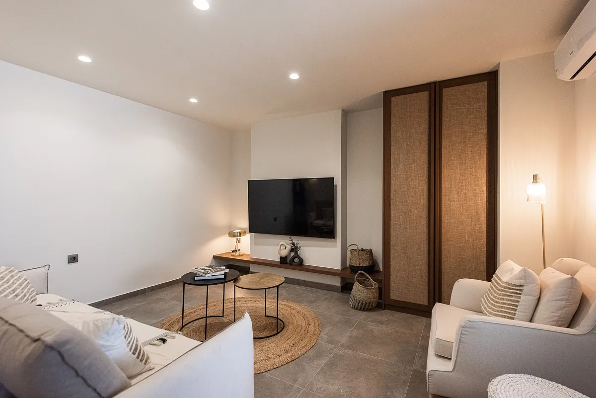 The Maviraa villa offers 3 double bedrooms with king-size beds, fitted wardrobes, hairdryers, safe boxes, and ensuite shower rooms. The 2 upstairs bedrooms have both private and shared balconies, and the downstairs bedroom has access to the pool and terrace. The rooms are all light and spacious with stylish décor and fine linens. Towels and toiletries are also provided. This luxury accommodation also boasts a cinema room with a sleeper sofa for 2 additional guests, as well as a guest WC.