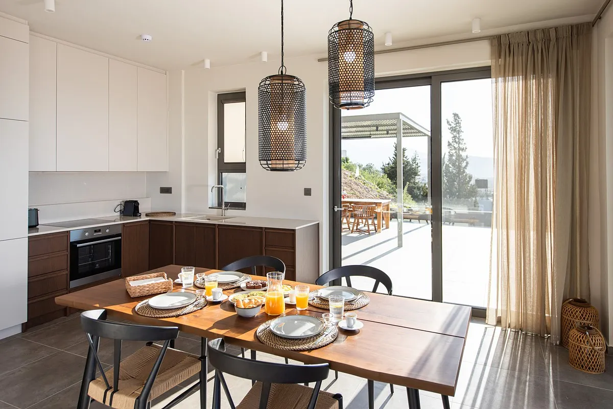 The Mavira luxury villa has a spacious open-plan living area featuring comfortable seating, a satellite TV, and a large dining suite. This relaxing space looks out over the swimming pool area and has magnificent views of the bay. The kitchen facilities are modern and feature all the required appliances and kitchenware.