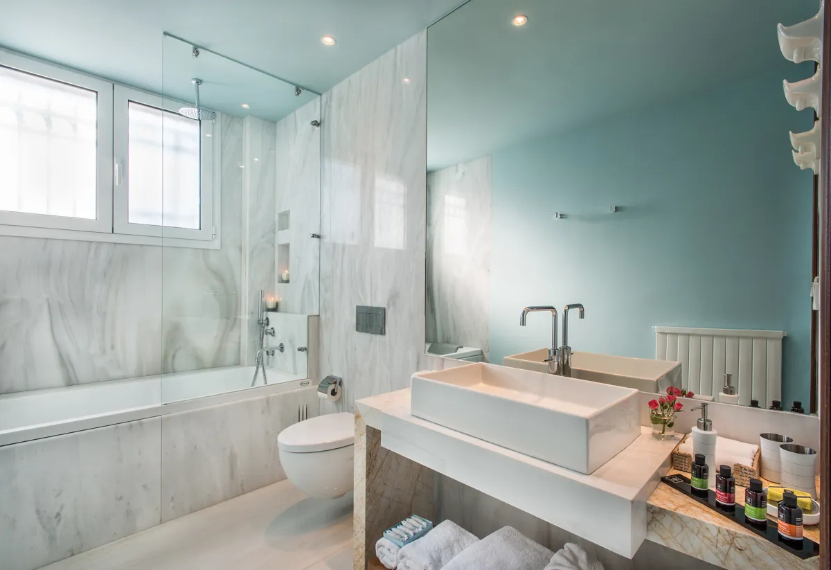 The villa has a living space of 500 sq. m. divided into two floors. Each floor is an independent unit, featuring their own living and dining areas, bathrooms, bedrooms and balconies / terraces. In total, there are 3 living areas, 7 bedrooms and 4 bathrooms that can accommodate up to 14 persons.