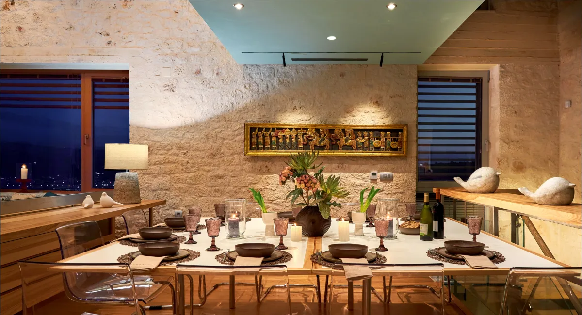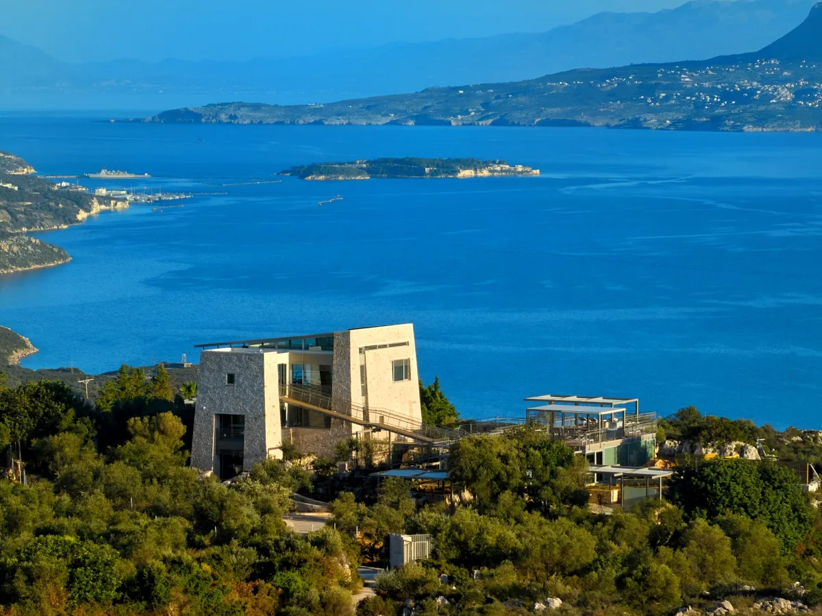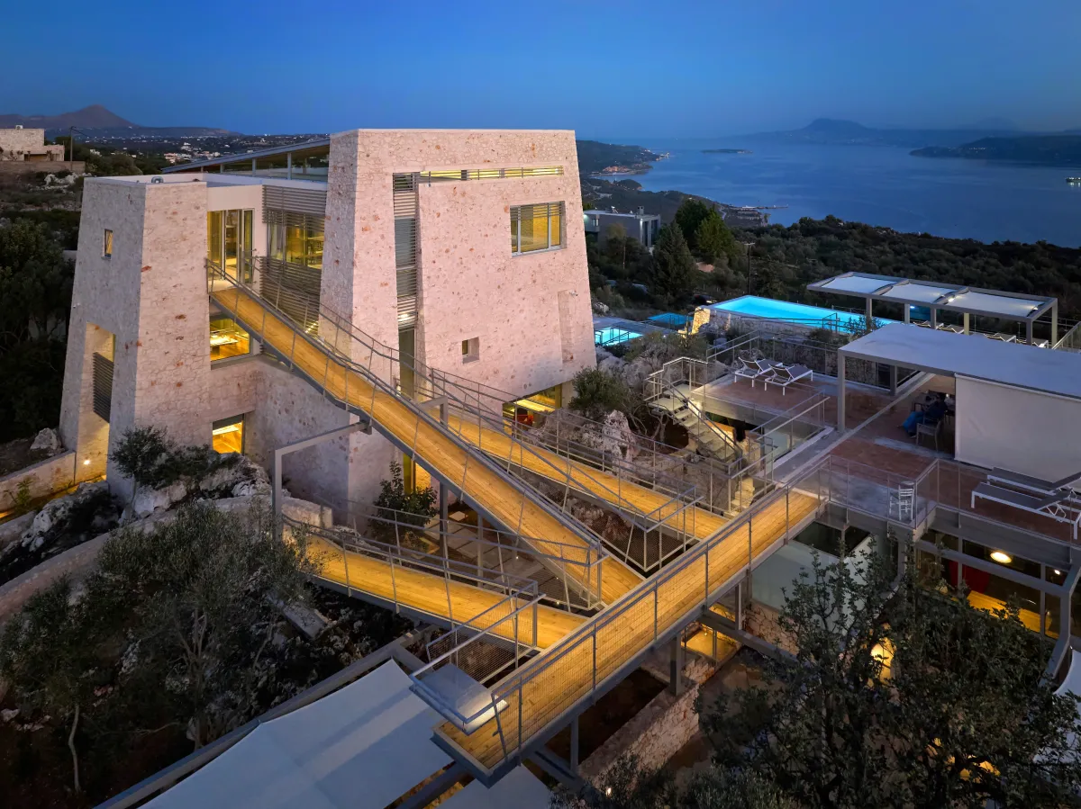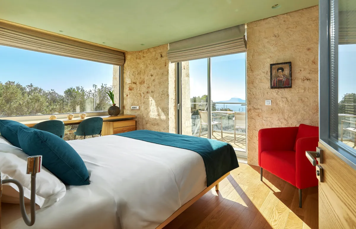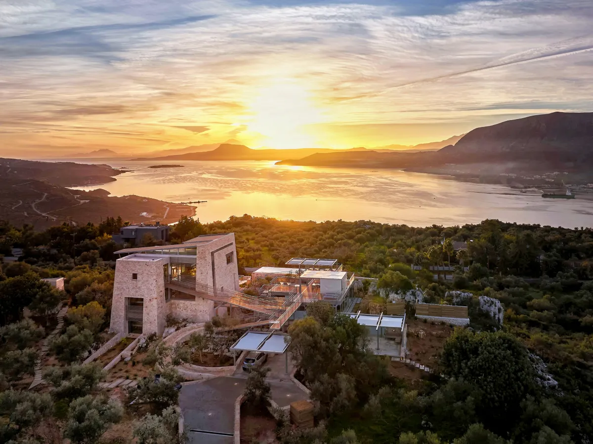 This Crete luxury villa complex is on the cliffs overlooking Souda Bay, between the Akrotiri peninsula and Cape Drapano. Its contemporary combination of stone, wood, glass, and metal creates a New York-Swedish charm, surrounded by a Cretan olive grove. Olives and Thyme Retreat can accommodate 12 guests in luxury and style.