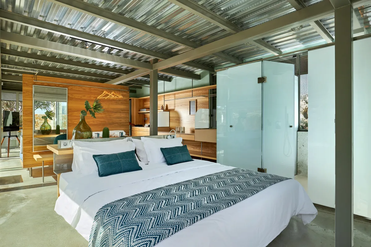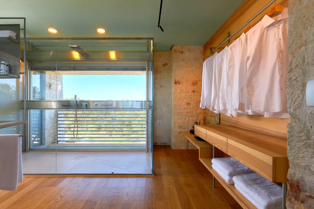 The Keep has four large bedrooms with king-size beds, walk-in showers and double sinks, open wardrobes and a few drawers, and a writing/book space. The two ground-floor bedrooms have access to the lap pool, and the two first-floor bedrooms have access to the infinity pool and leisure area. A feature of The Keep is the natural stream trickling through the ground-floor area.
