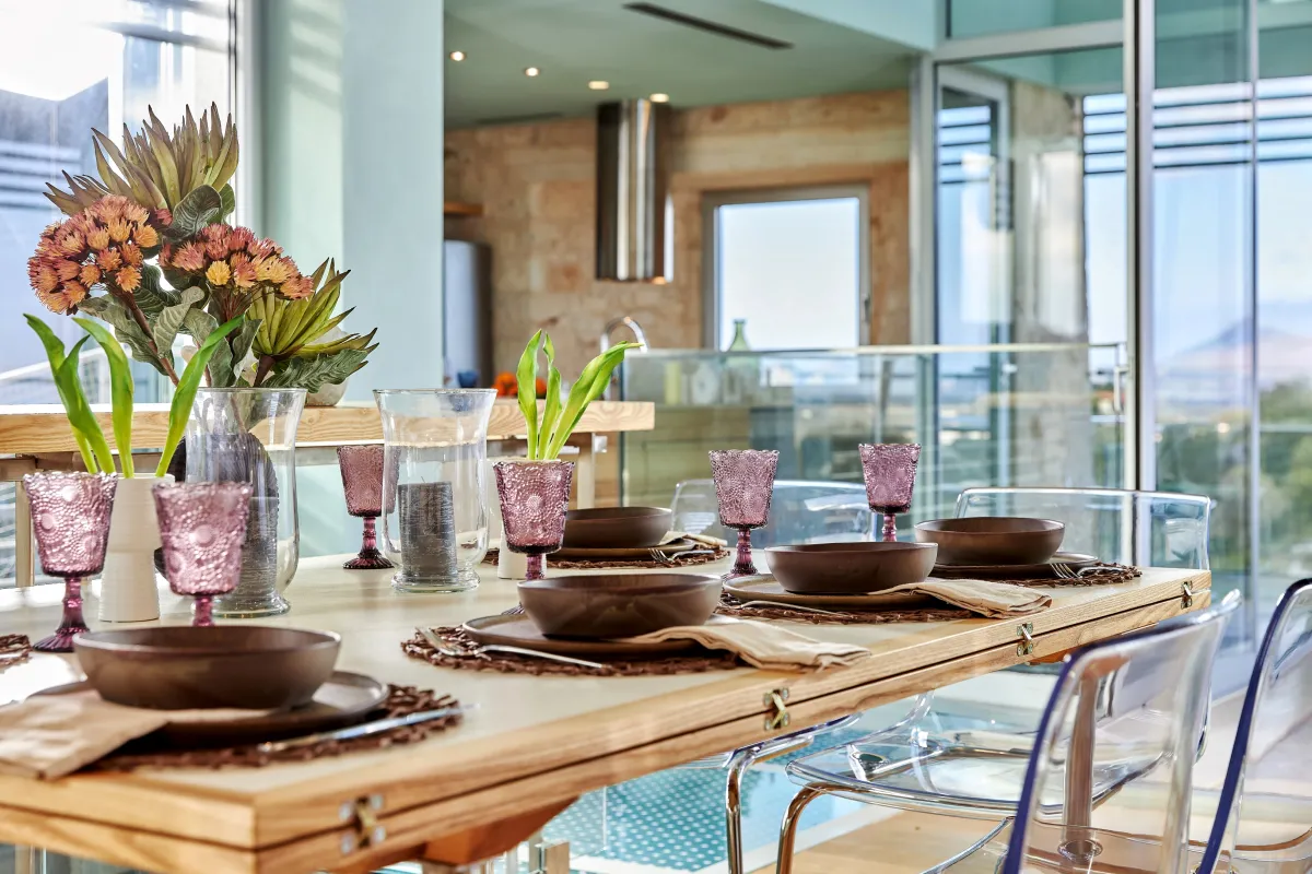 This is accompanied by the dining area, with a large table and ample seating for all guests. There is also a dining counter and stools for additional seating. The open-plan layout includes a well-fitted kitchen with all the required equipment and facilities for a culinary masterpiece and a well-kept coffee area. The living area is finished with a beautiful outside dining area on a majestic balcony.