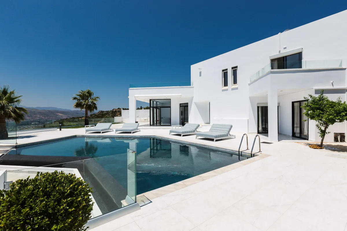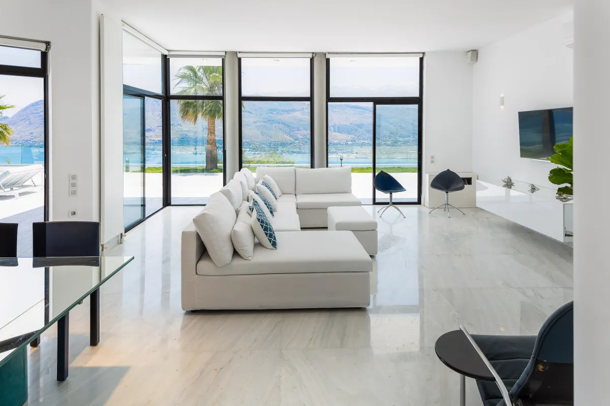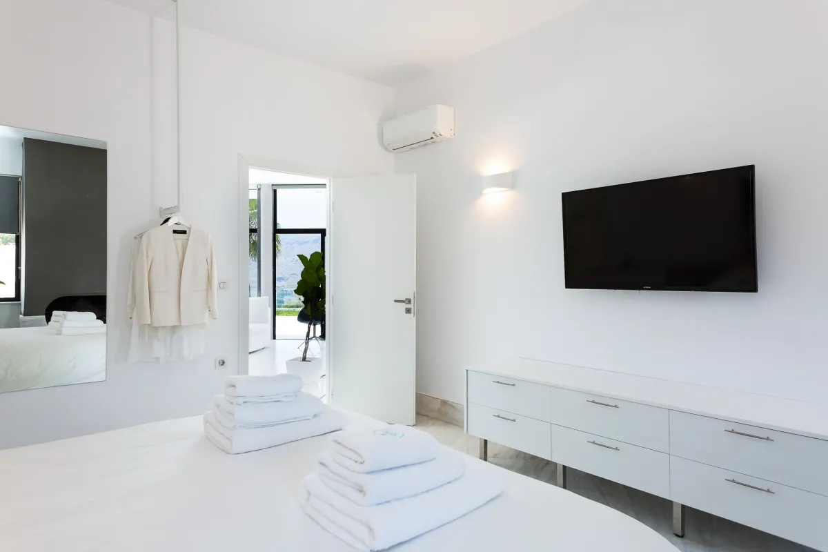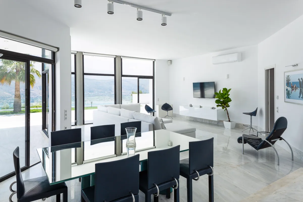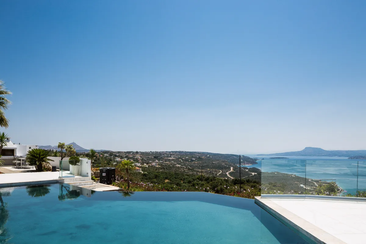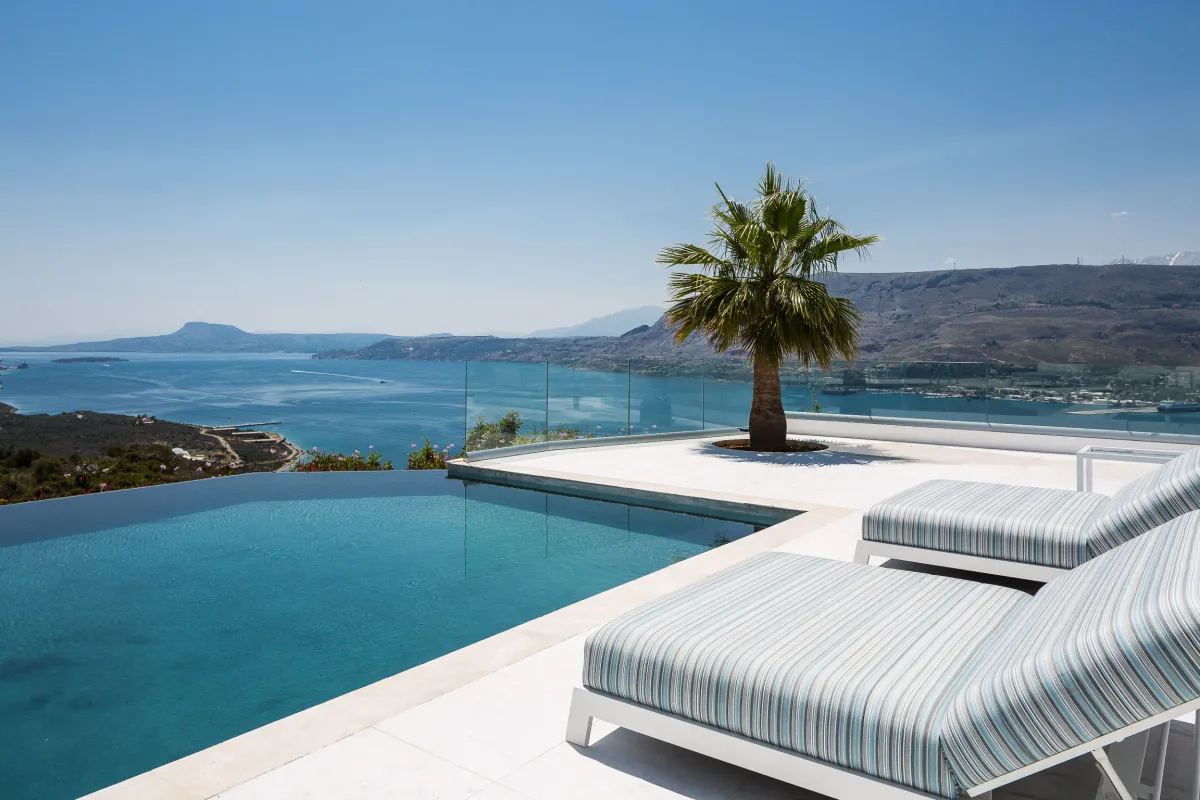 Epic & spectacular in every way vacation villa offering sensational blue sea and mountain vistas from the edge of a secluded hill-top with stylish finish, white interiors and sleek exterior spaces, also capable of hosting memorable wedding events. The concept was to design a pearly spacious luxury villa with exquisite architecture that create the feeling that guests are on board, facing the calm waters of the Souda Bay