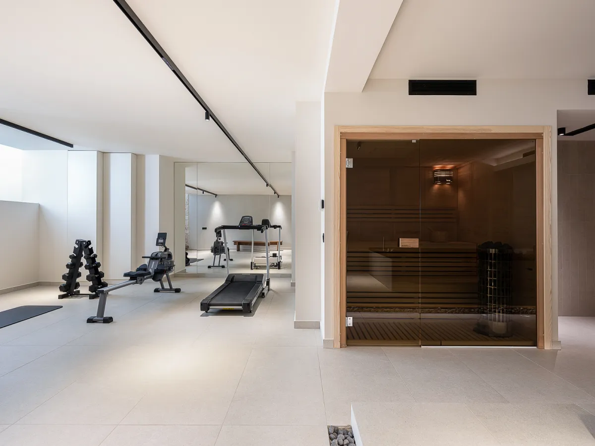 The fully equipped kitchen includes modern appliances such as a Nespresso machine, wine fridge, dishwasher, blender, and microwave, as well as thoughtful extras like a cheese grater, baking trays, cooking pots, and more. Adjacent to the kitchen, the elegant dining area creates the perfect setting for shared meals. Guests will also find a private gym and sauna/Jacuzzi area on the basement level – an inviting space for wellness and relaxation at any time of day.