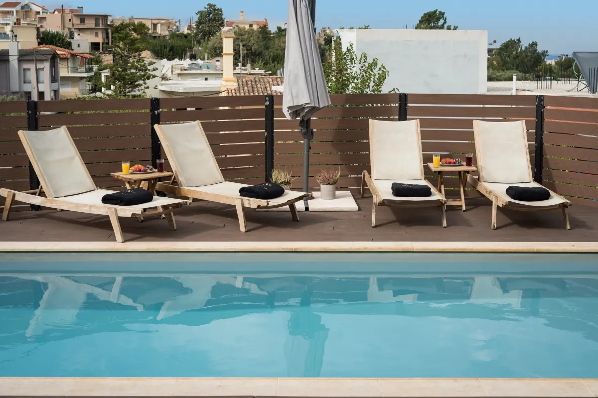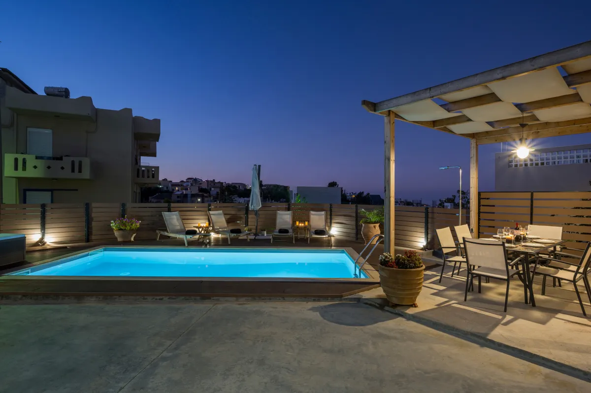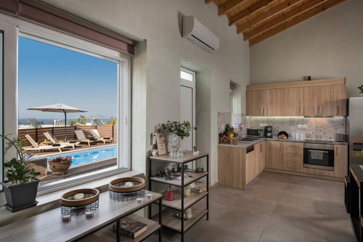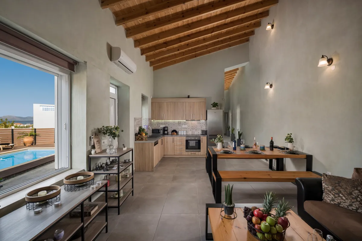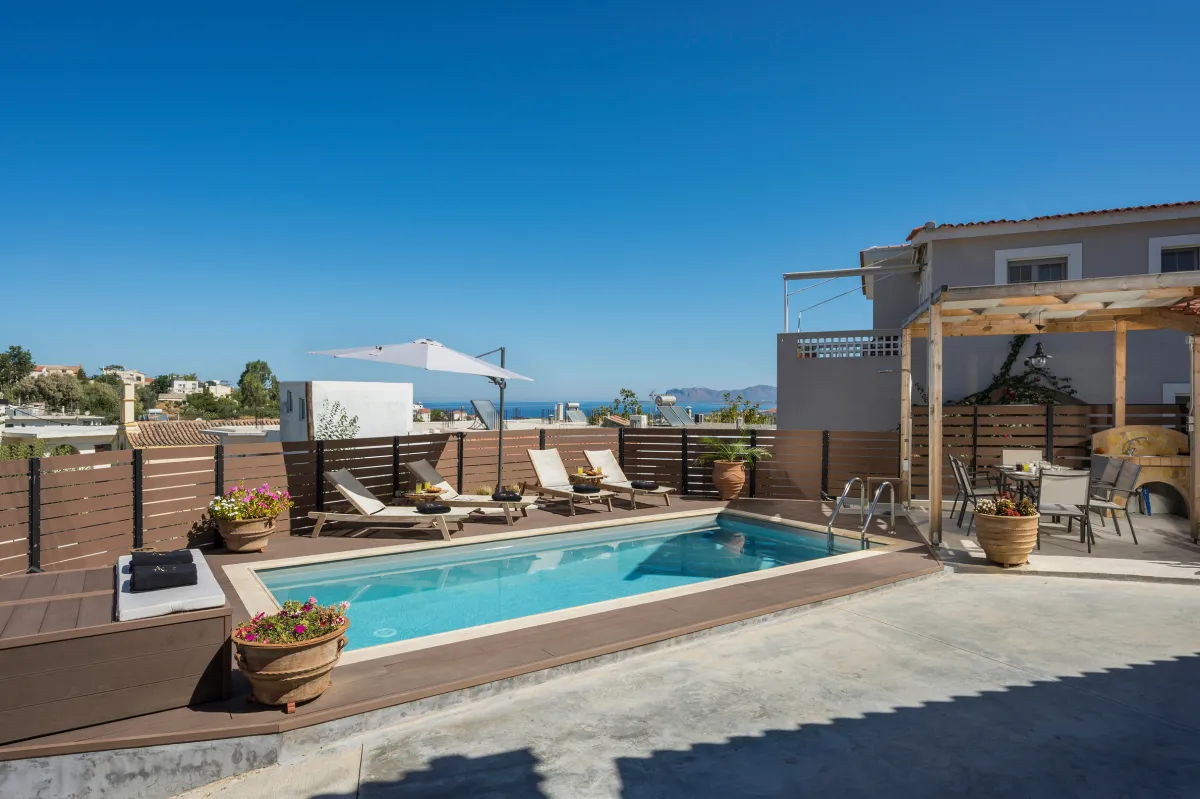 Villa Roxanne is a beautiful and extremely comfortable holiday villa benefits from three bedrooms decorated in contemporary Mediterranean style and a big veranda with exterior furniture and sunbeds to surround the private seasonal pool, ideal to accommodate 6 + 1 guests who wish to be near the center of Chania, but also a base for excursions to the Cretan beaches. Standing high above the street level in a quiet rural area, it provides its guests with nature noises and views over the beach of Kalamaki. This summer house is full of chic spaces decorated with a relaxing neutral backdrop, quality wooden furniture, and modern lighting, while the outdoors with sun loungers and umbrellas next to the pool offer a great spot to soak up the sun, as well as prepare a homemade meal in the BBQ facilities for the family or group of friends. The interior of the villa is light and the typically cozy modern ambience will make you feel right at home. During your stay at Roxanne Villa, you can spend your days in the sun splashing about in the lovely swimming pool and spend quality time while enjoying a drink or reading a book, or simply enjoying the environment. Good proximity to the sandy beach and resorts is also ideal for those who seek to take advantage of city life and beach parties.
