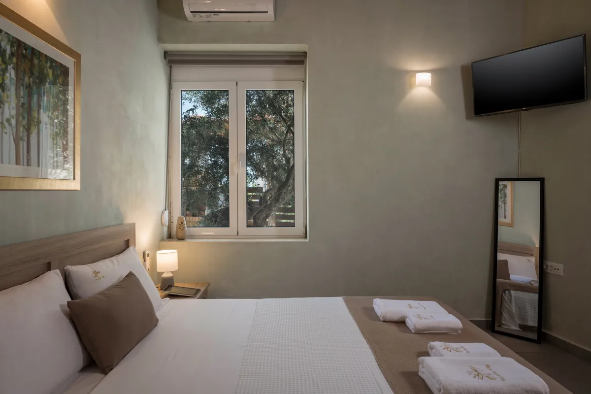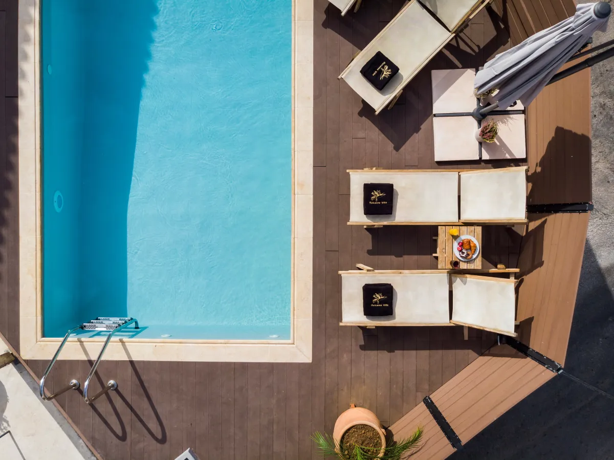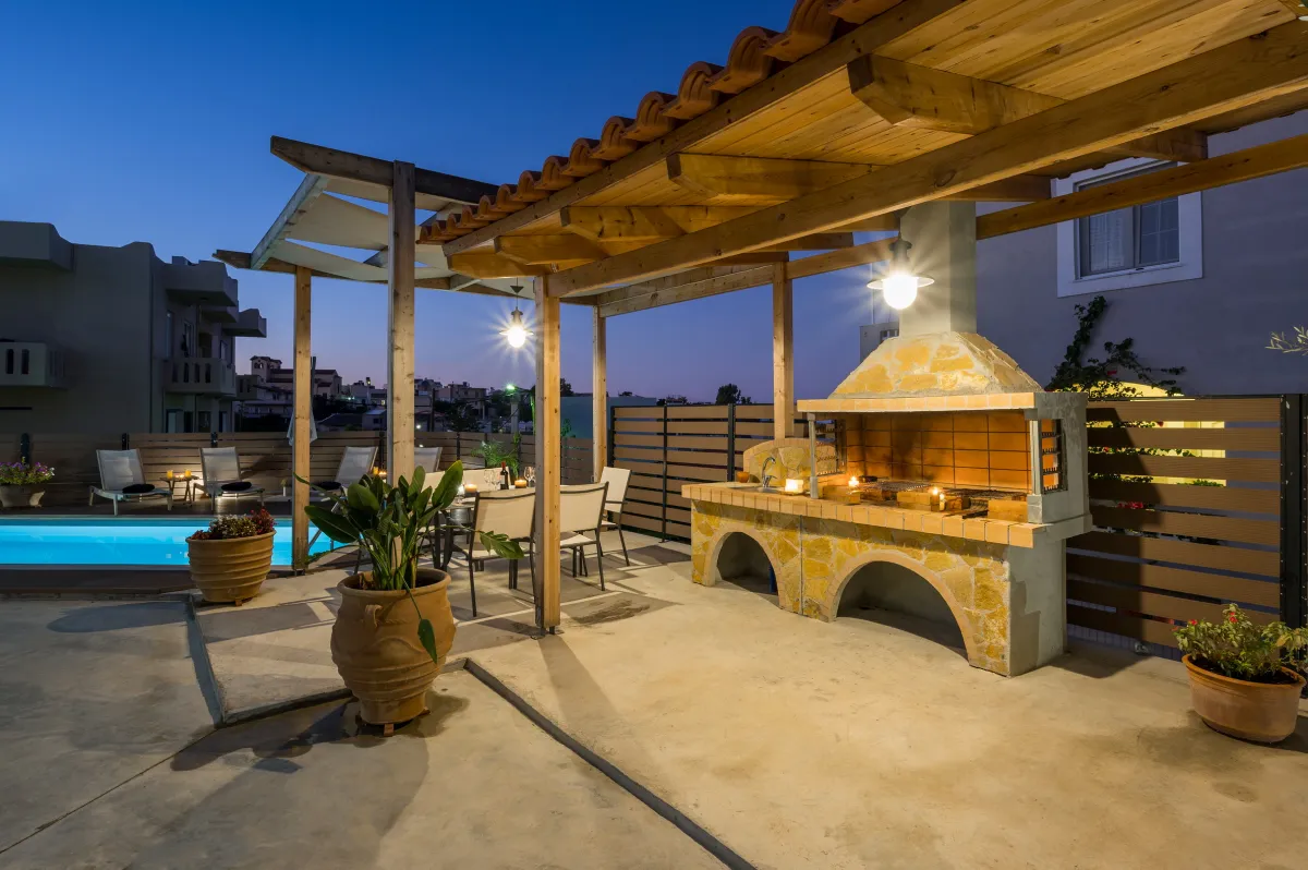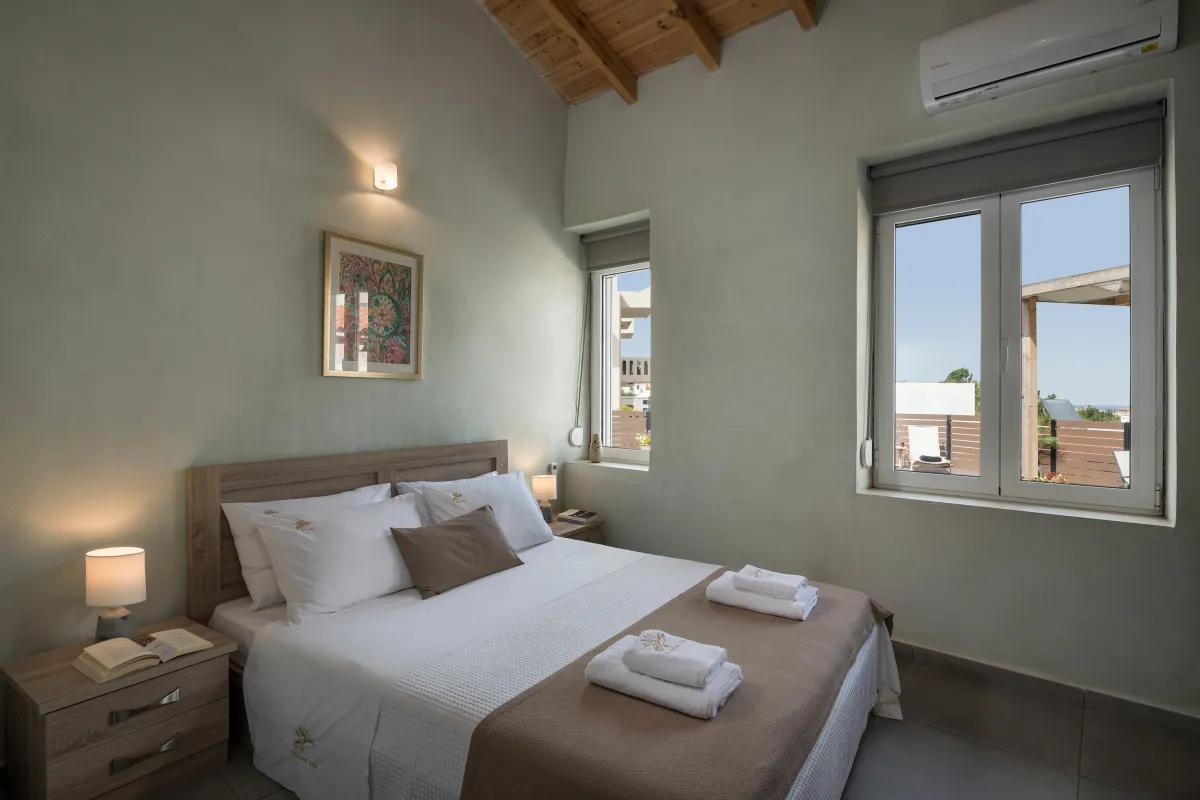 Villa Roxanne is a beautiful and extremely comfortable holiday villa benefits from three bedrooms decorated in contemporary Mediterranean style and a big veranda with exterior furniture and sunbeds to surround the private seasonal pool, ideal to accommodate 6 + 1 guests who wish to be near the center of Chania, but also a base for excursions to the Cretan beaches. Standing high above the street level in a quiet rural area, it provides its guests with nature noises and views over the beach of Kalamaki. This summer house is full of chic spaces decorated with a relaxing neutral backdrop, quality wooden furniture, and modern lighting, while the outdoors with sun loungers and umbrellas next to the pool offer a great spot to soak up the sun, as well as prepare a homemade meal in the BBQ facilities for the family or group of friends. The interior of the villa is light and the typically cozy modern ambience will make you feel right at home. During your stay at Roxanne Villa, you can spend your days in the sun splashing about in the lovely swimming pool and spend quality time while enjoying a drink or reading a book, or simply enjoying the environment. Good proximity to the sandy beach and resorts is also ideal for those who seek to take advantage of city life and beach parties.