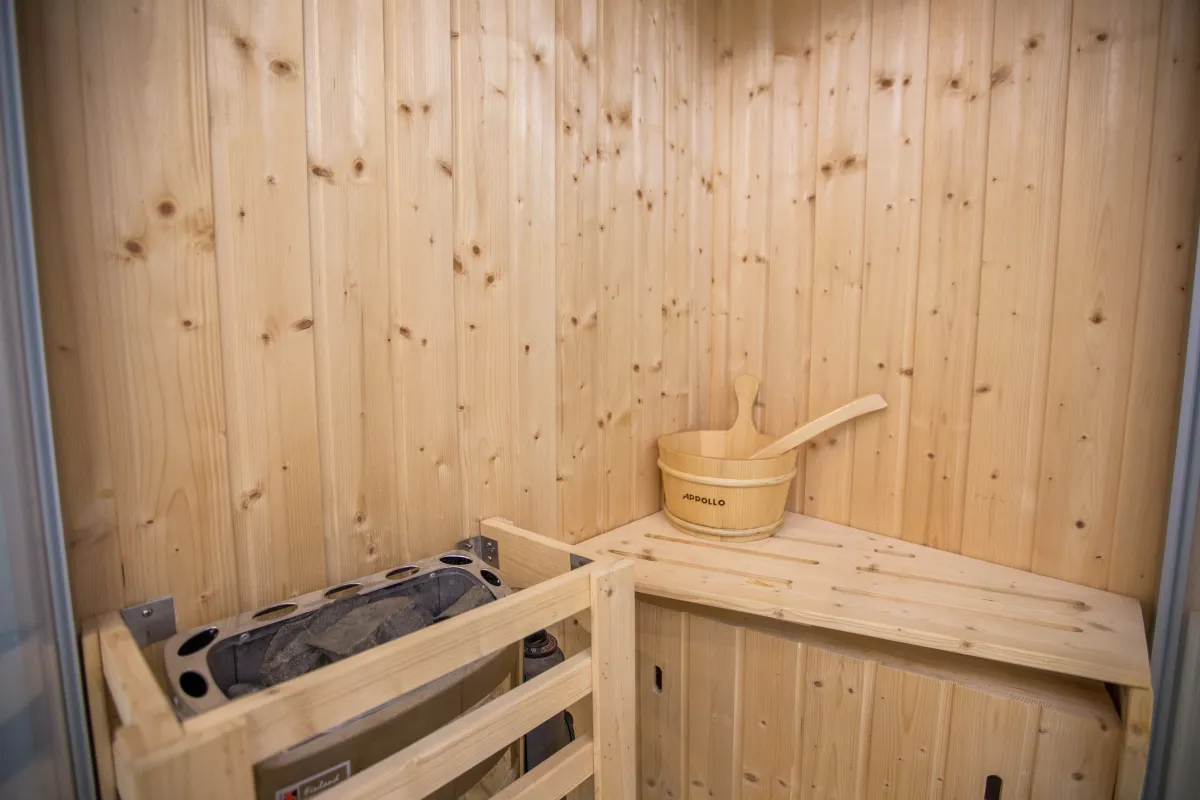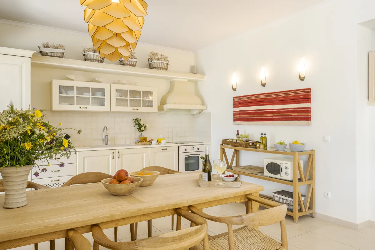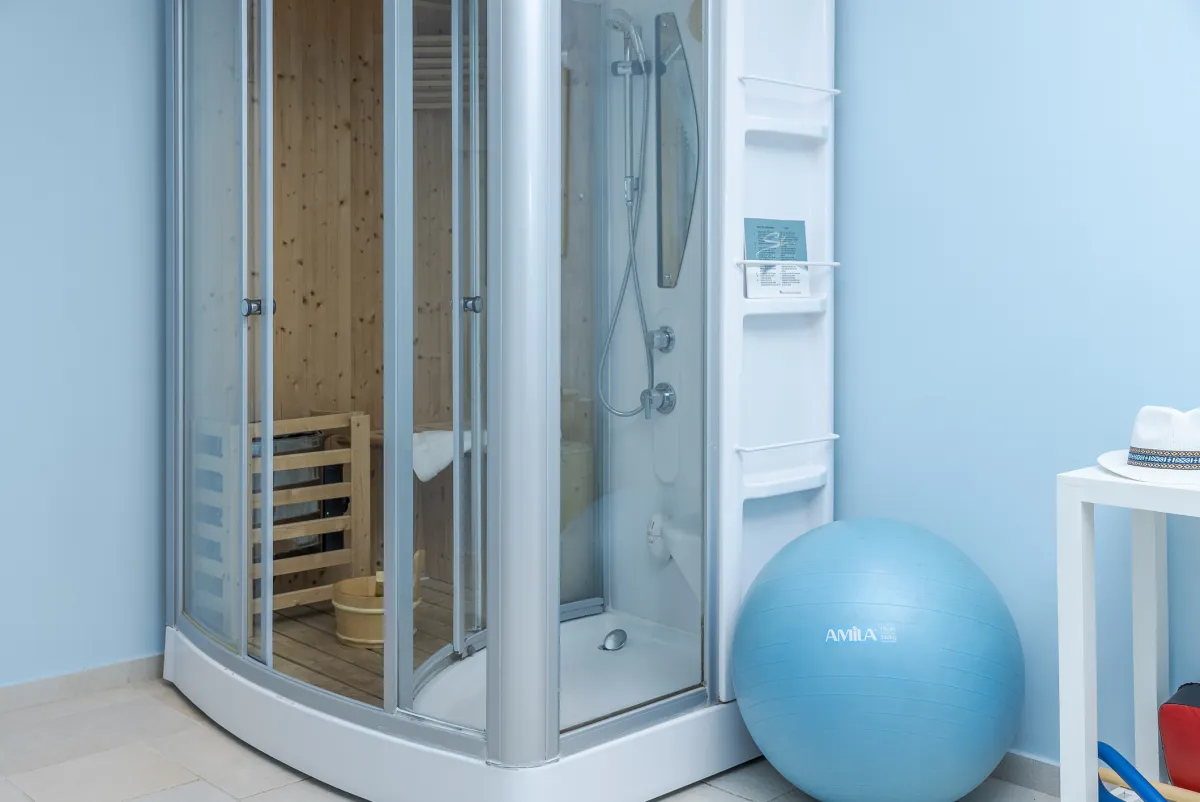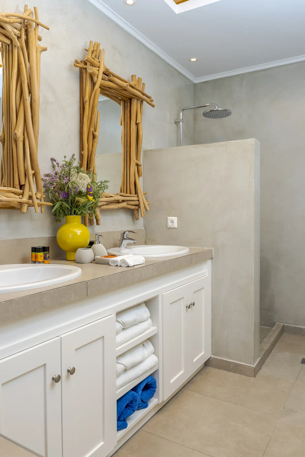 The first floor of the holiday villa has 2 bedrooms: a master suite with a king-size bed, an ensuite bathroom with beautiful views, and a separate shower and Jacuzzi; the second bedroom has twin beds that can be combined and a large ensuite bathroom. Both rooms have balconies accessed by sliding glass doors. The holiday villa’s third bedroom is on the lower ground floor and has twin beds and ample wardrobe space. Sliding glass doors open onto a private courtyard garden, which leads to the swimming pool terrace. There is also a large wellness area with a sauna and hammam.
