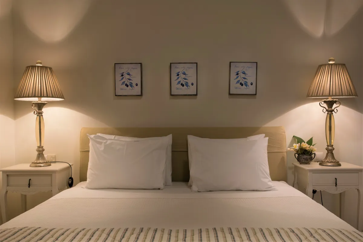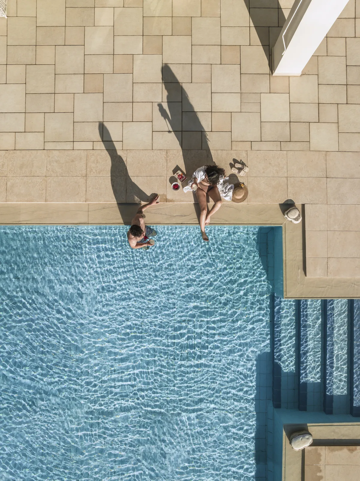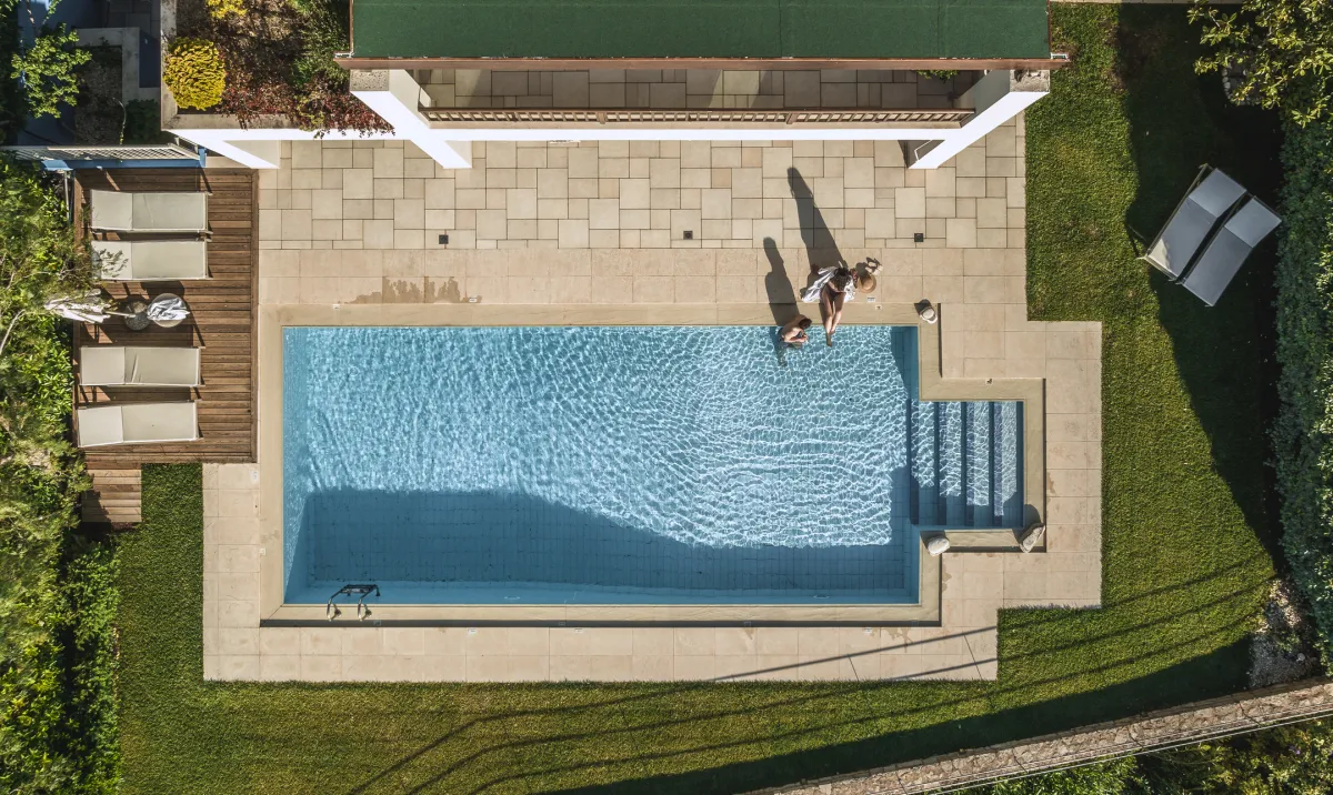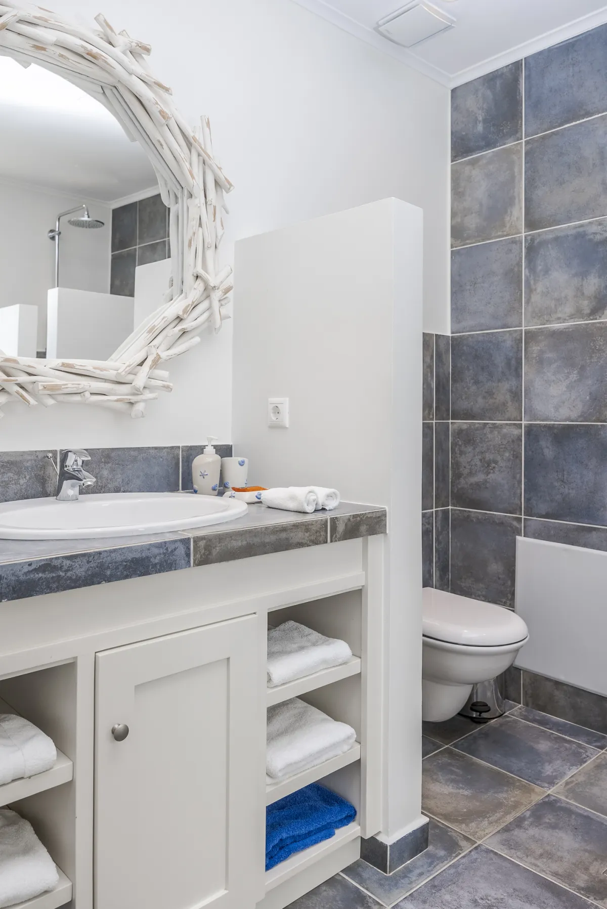 The first floor of the holiday villa has 2 bedrooms: a master suite with a king-size bed, an ensuite bathroom with beautiful views, and a separate shower and Jacuzzi; the second bedroom has twin beds that can be combined and a large ensuite bathroom. Both rooms have balconies accessed by sliding glass doors. The holiday villa’s third bedroom is on the lower ground floor and has twin beds and ample wardrobe space. Sliding glass doors open onto a private courtyard garden, which leads to the swimming pool terrace. There is also a large wellness area with a sauna and hammam.