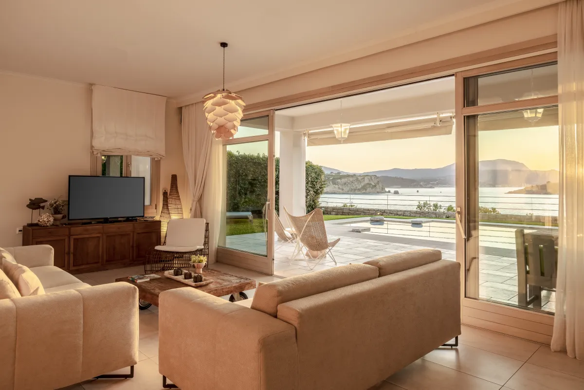 The spacious open-plan living area on the ground floor of this holiday rental is laid out with trendy, relaxed seating and is warmed by an inviting fireplace. The dining area of the luxury villa seats 8 guests, while the fully equipped kitchen area has all the necessary appliances including an oven, ceramic top cooker, toaster, kettle, coffee machine, dishwasher, fridge, and freezer. Glass sliding doors present an impressive view of the sea and mountains.