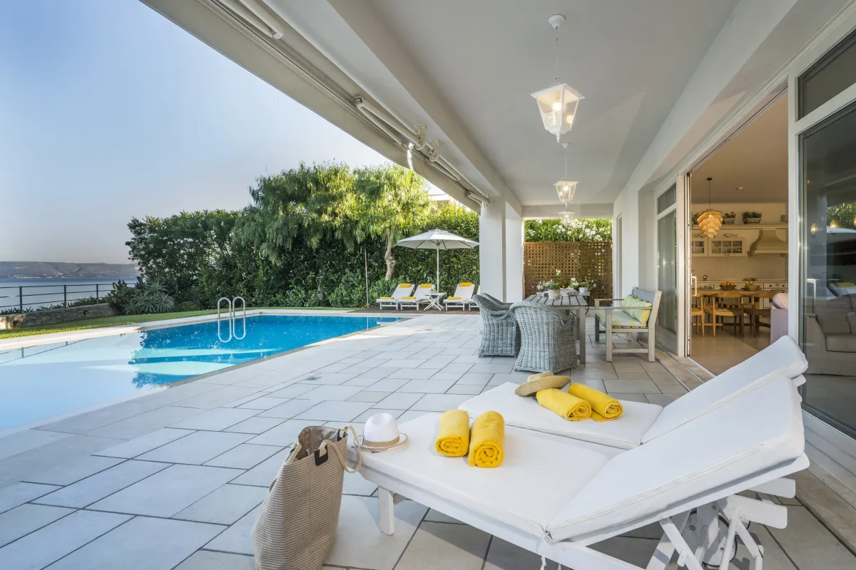 On the resort island of Crete, the luxurious Ammos Villa is set between the Aegean Sea and the White Mountains, a picturesque holiday destination. The tranquil surroundings and spacious design make this luxury holiday villa ideal for couples and groups of friends.