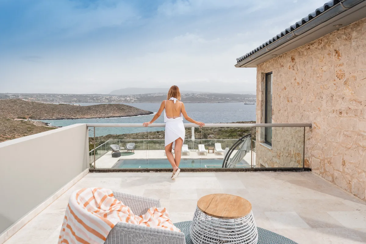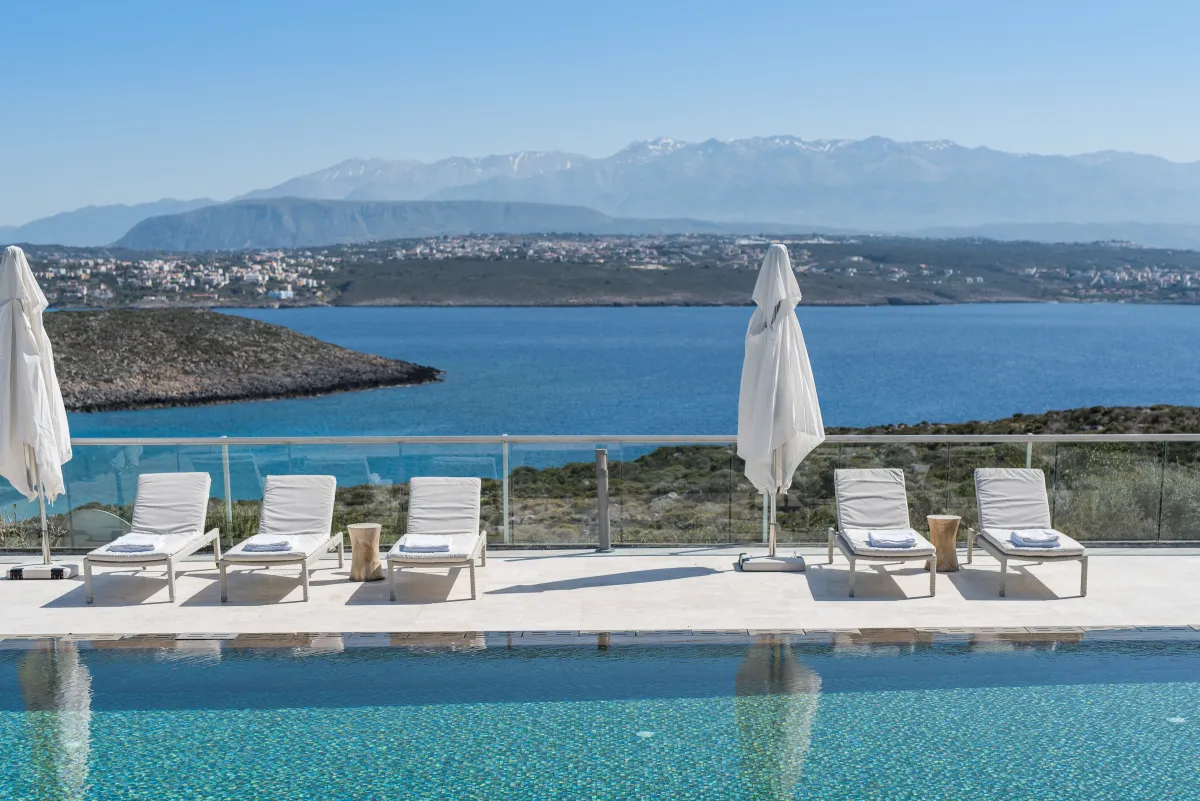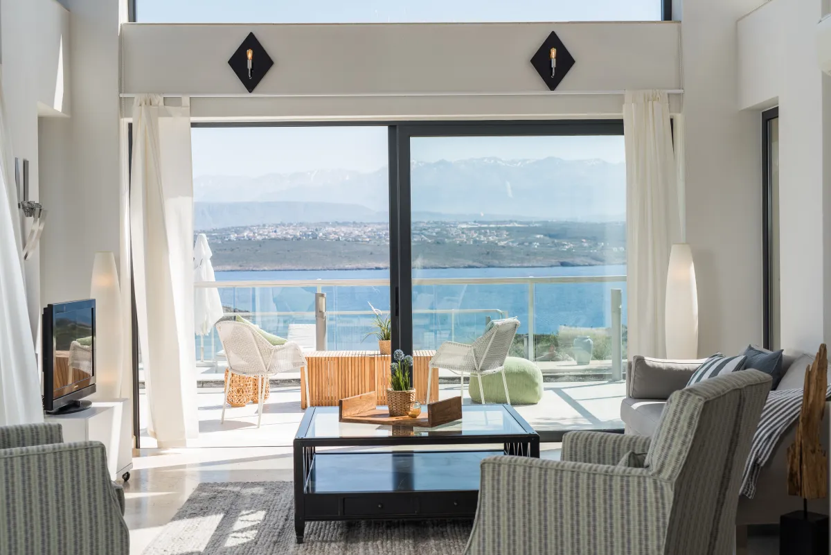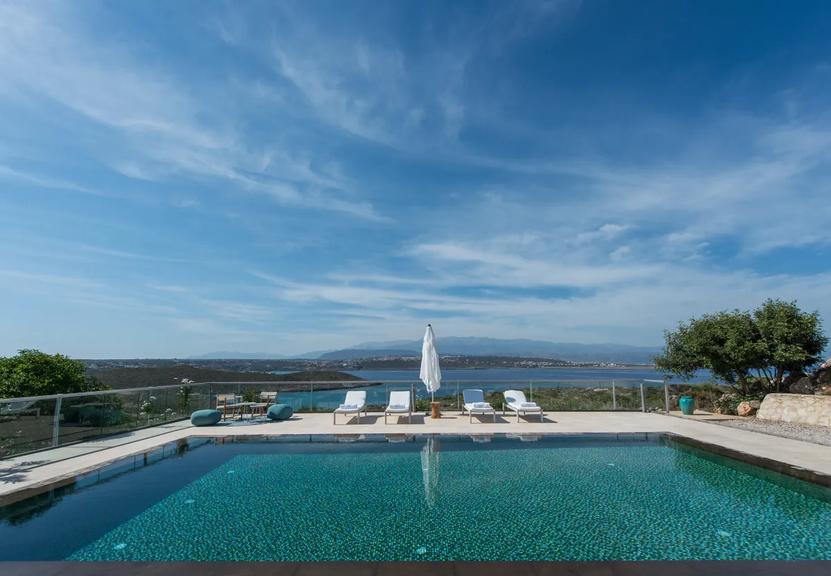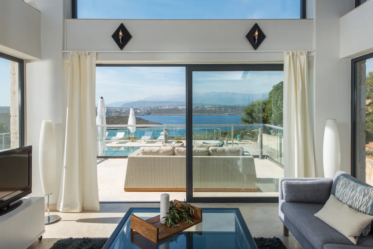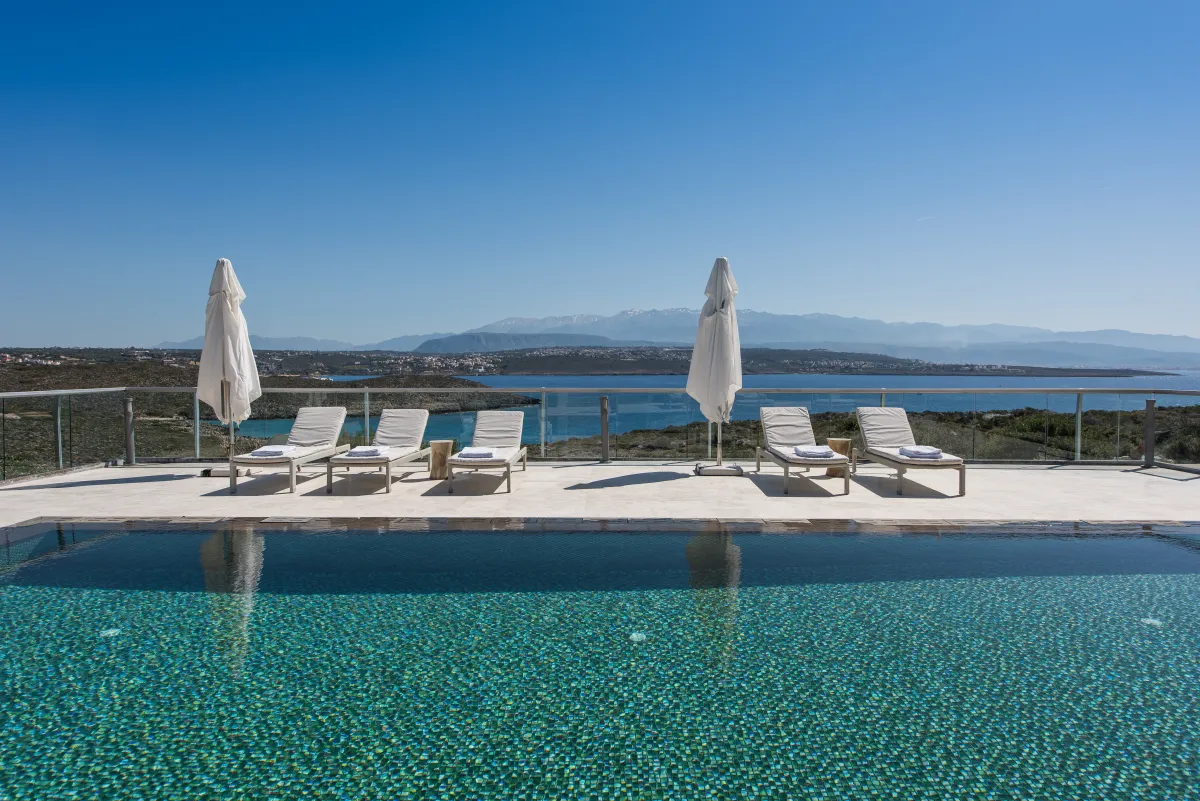 The Sea Crete Villas form a luxury villa complex in Crete, Greece. Formerly known as Divine Villas, these Crete vacation villas are on the Akrotiri Peninsula in the popular resort area of Chania, in the seaside village of Kalathas. The property is secluded and peaceful, making it the ideal location for a relaxing holiday with family and friends. Seafront 2 is the most isolated of the 4 villas, ensuring peace and quiet for weary holidaymakers.